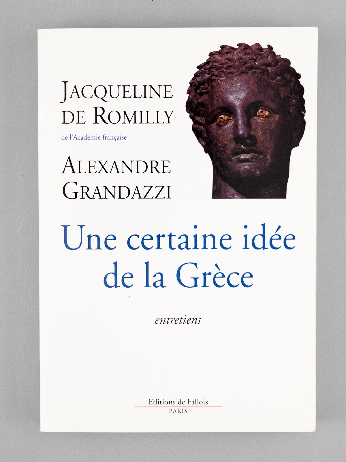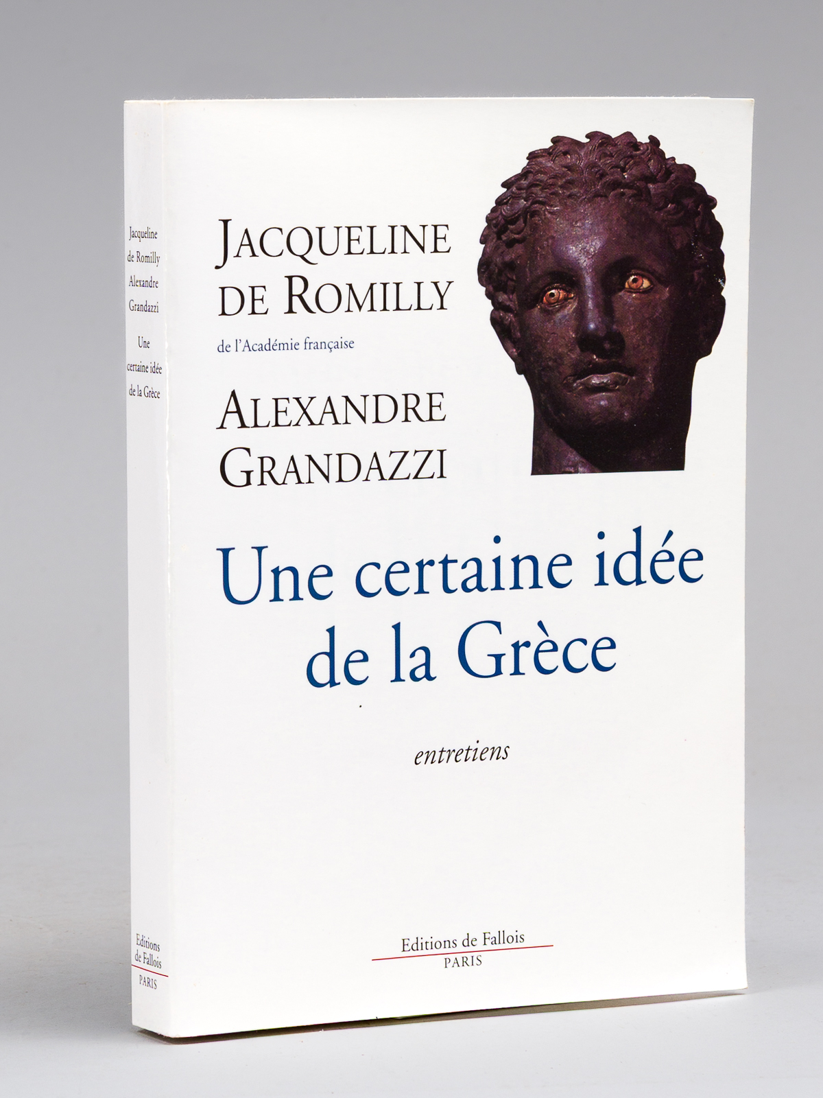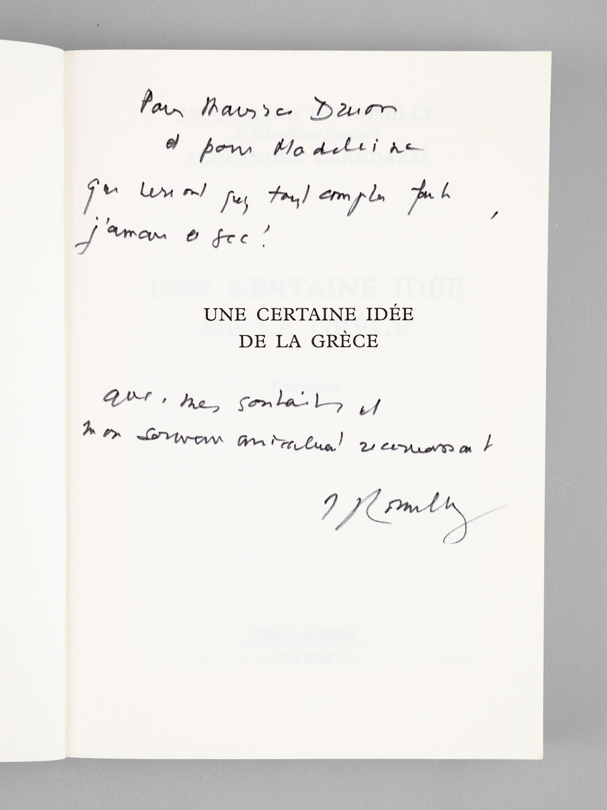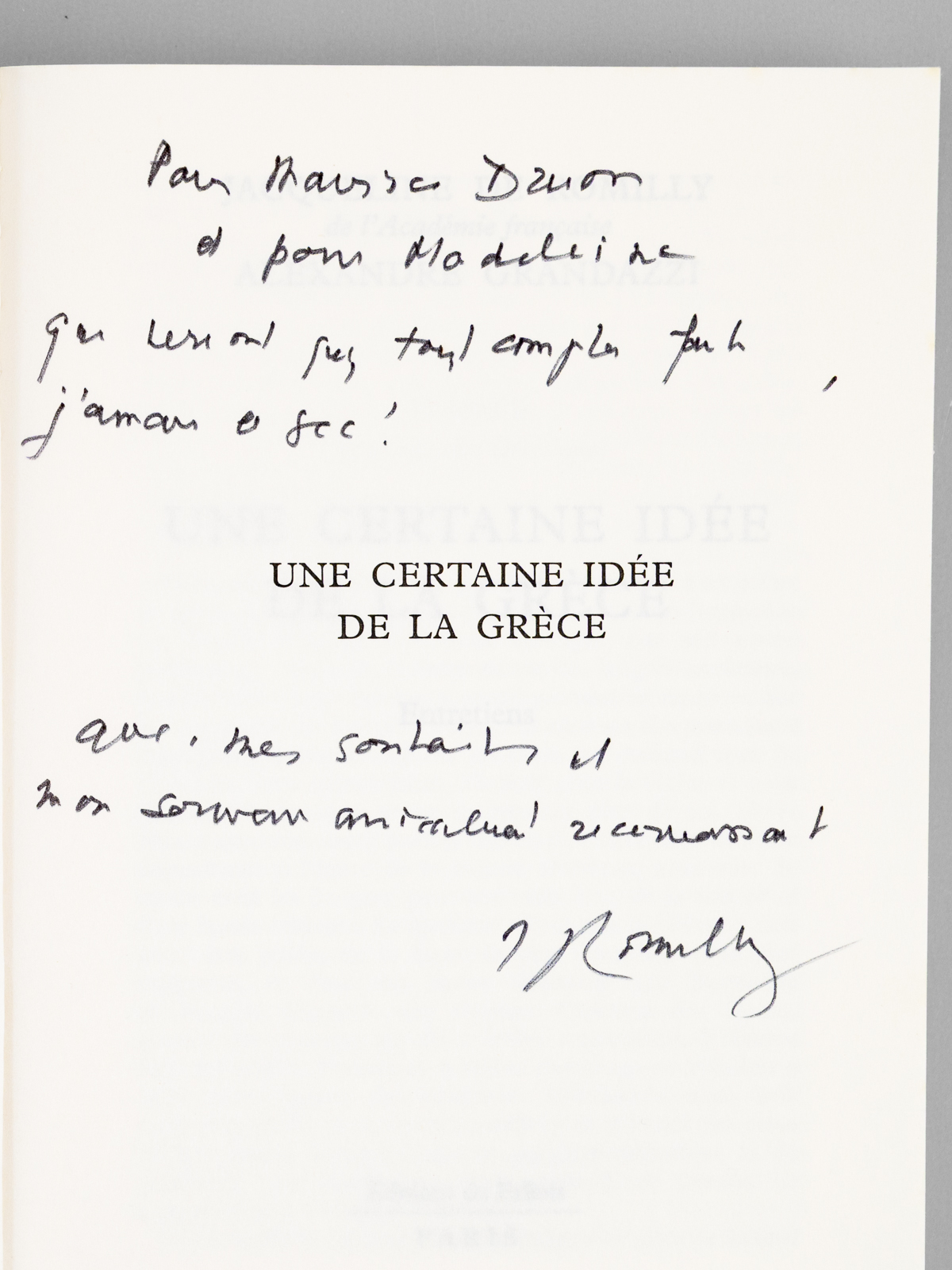 Envoi ms. de l'auteur, 1 vol. in-8 br., Editions de Fallois, Paris, 2003, 266 pp. Commentaire : Bel envoi de l'auteur à l'académicien Maurice Druon et à son épouse : 'Pour Maurice Druon et pour Madeleine, qui verront que tout compte fait, j'aimais le Grec. Avec mes souhaits et mon souvenir amicalement reconnaissant.' Maurice Druon (1918-2009), auteur notamment de la célèbre saga historique des Rois maudits, fut élu à l'Académie Française en 1968. Il en devint le Secrétaire Perpétuel, de 1985 à 1999. Jacqueline de Romilly, quant à elle, fut élue à l'Académie Française en 1988. Bon état pour cet exemplaire, d'une origine prestigieuse.