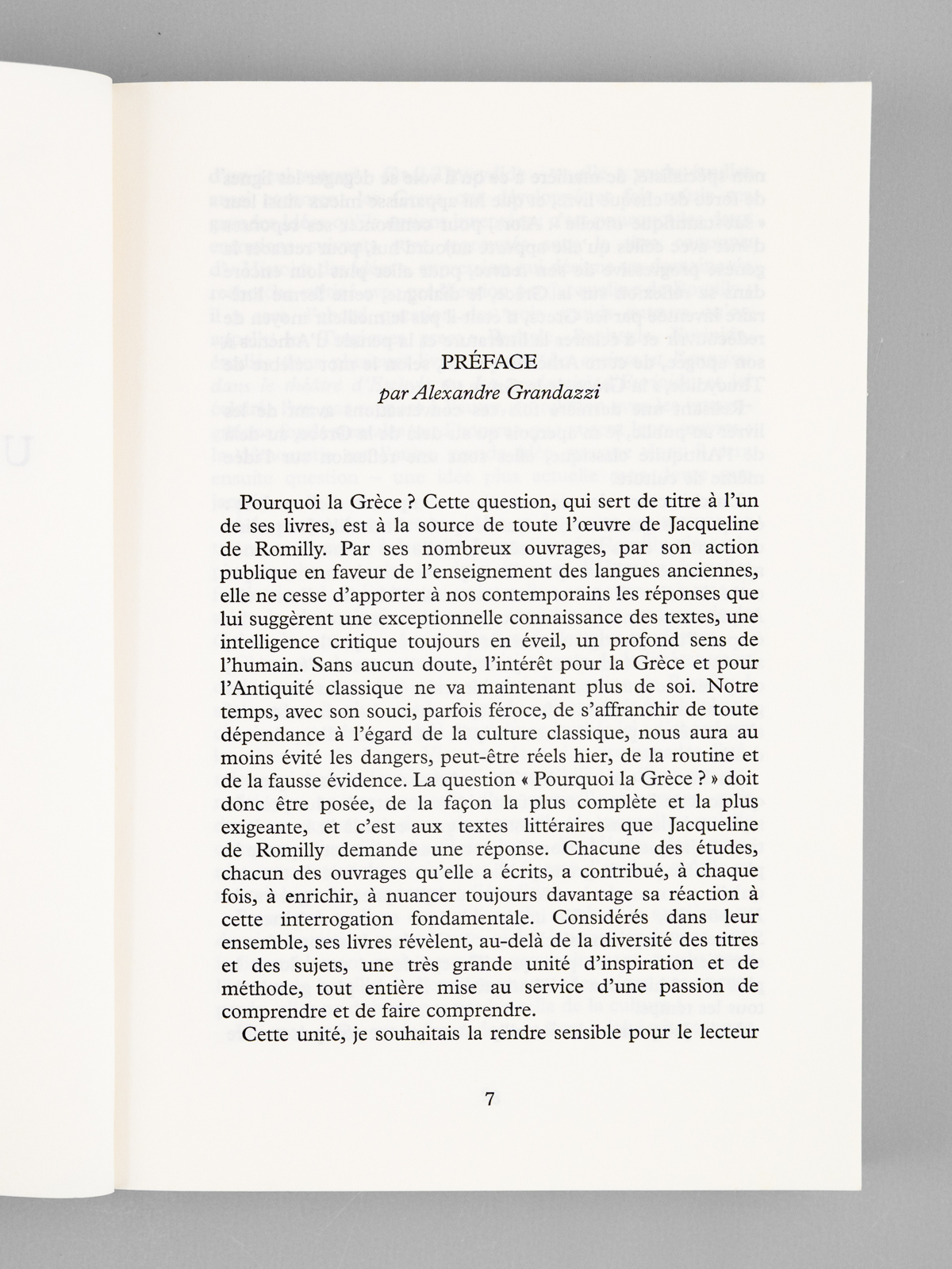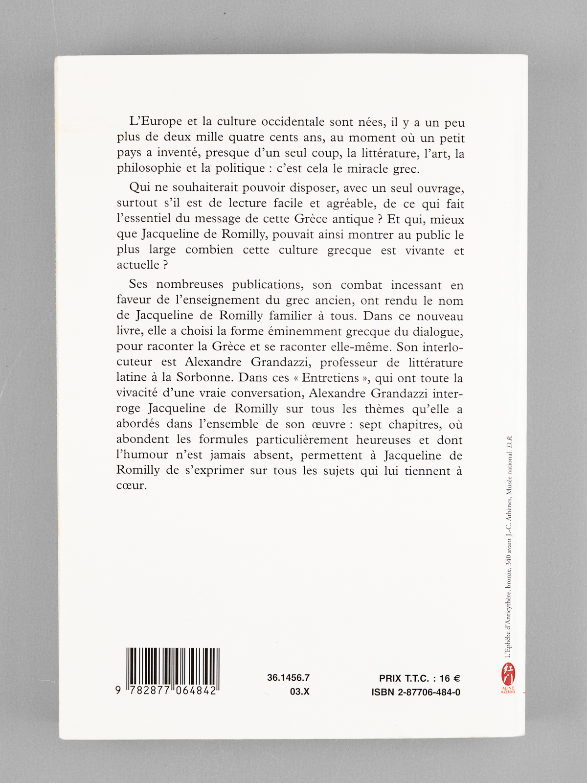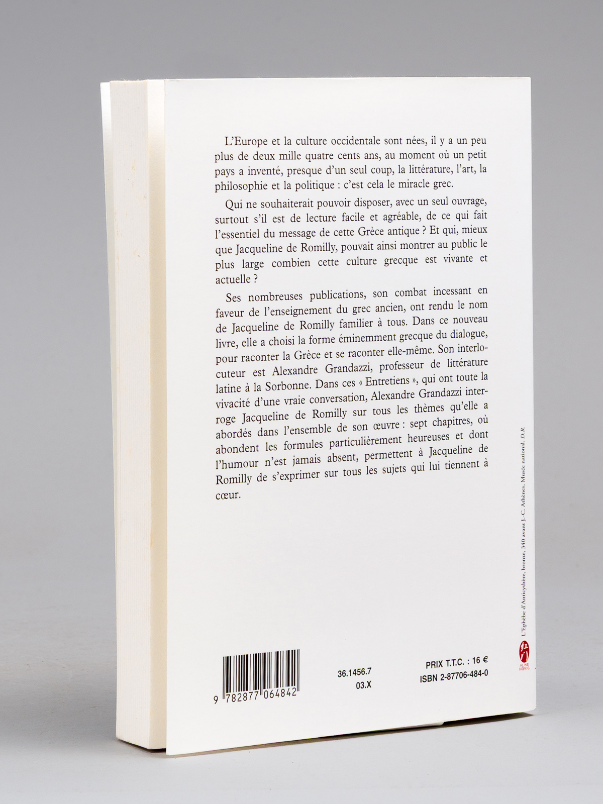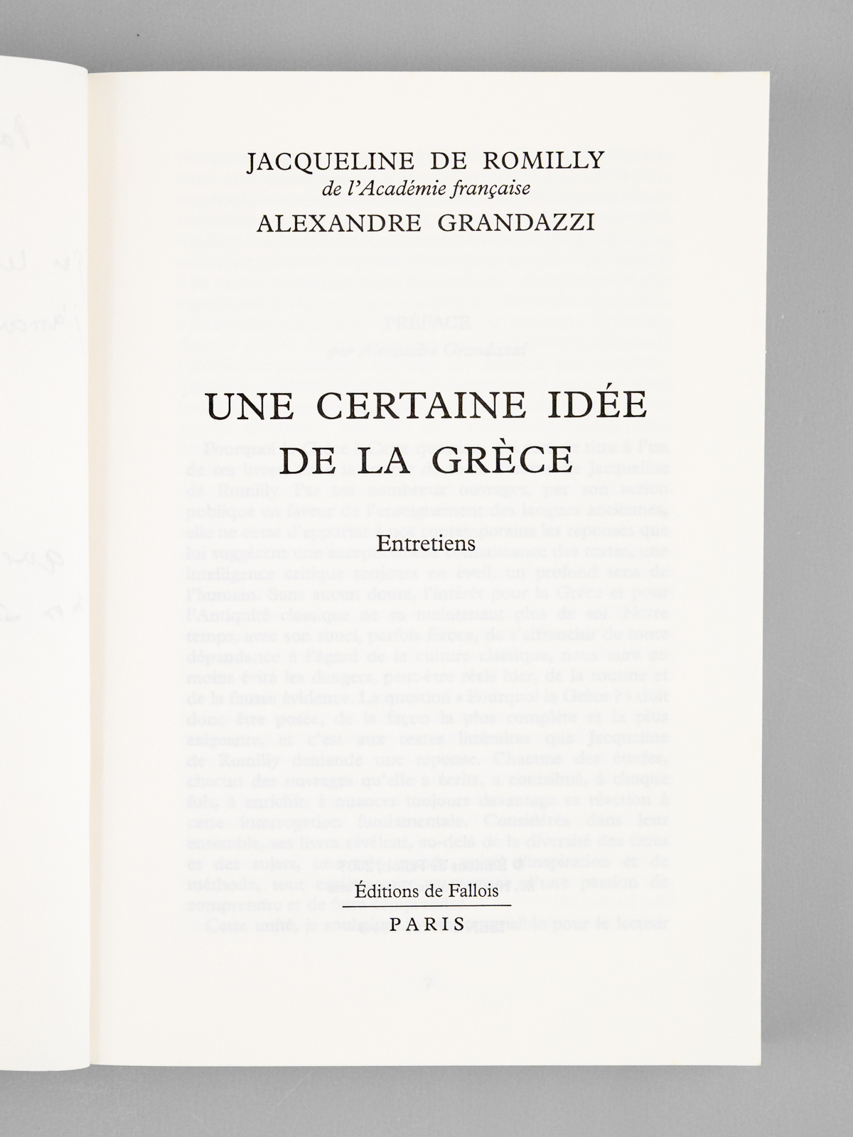 Envoi ms. de l'auteur, 1 vol. in-8 br., Editions de Fallois, Paris, 2003, 266 pp. Commentaire : Bel envoi de l'auteur à l'académicien Maurice Druon et à son épouse : 'Pour Maurice Druon et pour Madeleine, qui verront que tout compte fait, j'aimais le Grec. Avec mes souhaits et mon souvenir amicalement reconnaissant.' Maurice Druon (1918-2009), auteur notamment de la célèbre saga historique des Rois maudits, fut élu à l'Académie Française en 1968. Il en devint le Secrétaire Perpétuel, de 1985 à 1999. Jacqueline de Romilly, quant à elle, fut élue à l'Académie Française en 1988. Bon état pour cet exemplaire, d'une origine prestigieuse.