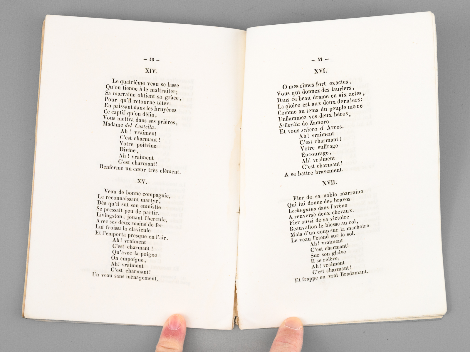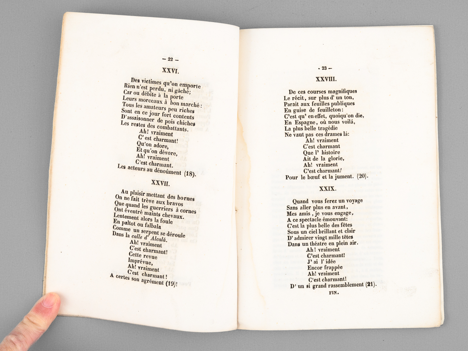 1 brochure in-12, Monier, Libraire-Editeur, Imprimerie du Collège des Sourds-Muets et Aveugles, Madrid, 1845, 56 pp. et 1 f. n. ch. Commentaire : Patorny, l'auteur et avocat au barreau de Paris, écrit en préface : 'Puisque mes amis me le conseillent, j'extrais de mon album de voyage et livre à l'impression la plaisanterie rimée que m'ont inspirée les diverses courses de taureaux que j'ai vues à Madrid depuis octobre 1844, jusqu'à juin 1845. J'ai tâché d'être exact et, ma chanson à la main, on pourra s'en convaincre : quand aux traits comiques dont j'ai essayé de la saupoudrer, je les abandonne à l'humeur sérieuse ou bouffonne du lecteur'. Bon état (lég. mouill. en marge intérieure, bon exemplaire par ailleurs) pour cet ouvrage peu commun.