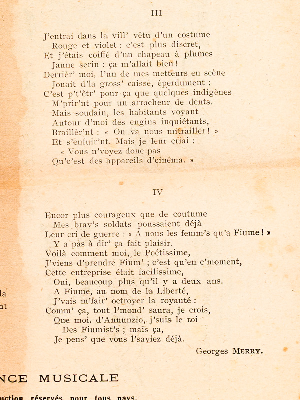 Prospectus in-12, 2 ff., Propriété de La Renaissance Musicale, s.d. [ vers 1920 ] Commentaire : Rare prospectus contenant le texte de la chanson parodique en 4 couplets qui se termine ainsi : 'Cette entreprise était facilissime, oui, beaucoup plus qu'il y a deux ans, A Fiume au nom de la Liberté, J'vais m'fair octroyer la royauté : Comm'ça, tout l'mon' saura je crois, Que moi d'Annunzio, j'suis le roi, des Fiumist's ; mais ça, Je pens' que vous l'saviez déjà' ! Le chansonnier Georges Merry (1894-1944) mourra dans le camp de concentration de Dora. Etat très satisfaisant (un accroc sans manque au premier feuillet) pour ce curieux document