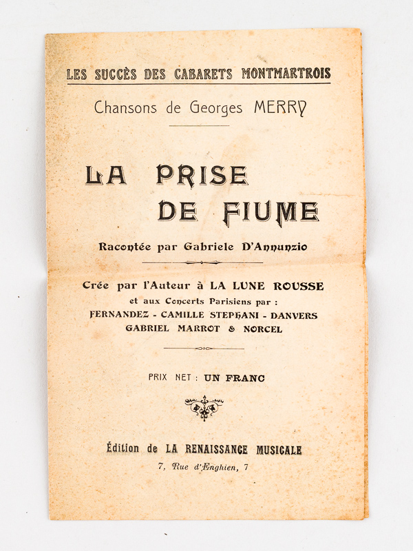 [ Prospectus original ] La Prise de Fiume racontée par Gabriel D'Annunzio. Chansons de Georges Merry. Créé par l'auteur à la Lune Rousse et aux Concerts parisiens par : Fernandez - Camille Stephani - Danvers - Gabriel Marrot &