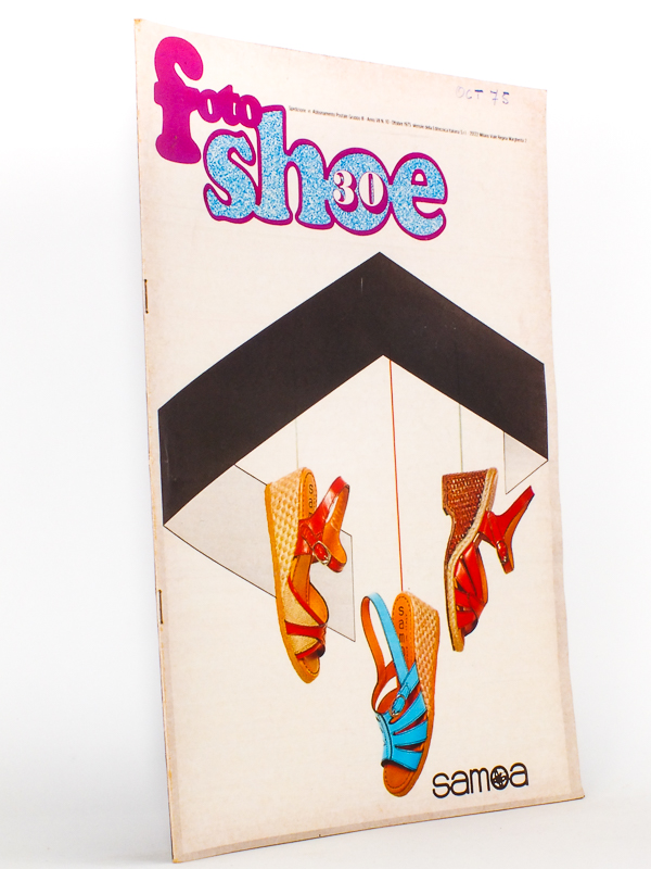 1 vol. in-folio softcover, col. cover, b&w. or col. ill., Foto Shoe, Editecnica Italiana S.R.L., Milano, 1975, 71 pp. Text in Italian, with some transl. in English, French and German. Commentaire : Nice copy (handwritten date on top cover, otherwise a very nice copy) of this issue of an Italian monthly magazine on footwear fashion & business. In 1975, the magazine 'Foto shoe' changed its title into 'Foto Shoe 30', which has remained unchanged since then. Scarce.