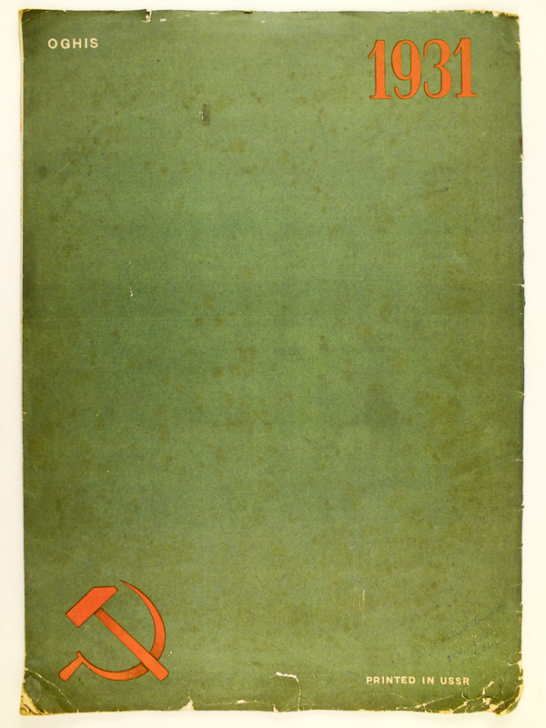 1 numéro in-folio br., URSS en Construction. Revue mensuelle illustrée, Union des Editions d'Etat, Oghis, RSFSR, 1931, numéro 9, 20 ff. Commentaire : Montage photographique du frontispice par John Hartfield (en fait, John Heartfield, lequel voyagea en URSS d'avril 1931 à janvier 1932 ; il s'y lia notamment avec Sergei Tretyakov). Rare exemplaire de cette importante revue de propagande, dont le présent numéro est intégralement consacré à Moscou. Etat satisfaisant (accrocs avec petits mq. en couv. en queue et coiffe sup, bon état par ailleurs) pour ce rare exemplaire bien complet du petit carton d'erratum.