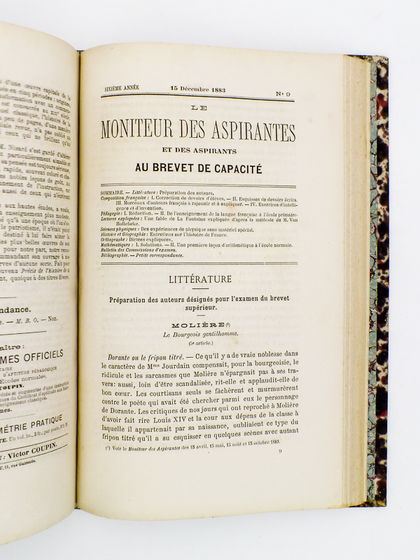 1 vol. grand in-8 rel. demi-basane lie-de-vin, Le Moniteur des Aspirantes et des Aspirants aux brevets de capacité - Picard-Bernheim, Paris, Bordeaux etc., 1883 et 1884, 480 pp. Commentaire : Etat très satisfaisant (petits manques en haut de mors, petit ex libris ms., bon état par ailleurs, avec intérieur particulièrement frais et reliure solide). Le certificat d'aptitude pédagogique, institué en 1881, devint en 1884 le titre professionnel demandé pour la direction de toute école publique. Puis, une loi du 30 octobre 1886 posa que nul ne pouvait être nomme instituteur titulaire, s'il n'était pourvu de ce certificat. La présente revue, destinée à la préparation des candidats, conserve un grand intérêt, car elle permet d'apprécier le niveau exigé des futurs instituteurs et/ou directeurs d'école publique à la fin du XIXe siècle.
