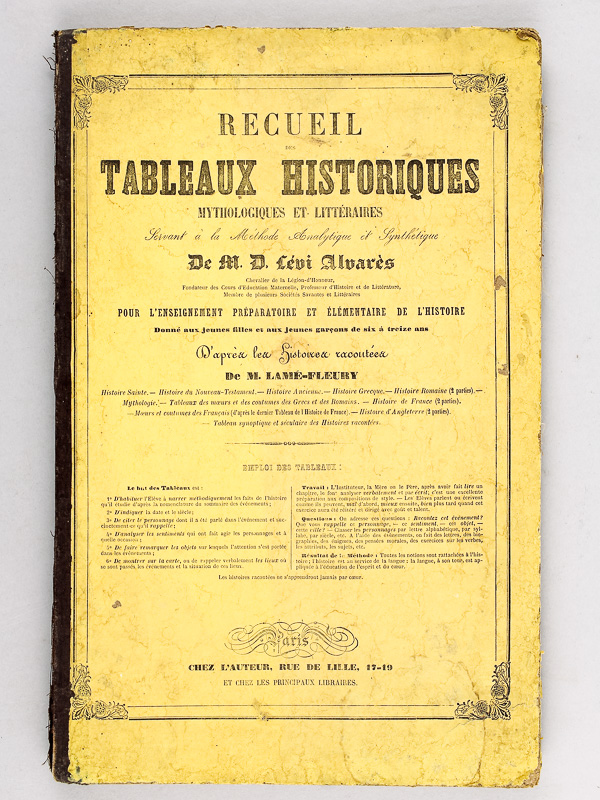 Pour l'Enseignement Préparatoire et Elémentaire de l'Histoire donné aux jeunes filles et aux jeunes garçons de six à treize ans, d'après les histoires racontées de M. Lamé-Fleury, 1 vol. grand in-4 reliure demi-toile noire éditeur, Chez l'Auteur, rue de Lille, s.d. (circa 1856), avec Echelle des Peuples depuis la Création jusqu'à nos Jours, 1 grand tableau dépliant imprimé sur toile, 6e édition Commentaire : Rare exemplaire de ce recueil, auquel est joint l'impressionnant tableau imprimé sur toile de 'l'Echelle des Peuples depuis la Création jusqu'à nos Jours'. Etat satisfaisant (dos abîmé, bon état par ailleurs) pour ces témoignages de l'oeuvre du pédagogue né à Bordeaux David Lévi Alvarès (1794-1870).