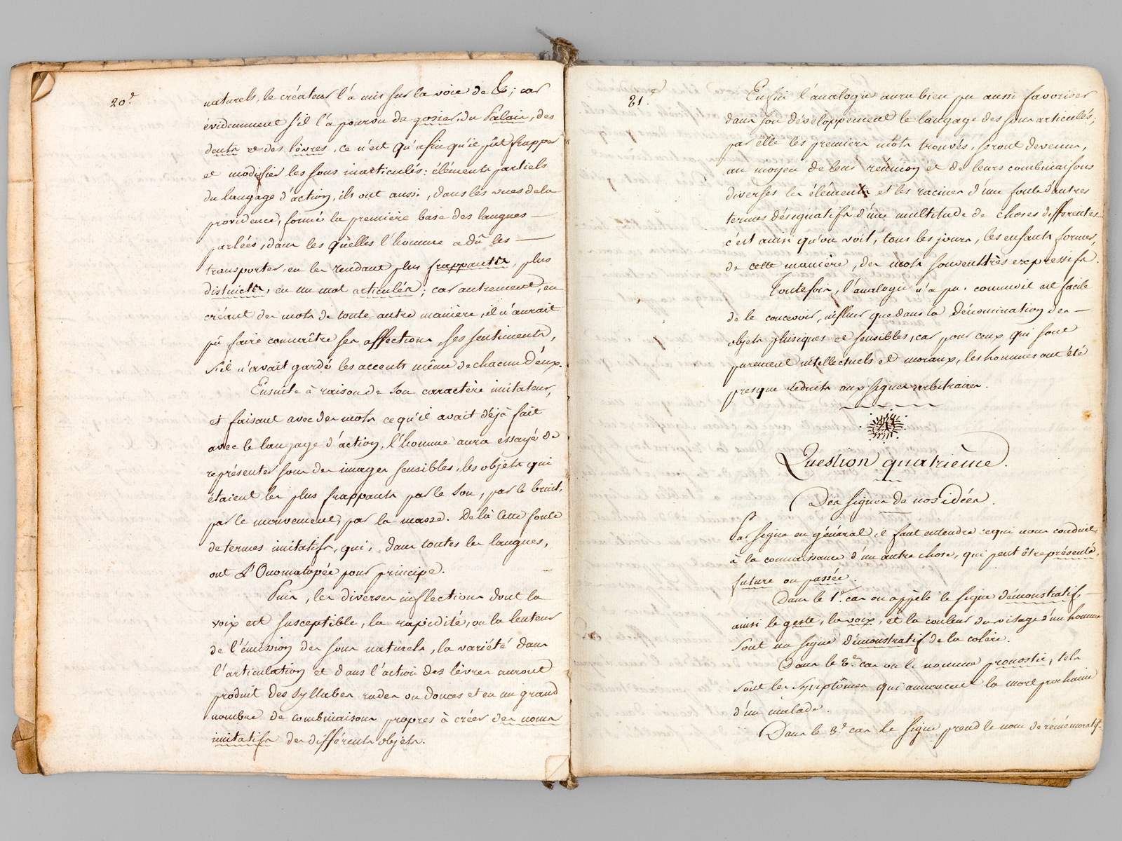 1 cahier in-8 sous couv. en vélin de remploi rempliée, 1801-1802, 108 pp. Commentaire : Remarquable et très curieux document que ce cours manuscrit de logique, dont une inscription au second plat précise : 'Cahier de logique, dicté par un des plus habiles philosophes de France, M. de Valrivière, professeur de Philosophie à la faculté des Lettres de Limoges, ce 1er 9bre 1807'. Une mention manuscrite in-fine précise :'Fin de la Logique 1re partie de la philosophie Commencée le 1er 9bre 1801 et finie le 1er février 1802' et est signée 'Beaulieu Aîné'. On sait que l'abbé Jean-François de Valrivière (1762-1839) est considéré comme le premier professeur ayant enseigné la philosophie à Limoges. De 1799 à 1801, il est professeur à Villefranche, puis à Souillac, enfin au Lycée de Bordeaux puis de Limoges, de 1804 à 1809. Il intégrera la Faculté des Lettres de Limoges en 1810 où il dispensera, le premier, à Limoges, quatre leçons de philosophie par semaine (le corpus comprenant les principes de la logique, de la métaphysique, ainsi que l'histoire des opinions des philosophes). Le présent manuscrit est daté in fine des années 1801-1802, et l'inscription au second plat mentionne 1807, ce que des recherches plus approfondiées permettront peut-être d'expliquer. Il provient des archives du juriste et avoué Léon Lemaigre-Dubreuil (1801-1876, de La Souterraine, dans la Creuse). A l'intérieur du vélin de remploi servant de couverture, on peut également découvrir un très grand portrait de belle facture !