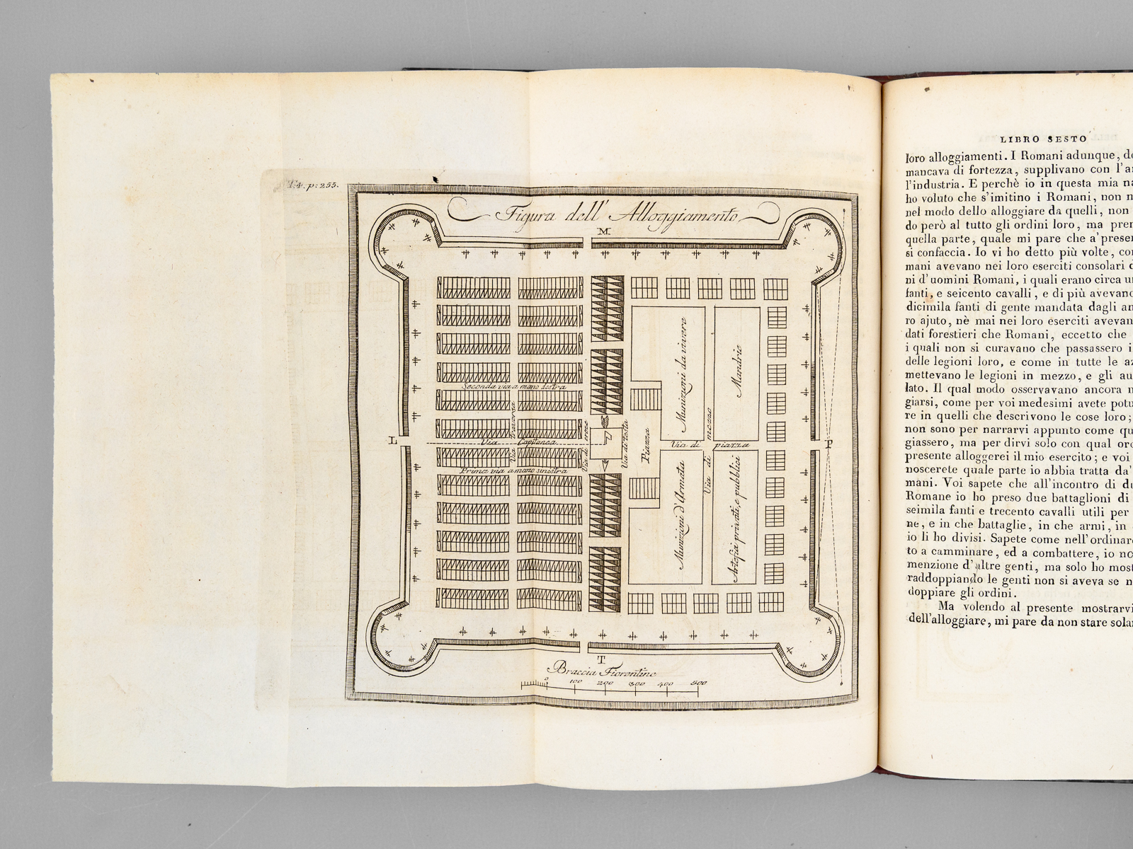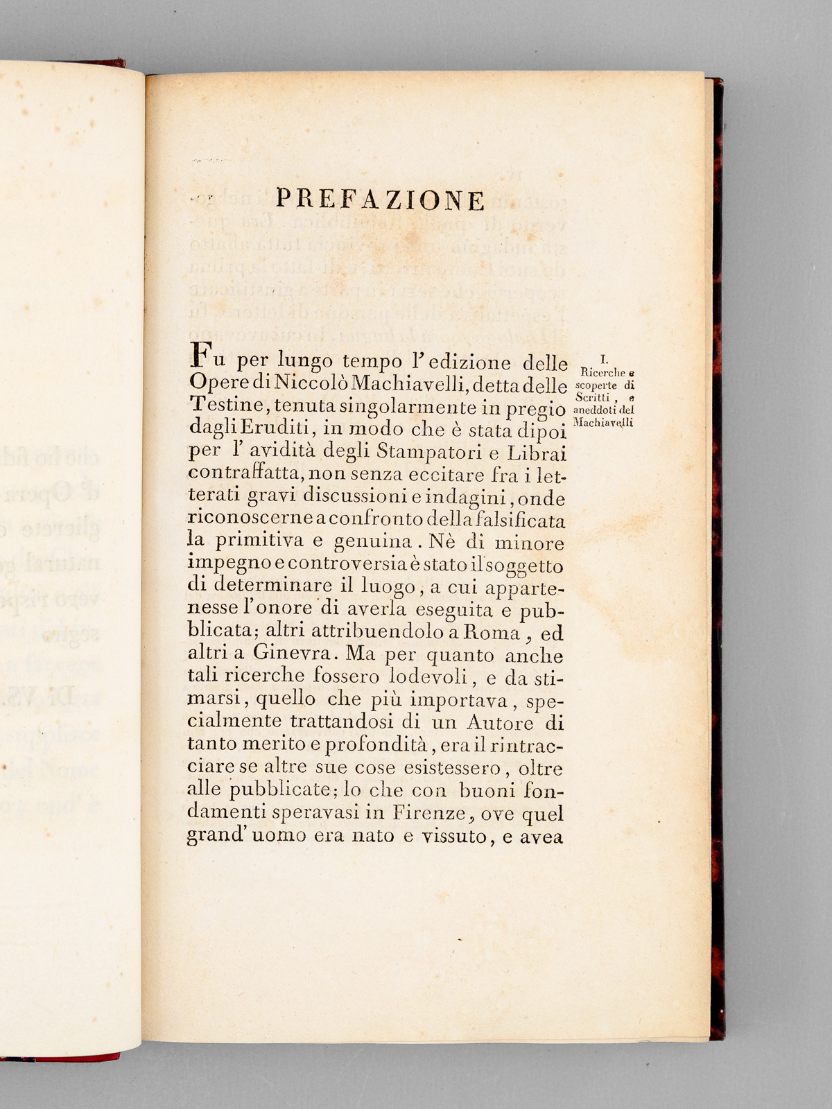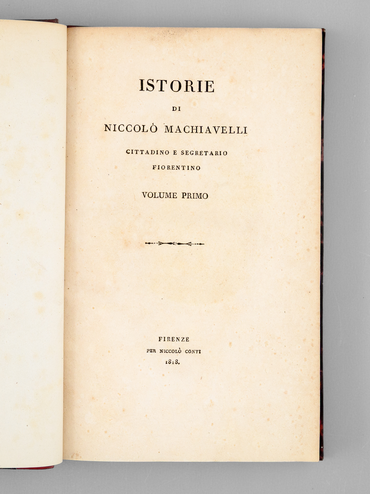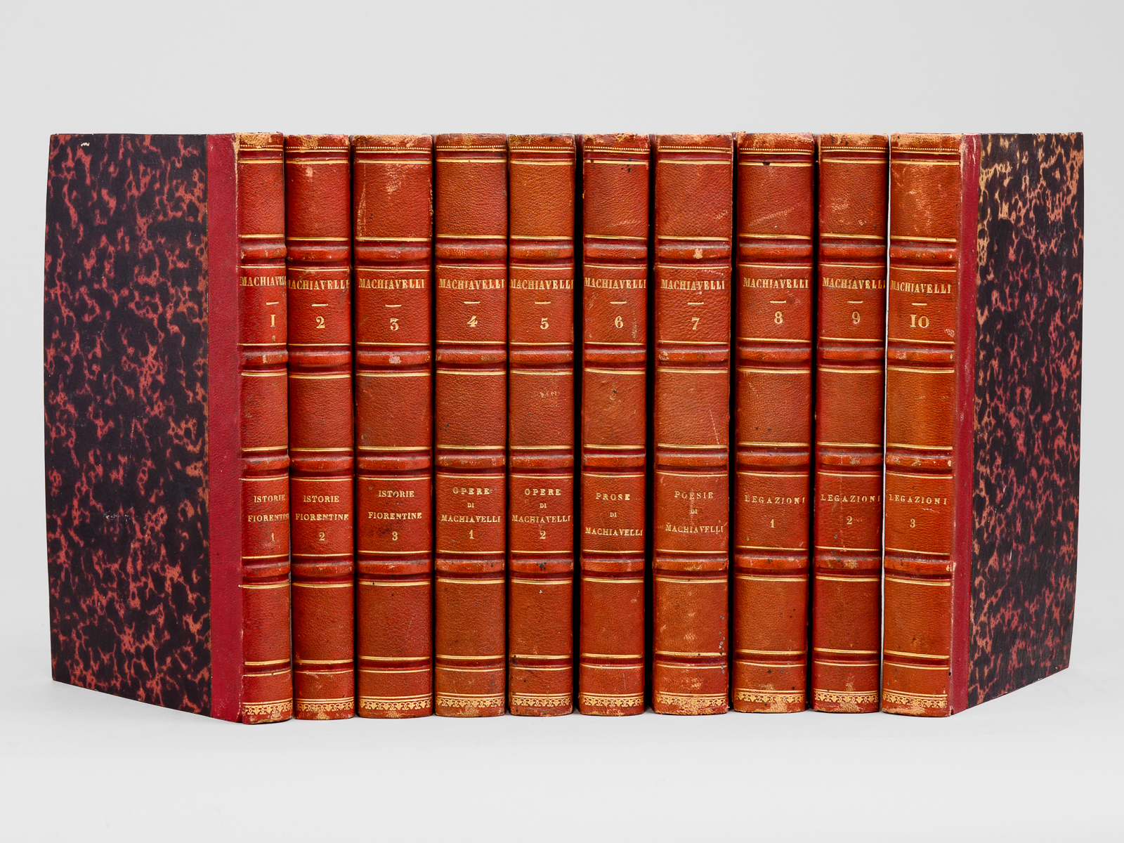 10 vol. in-8 reliure demi-chagrin rouge, dos à 4 nerfs, Per Niccolo Conti, Firenze, 1818 - 1821, Commentaire : Completo del ritratto di Machiavelli inciso in rame all'antiporta e della pagina raffigurante una lira nel primo volume, della tavola calcografica nel quinto volume ('Figura dell'Allogiamento') e del facsimile all'antiporta del decimo volume. Bon état (petits frott. en reliures, épidermures au mors du tome 2, bonne fraîcheur intérieure). Voir également, dans notre catalogue, la traduction française et complétée, en reliure identique.