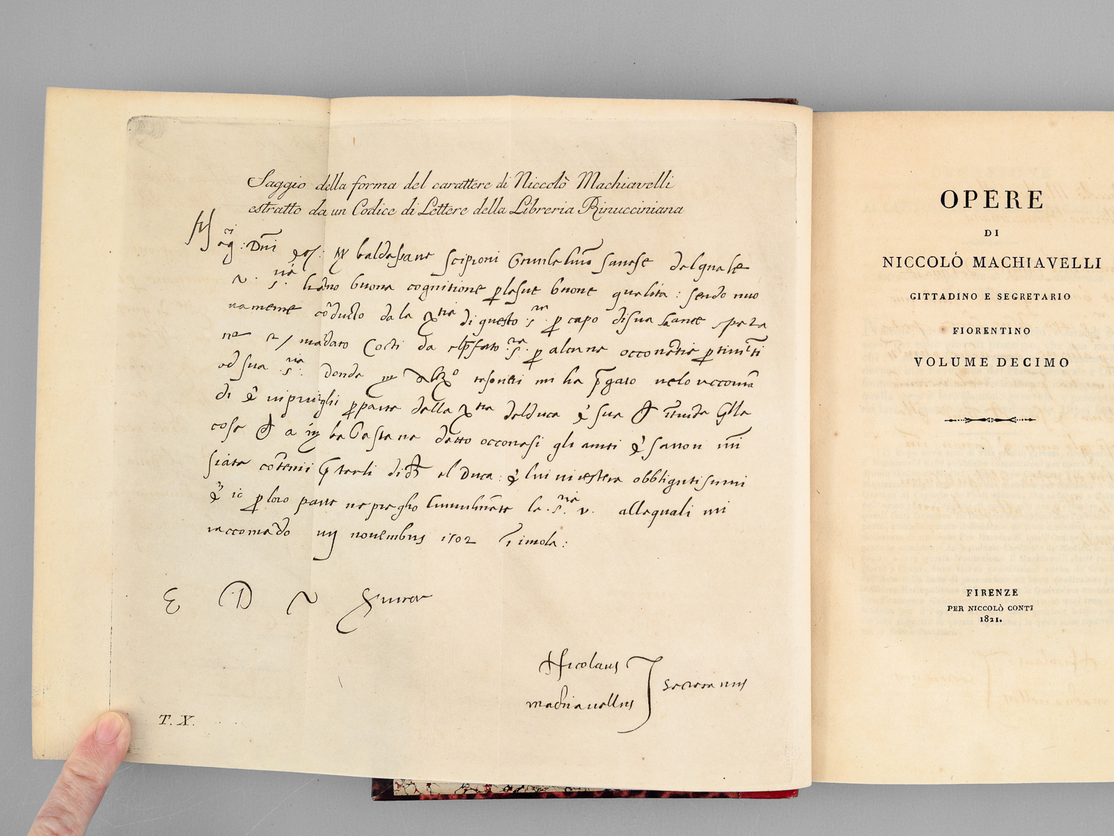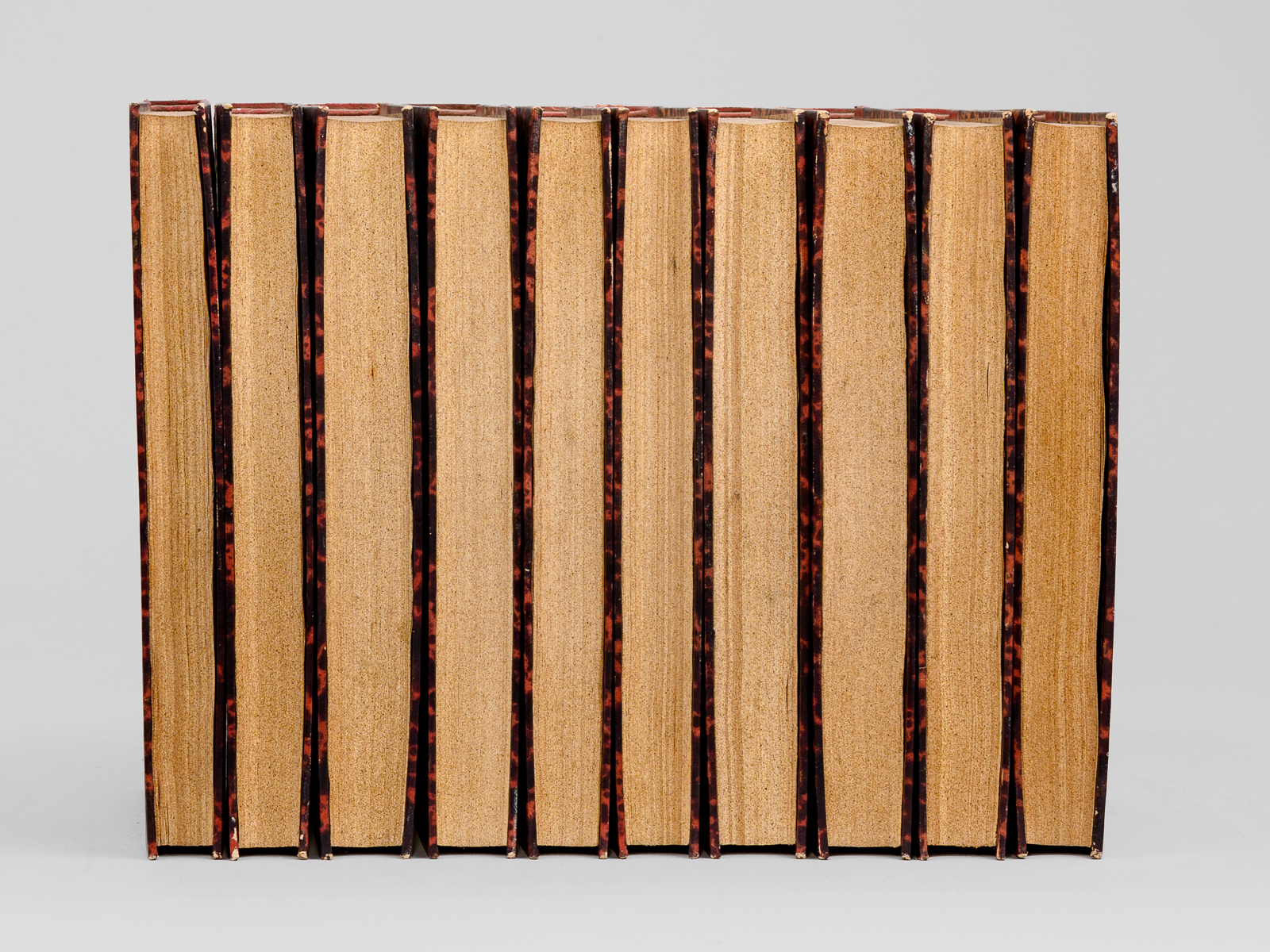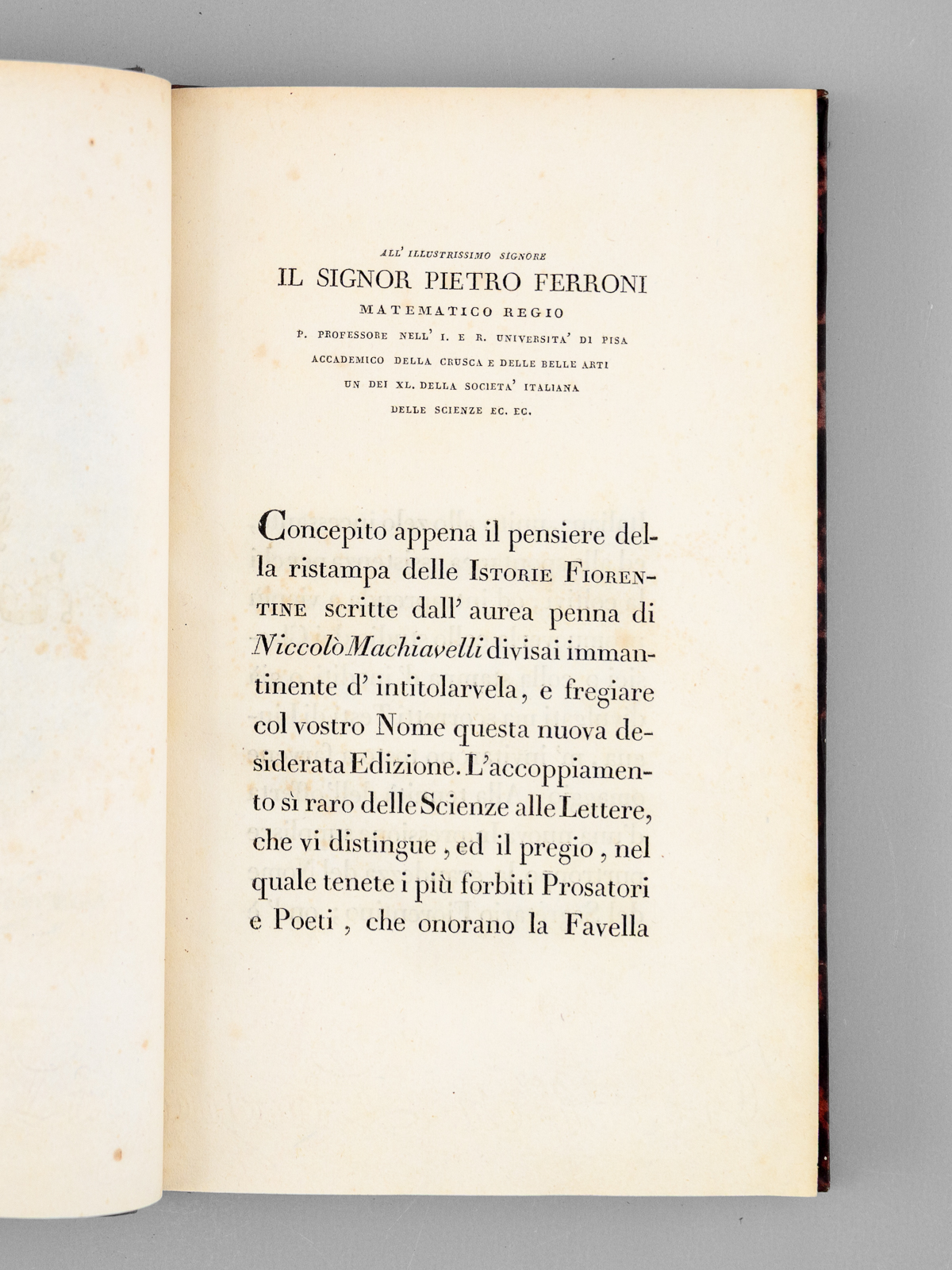 10 vol. in-8 reliure demi-chagrin rouge, dos à 4 nerfs, Per Niccolo Conti, Firenze, 1818 - 1821, Commentaire : Completo del ritratto di Machiavelli inciso in rame all'antiporta e della pagina raffigurante una lira nel primo volume, della tavola calcografica nel quinto volume ('Figura dell'Allogiamento') e del facsimile all'antiporta del decimo volume. Bon état (petits frott. en reliures, épidermures au mors du tome 2, bonne fraîcheur intérieure). Voir également, dans notre catalogue, la traduction française et complétée, en reliure identique.