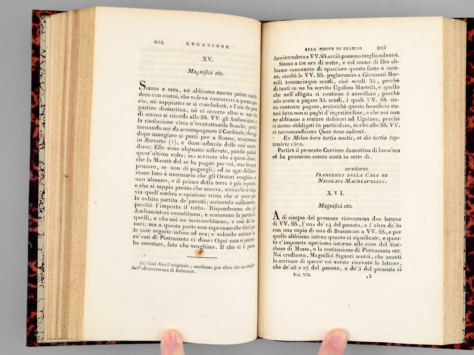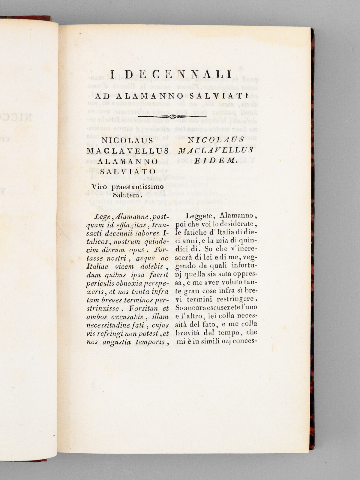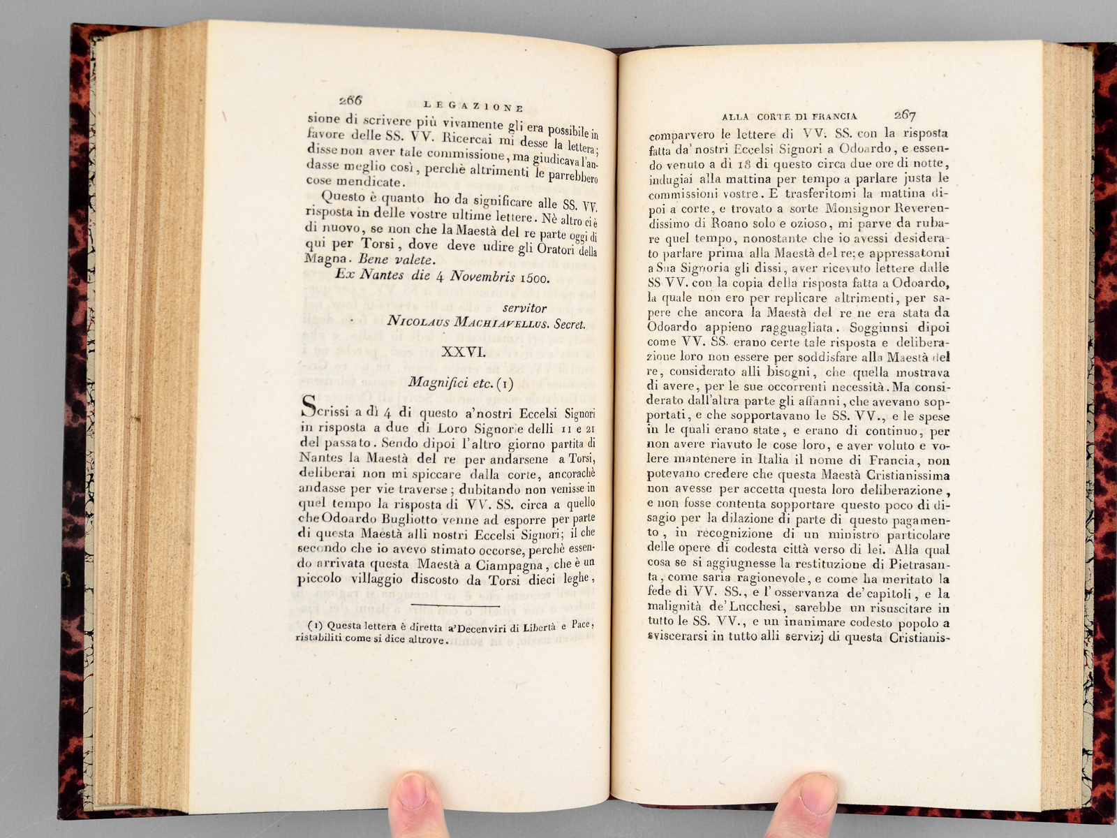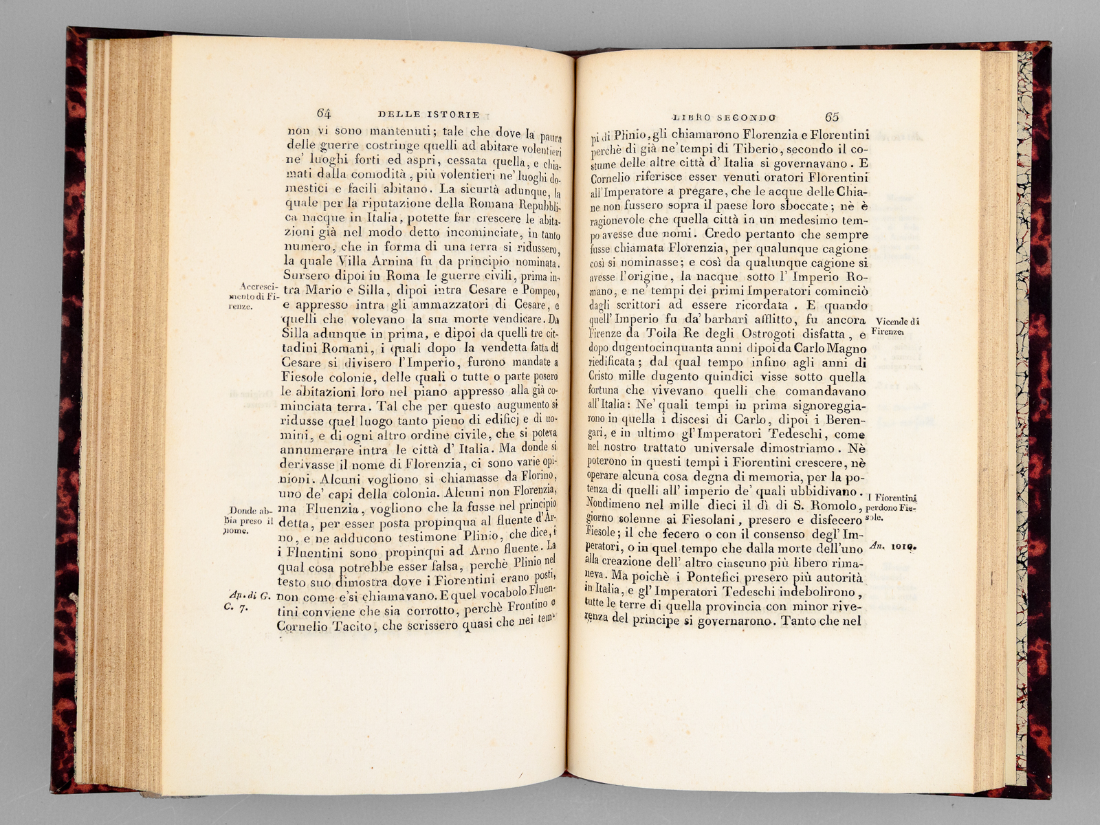 10 vol. in-8 reliure demi-chagrin rouge, dos à 4 nerfs, Per Niccolo Conti, Firenze, 1818 - 1821, Commentaire : Completo del ritratto di Machiavelli inciso in rame all'antiporta e della pagina raffigurante una lira nel primo volume, della tavola calcografica nel quinto volume ('Figura dell'Allogiamento') e del facsimile all'antiporta del decimo volume. Bon état (petits frott. en reliures, épidermures au mors du tome 2, bonne fraîcheur intérieure). Voir également, dans notre catalogue, la traduction française et complétée, en reliure identique.