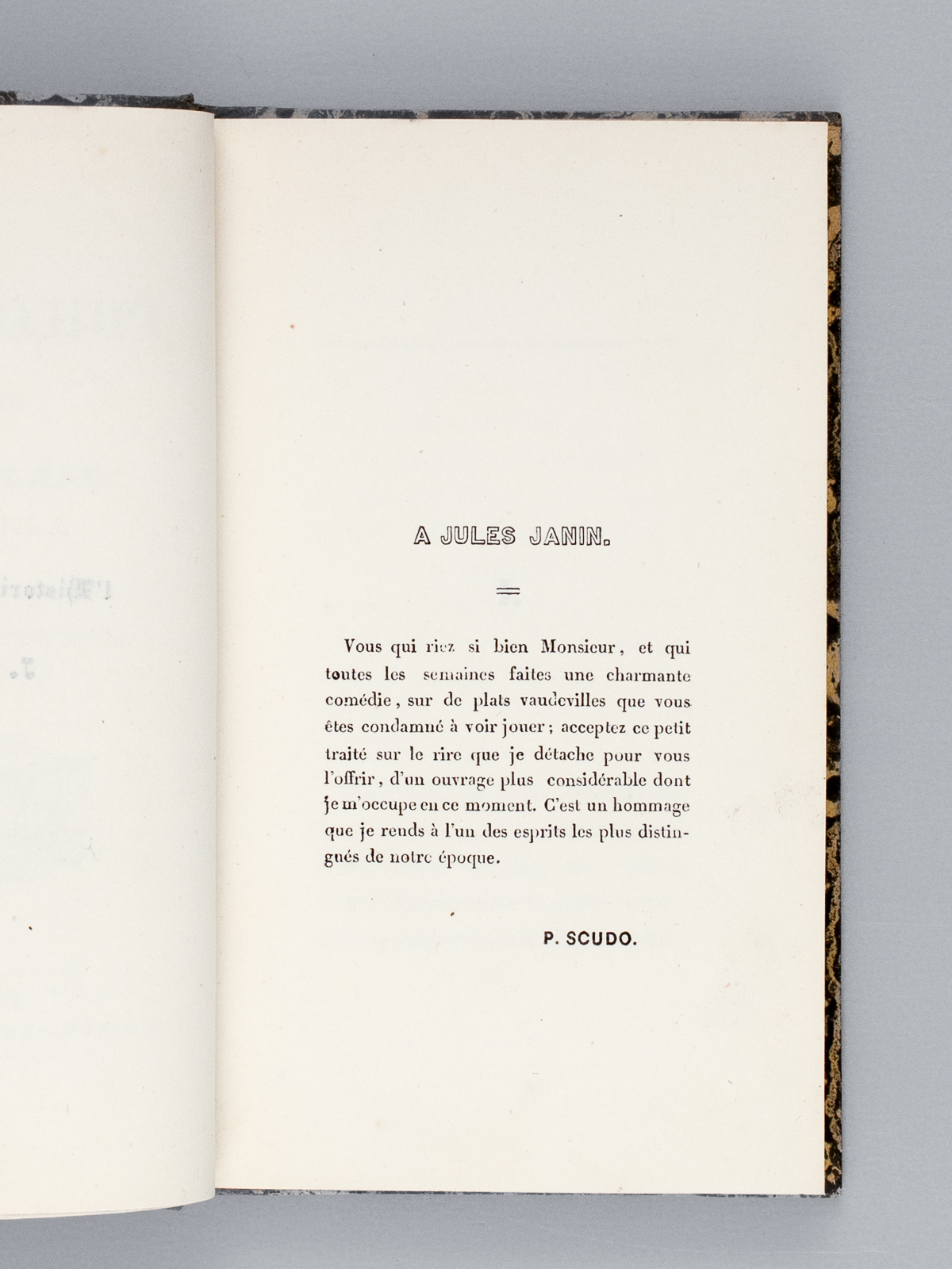 1 vol. in-12 reliure de l'époque demi-percaline grise, Poirée, Paris, 1840, 93 pp. et 2 ff. n. ch. Commentaire : Envoi autographe de l'auteur à l'écrivain M. Hyppolite Lucas. Rare exemplaire de ce travail consacré au rire, 60 ans avant Bergson, et qui propose in fine une courte bibliographie sur le sujet. Paul Scudo (1806-1864) était un célèbre critique musical de son temps, l'un des 'plus fidèles ennemis' de la musique de Berlioz. Baudelaire lui aurait emprunté sa 'thèse de la supériorité' Bon exemplaire.