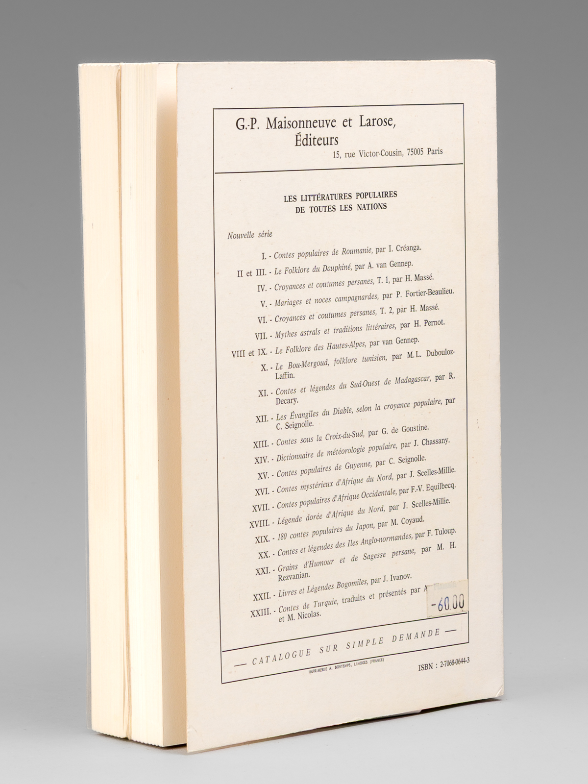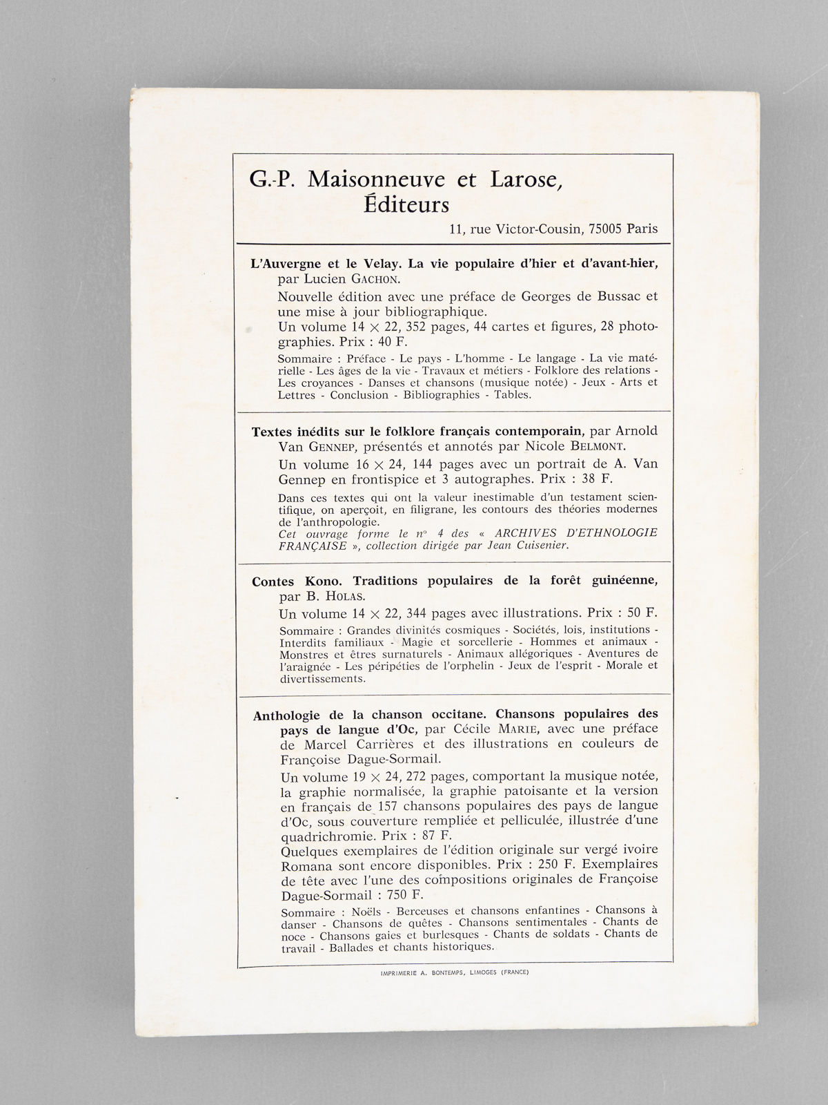 2 vol. in-8 br., coll. Contributions au Folklore des Provinces de France, G.-P. Maisonneuve et Larose, Paris, 1976-1977, 548 pp. Commentaire : Bon état pour ce lot réunissant les 2 premier tomes (sur 4).