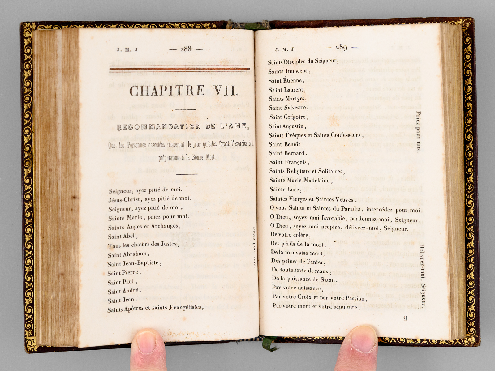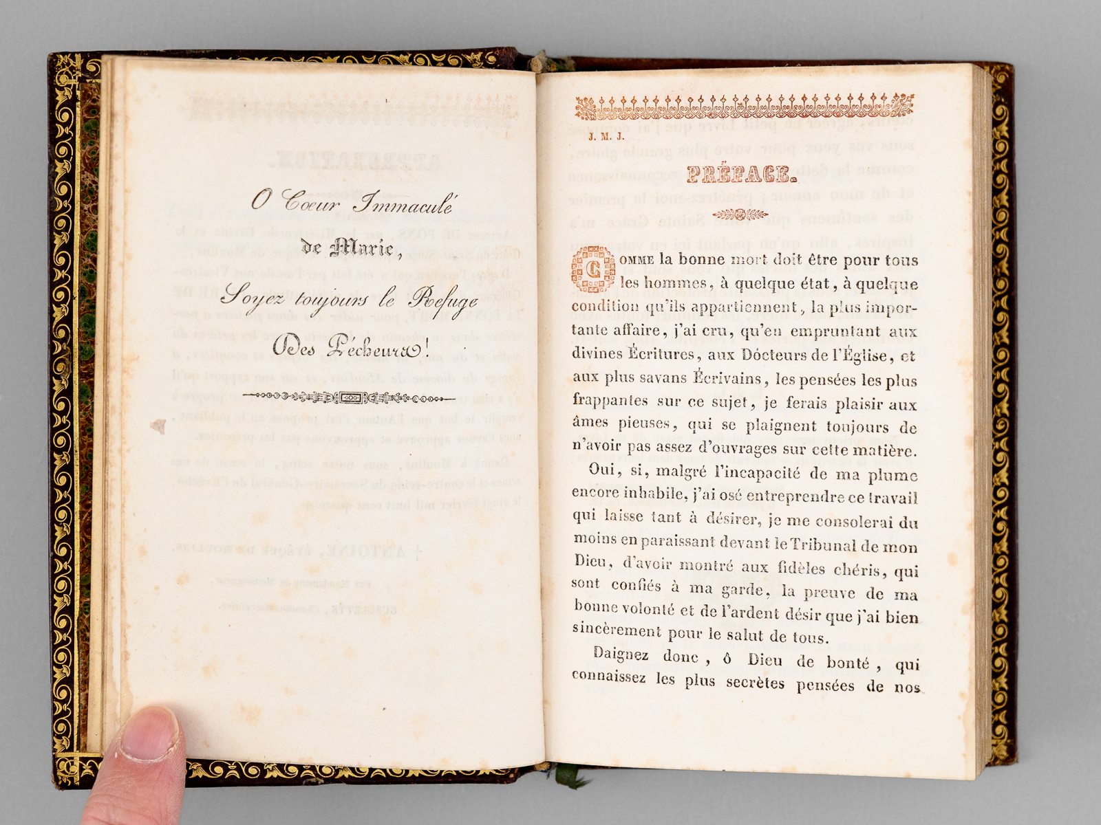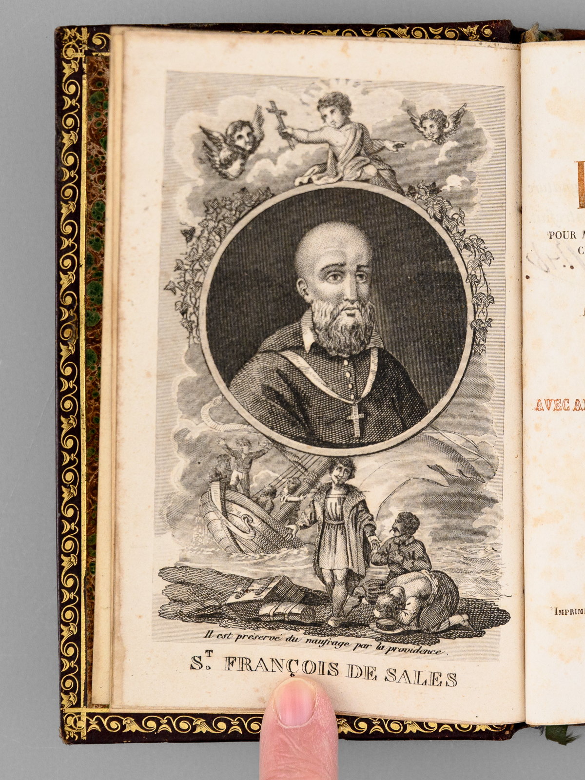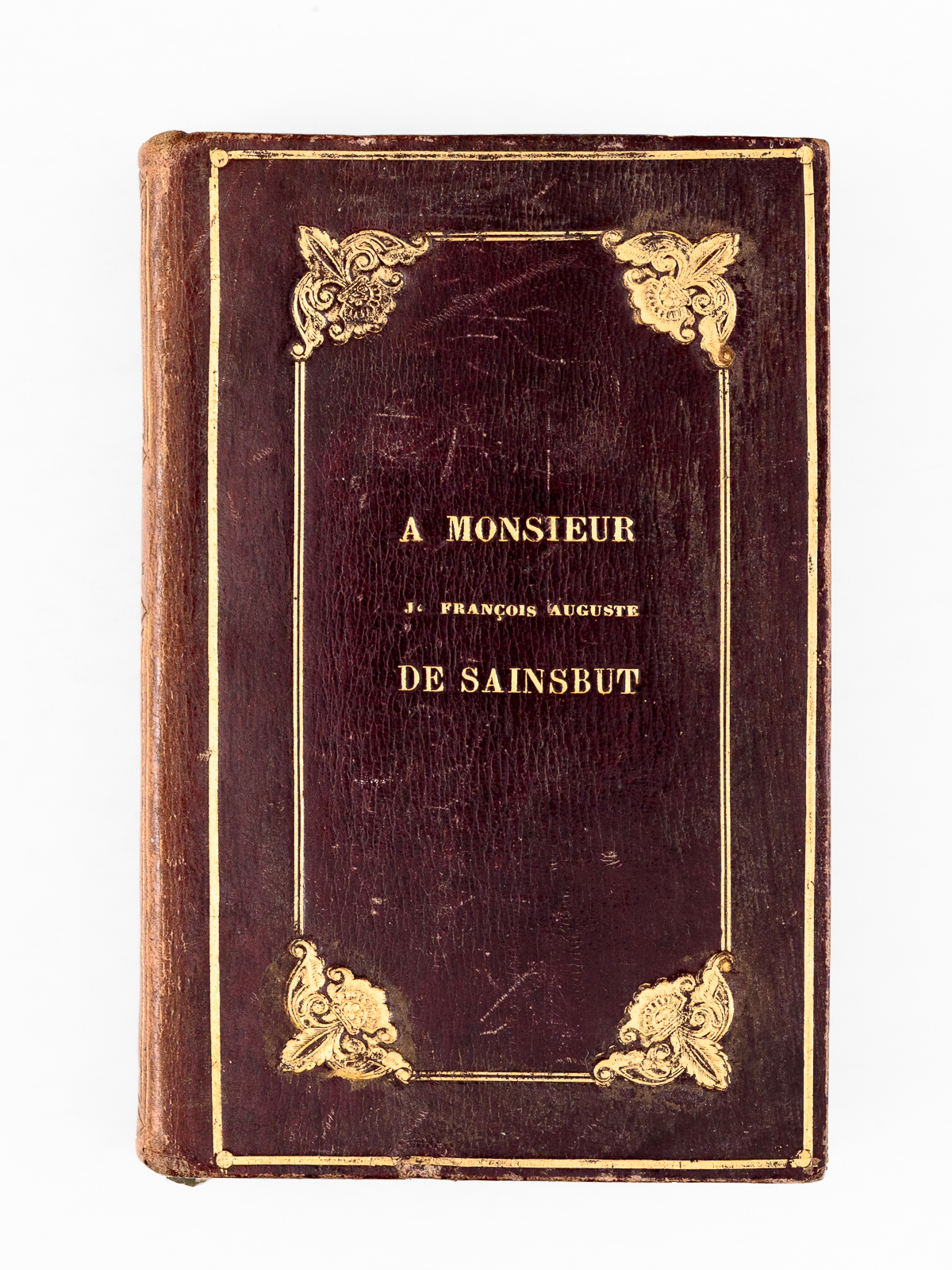 Avec approbation de Mgr l'Evêque, 1 vol. in-12 reliure de l'époque plein veau, dos lisse, toutes tranches dorées, coupes et chasses ornées, mention d'ex-dono en premier plat : 'A Monsieur J. François Auguste de Sainsbut', Imprimerie de Place-Bujon, Moulins, 1840, 454-vii pp. et 1 f. n. ch. Commentaire : Rare exemplaire dédicacé par l'auteur de cette impression moulinoise peu commune. L'ouvrage est offert à Jean François Auguste de Sainsbut, néà a Moulins le 25 décembre 1815, marié à Sint-Pourçain-sur-Sioule en 1839 et décédé en janvier 1887 à Hauterive. La troisième partie de l'ouvrage est consacrée à la 'Confrérie de la Bonne Mort érigée dans l'Eglise paroissiale de Verneuil'. Bon état (dos passé, reliure un peu frottée, qq. rouss.).