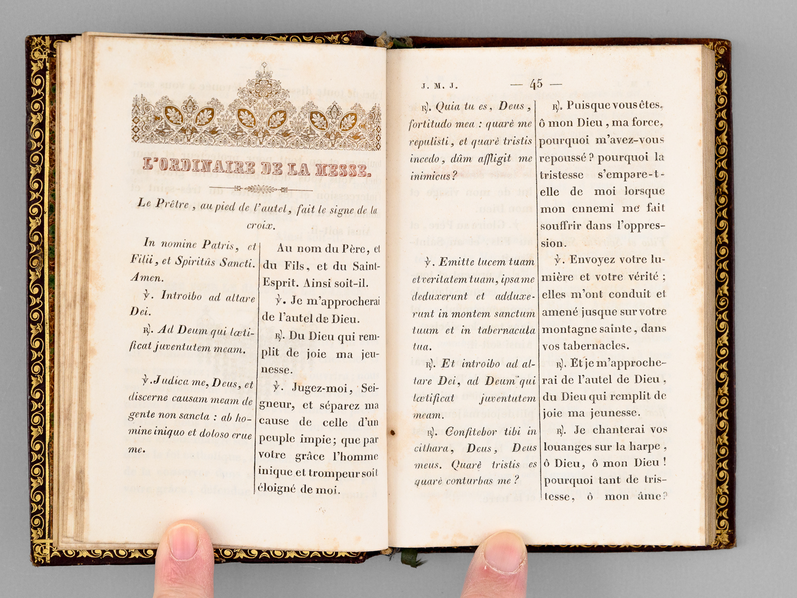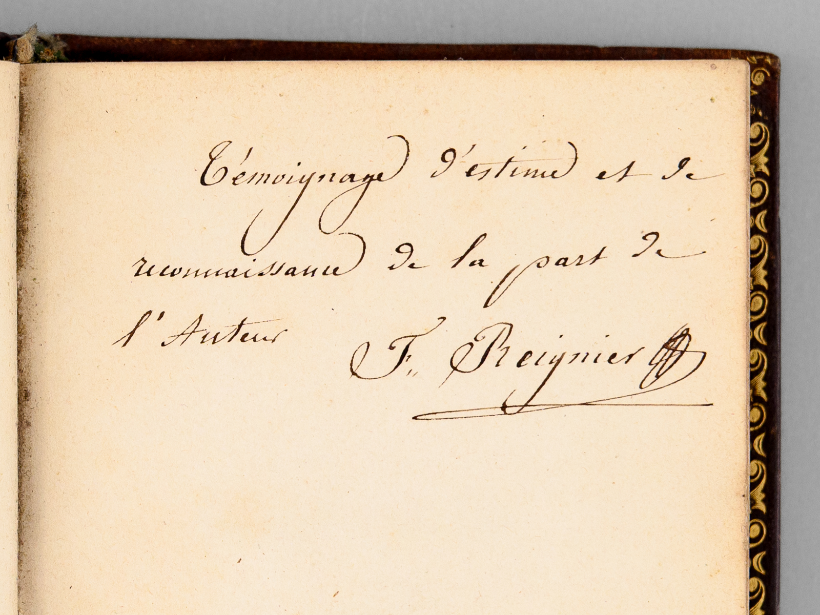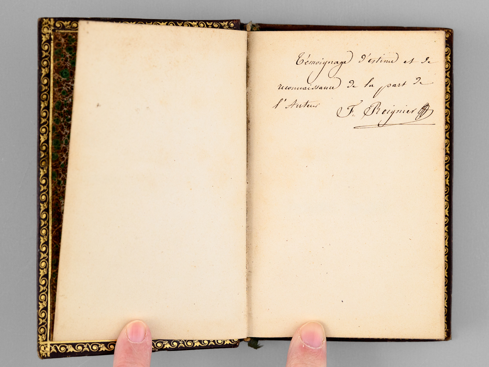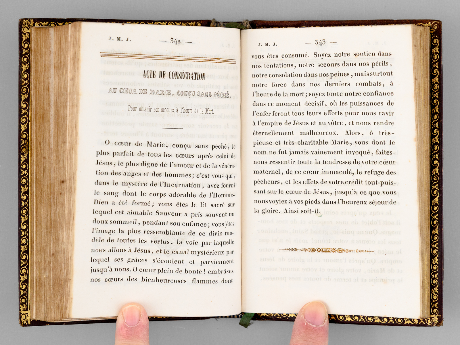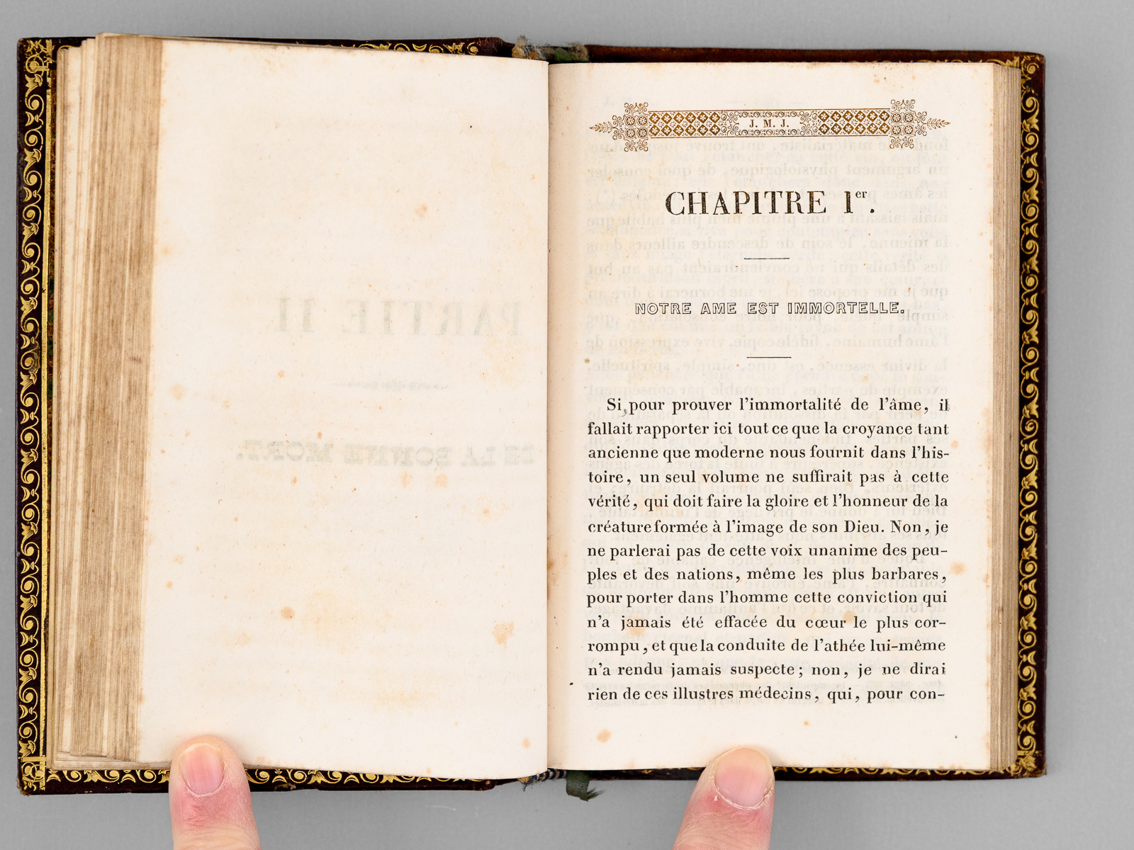 Avec approbation de Mgr l'Evêque, 1 vol. in-12 reliure de l'époque plein veau, dos lisse, toutes tranches dorées, coupes et chasses ornées, mention d'ex-dono en premier plat : 'A Monsieur J. François Auguste de Sainsbut', Imprimerie de Place-Bujon, Moulins, 1840, 454-vii pp. et 1 f. n. ch. Commentaire : Rare exemplaire dédicacé par l'auteur de cette impression moulinoise peu commune. L'ouvrage est offert à Jean François Auguste de Sainsbut, néà a Moulins le 25 décembre 1815, marié à Sint-Pourçain-sur-Sioule en 1839 et décédé en janvier 1887 à Hauterive. La troisième partie de l'ouvrage est consacrée à la 'Confrérie de la Bonne Mort érigée dans l'Eglise paroissiale de Verneuil'. Bon état (dos passé, reliure un peu frottée, qq. rouss.).