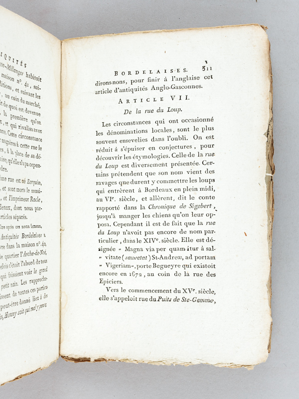 Ouvrage utile aux habitans, indispensable aux voyageurs, et qui manquoit à ceux qui veulent connoître les monumens et les localités remarquables dans le Bordelais. 1 vol. in-8 br. sous couv. d'origine en papier dominoté, Chez Moreau, Bordeaux, 1797, 408 pp. Commentaire : Intéressant exemplaire provenant de la bibliothèque de Bernard Ducasse, de la Société historique et archéologique du Libournais, qui a inséré certains documents et annotations. Il a inséré en page de titre une photocopie de l'exemplaire donné en juillet 1812 à la bibliothèque de Libourne par M. Souffrain, juge au tribunal d'arrondissement, et a retracé au stylo dans le présent exemplaire les passages soulignés par Souffrain dans l'exemplaire libournais (manque de papier au dos, une petite mouill.) Prix en l'état.