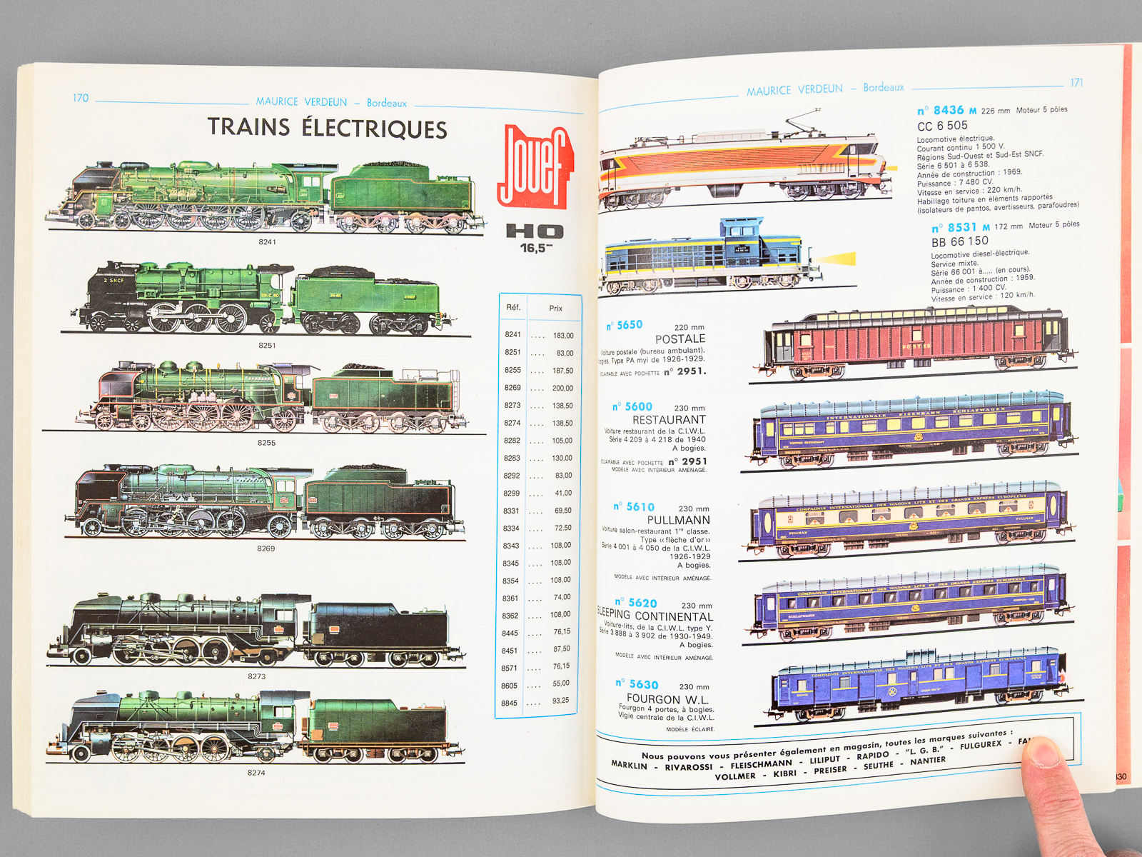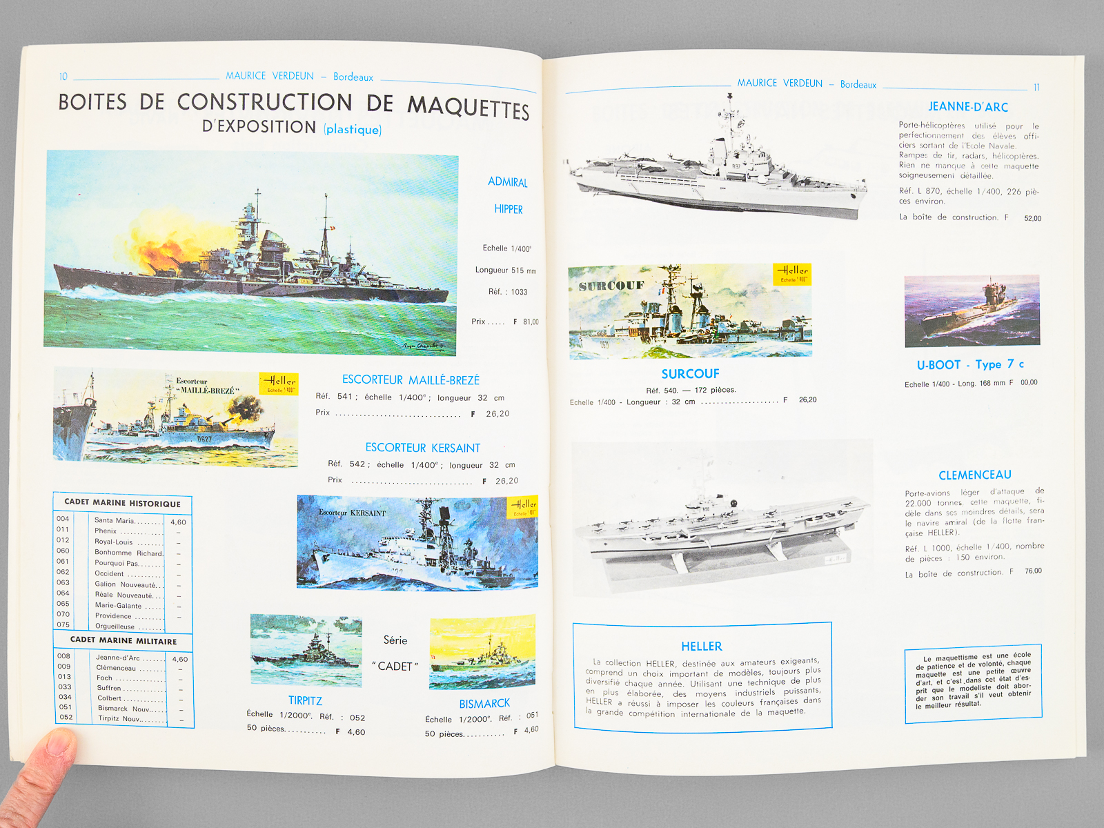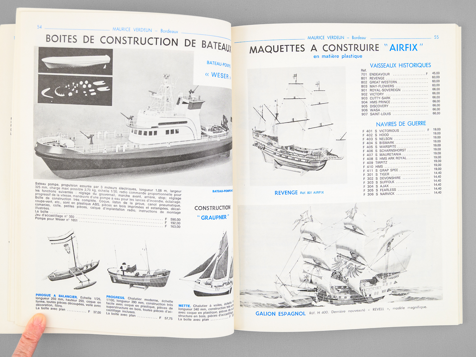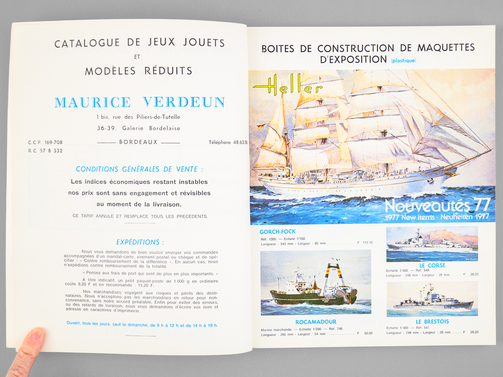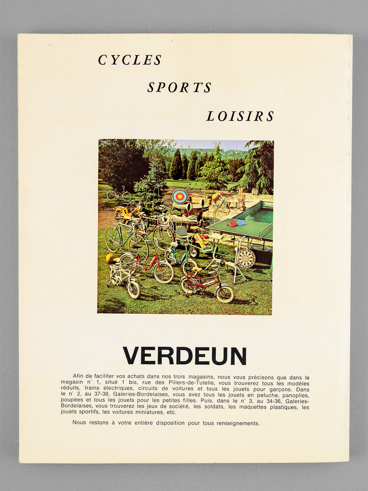 1 vol. in-4 br., illustrations couleurs ou noir et blanc, Maurice Verdeun, Bordeaux, 1977, 195 pp. Commentaire : Très bon état pour ce catalogue, avec prix, du plus fameux magasin de jouets, maquettes et modèles réduits de Bordeaux. Maurice Verdeun (1929-2014), champion du monde de cyclisme amateur en 1950, avait transformé le magasin de vélo familial en une véritable institution bordelaise, qui a malheureusement fermé en 2019.
