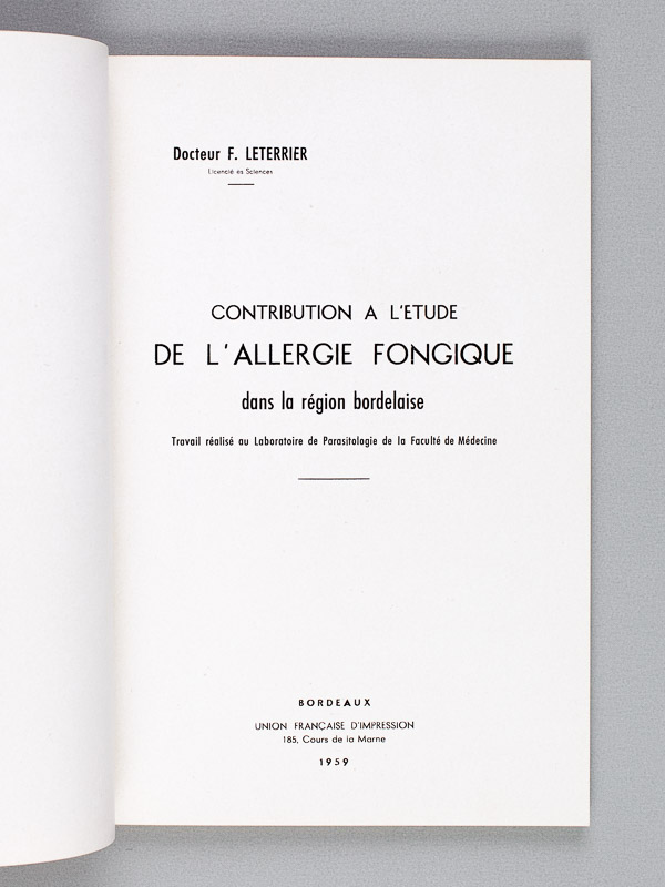 Contribution à l'étude de l'allergie fongique dans la région bordelaise [ Livre dédicacé par l'auteur ] - Auteur: LETERRIER, Docteur F. - Année d'édition: 1959
