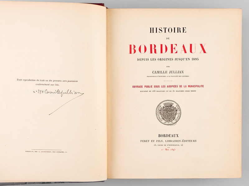 Ouvrage publié sous les auspices de la Municipalité, illustré de 235 gravures et de 32 planches hors texte, 1 vol. fort in-4 relié demi-maroquin à coins vert bronze, dos à 5 nerfs dorés orné, filet doré en mors et coins, tête dorée, Féret et Fils, Bordeaux, 1er Mai 1895, IX-804 pp. Commentaire : Bon état (rel. lég. frottée, coupes un peu frottées, usure angulaire sur qq. cahiers en tranche sup., des rouss.) pour cet exemplaire bien complet des 32 pl. et cartes dépliantes hors texte. Un grand classique.