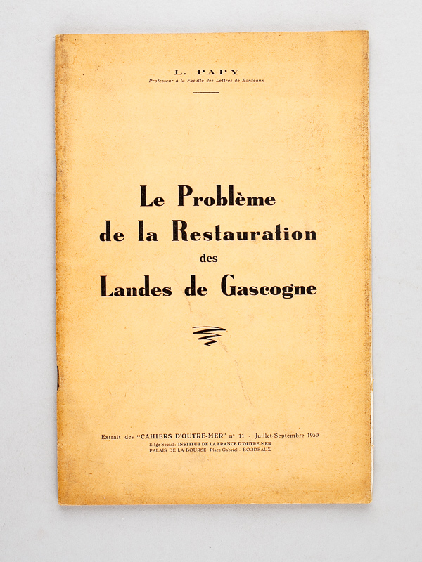 Commentaire : Bon exemplaire du tiré-à-part de l'important article de Louis Papy, rédigé au lendemain des terribles désastres de 1949 : 'en 1949, 130.000 hectares ont été parcourus par le fu dont 53.000 hectares de pins : le record de 1943 a été battu [ ... ] L'épisode le plus tragique de l'été 1949 fut l'incendie qui ravagea les landes girondines dans la seconde quinzaine d'août. [ ... ] La journée du 20 août fut tragique : la grande ville se trouva plongée dès 16 heures dans une nuit lourde d'angoisse, tandis que l'horizon embrasé de lueurs rougeoyantes évoquait une vision d'Apocalypse. [ ... ] Le vent soufflait aux approches de l'incendie avec une violence inouïe ; un vent né des appels d'air déterminés par le feu et non d'un cyclone issu du golfe de Gascogne, comme certains l'ont affirmé. Au centre des tourbillons, il fut, chargé de sable, capable d'arracher les écorces d'arbres et de donner, en quelques secondes, au bois qu'il burina, un aspect éolien [ ... ] Quatre-vingt-deux hommes périrent ce jour là dont on retrouva les corps calcinés, certains affreusement recroquevillés dans les fossés [ ... ]