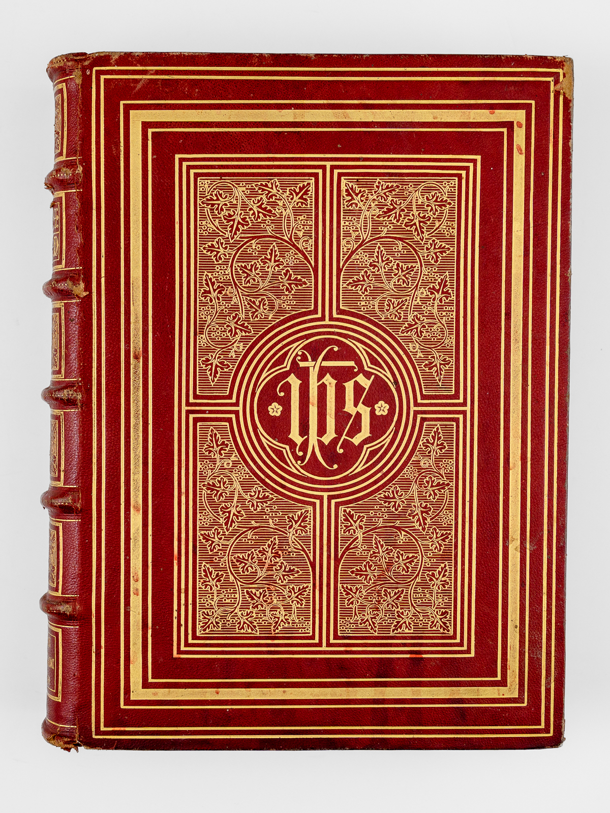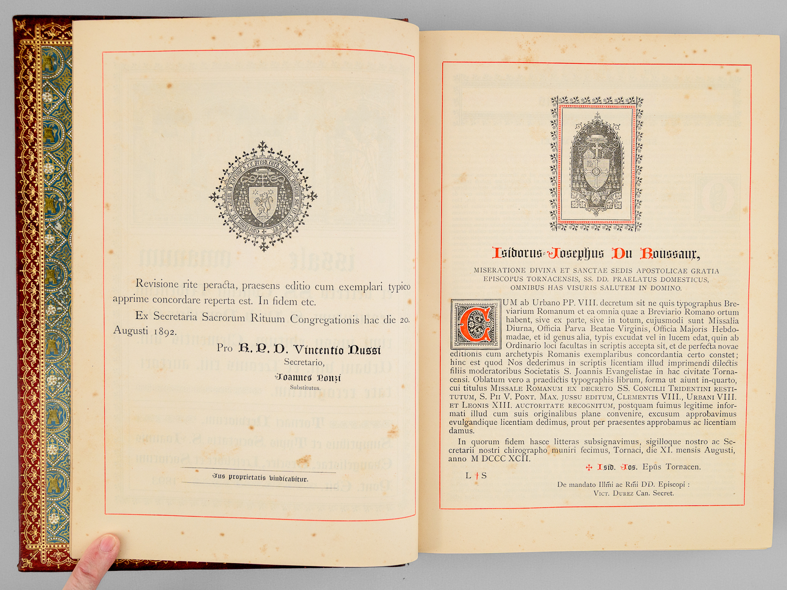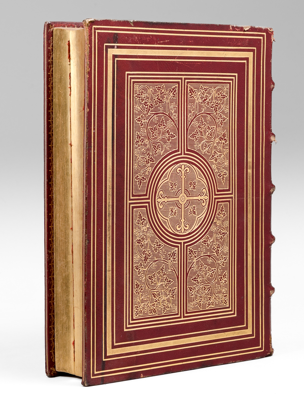 1 vol. in-4 reliure de l'époque plein chagrin rouge, Sumptibus et Typis Societatis S. Joannis Evangelistae, Desclée, Lefebvre et Sociorum, Pont. Edit., Tornaci Nerviorum [ Tournai ], 1893 Commentaire : Avec le Propre du diocèse de Bordeaux (Gironde). Bon état (reliure un peu frottée, onglets coupés).