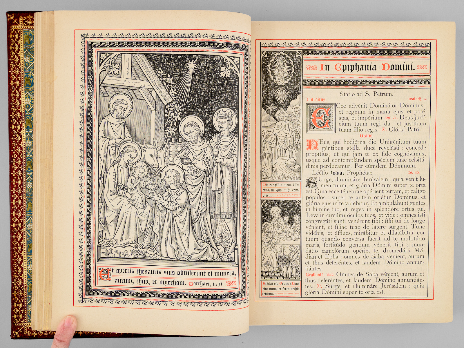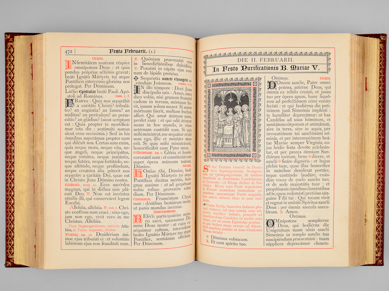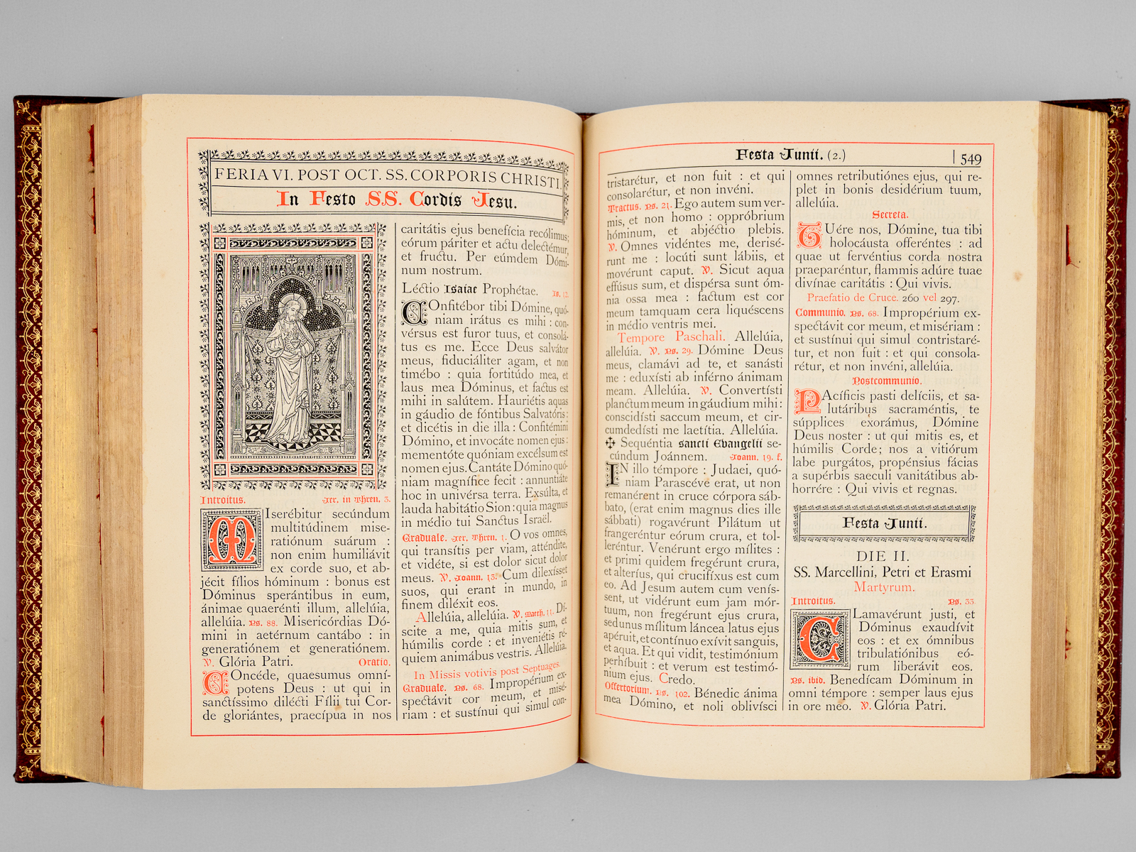 1 vol. in-4 reliure de l'époque plein chagrin rouge, Sumptibus et Typis Societatis S. Joannis Evangelistae, Desclée, Lefebvre et Sociorum, Pont. Edit., Tornaci Nerviorum [ Tournai ], 1893 Commentaire : Avec le Propre du diocèse de Bordeaux (Gironde). Bon état (reliure un peu frottée, onglets coupés).