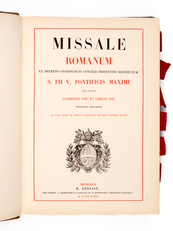 Et novis missis ex indulto apostolico hucusque concessis auctum, 1 vol. in-folio reliure d'époque plein chagrin-maroquiné rouge, dos à 5 nerfs dorés orné, plats richement ornés, chasses ornées, toutes tranches dorées, H. Dessain, Mechliniae, 1879, XL-474-cxxxix pp. et 8 ff. (Missae propriae Dioecesis Burdigalensis, 1853)