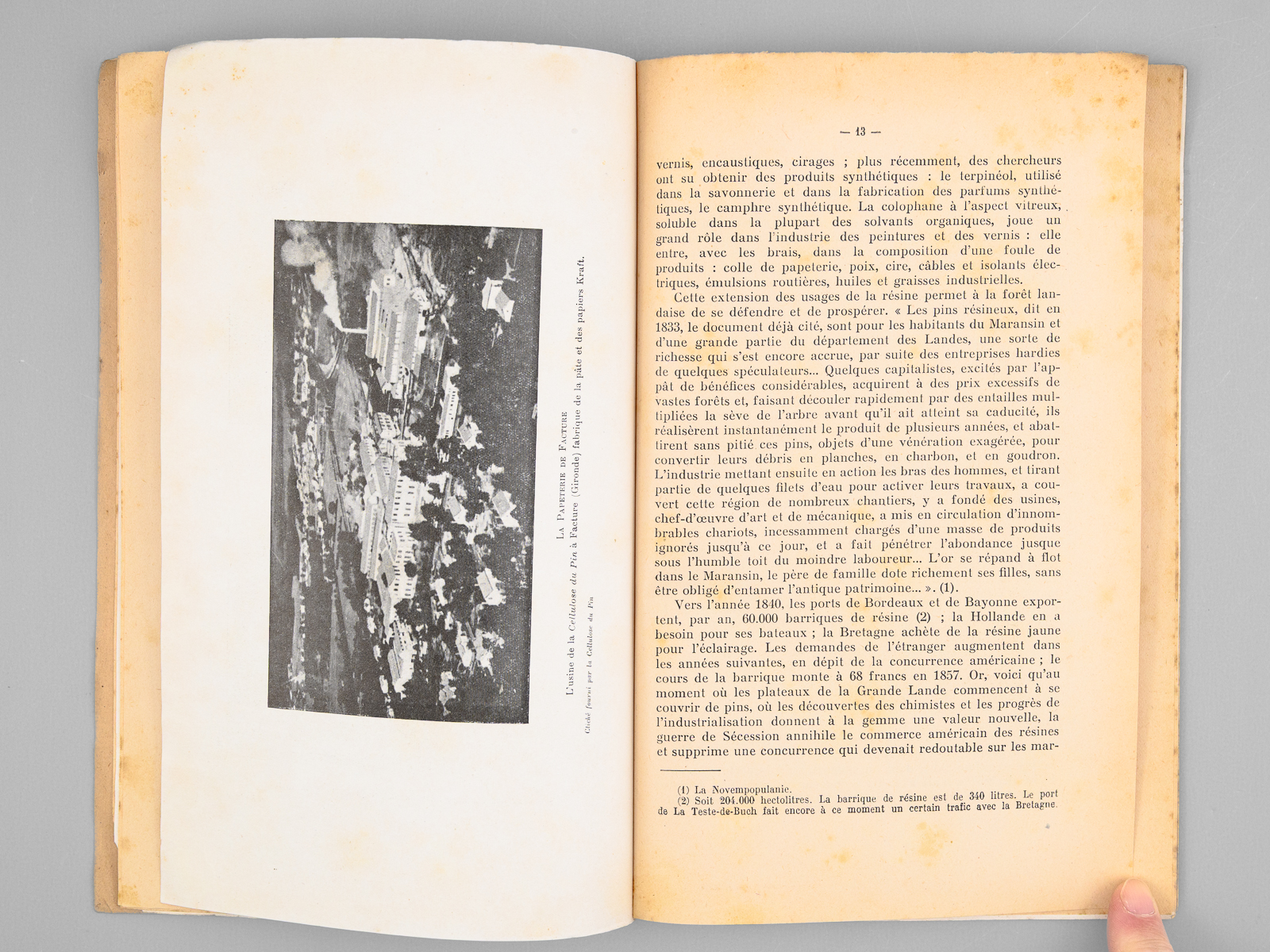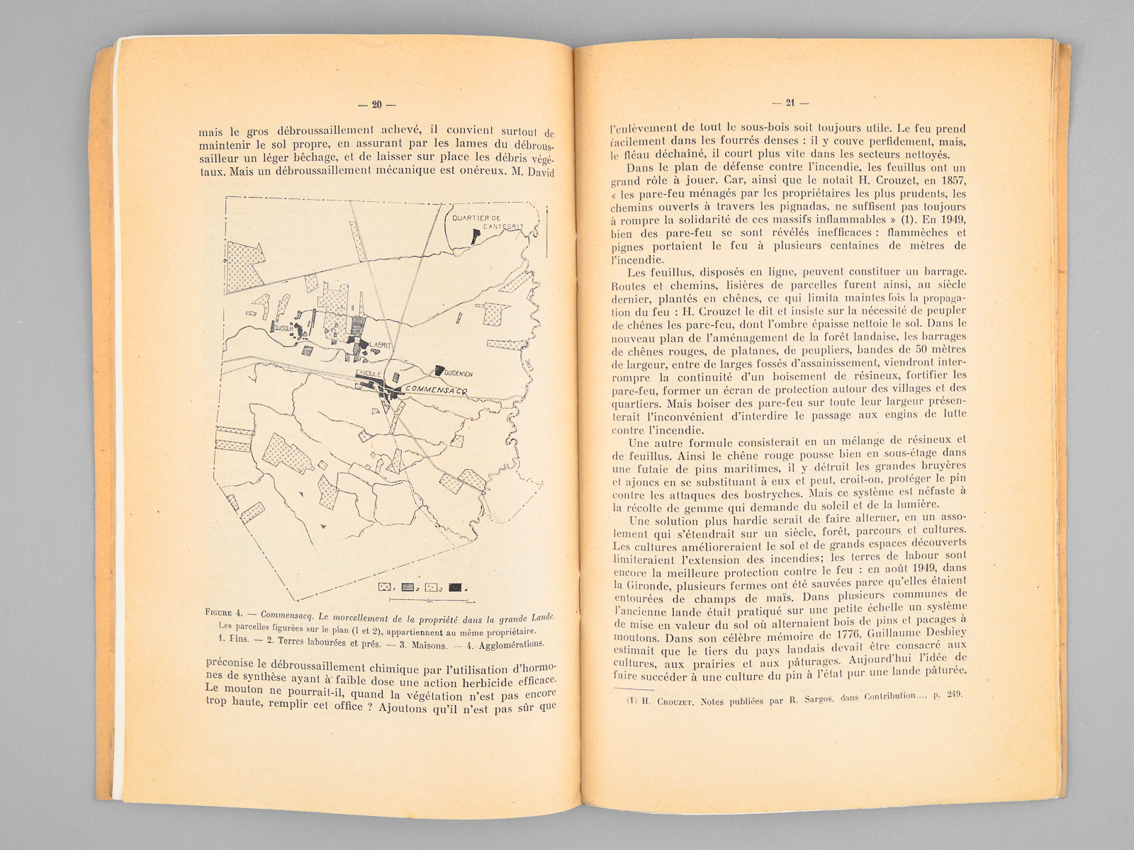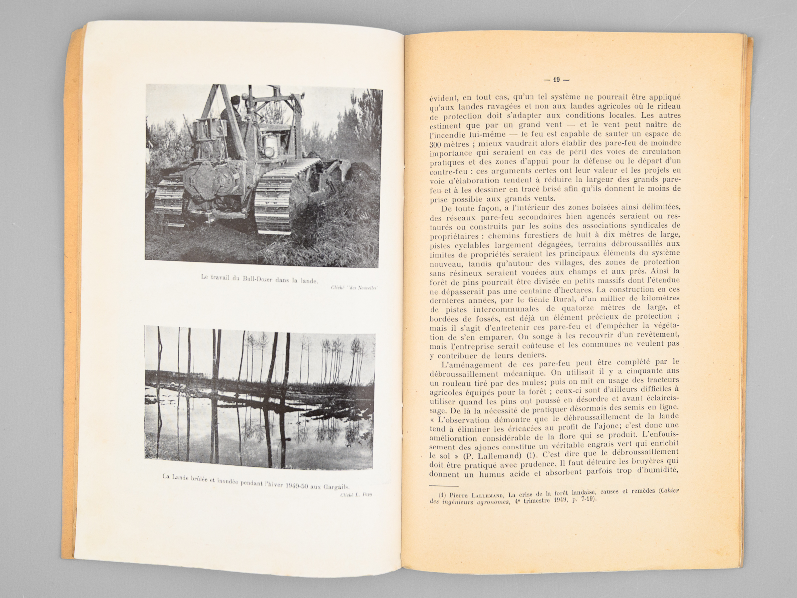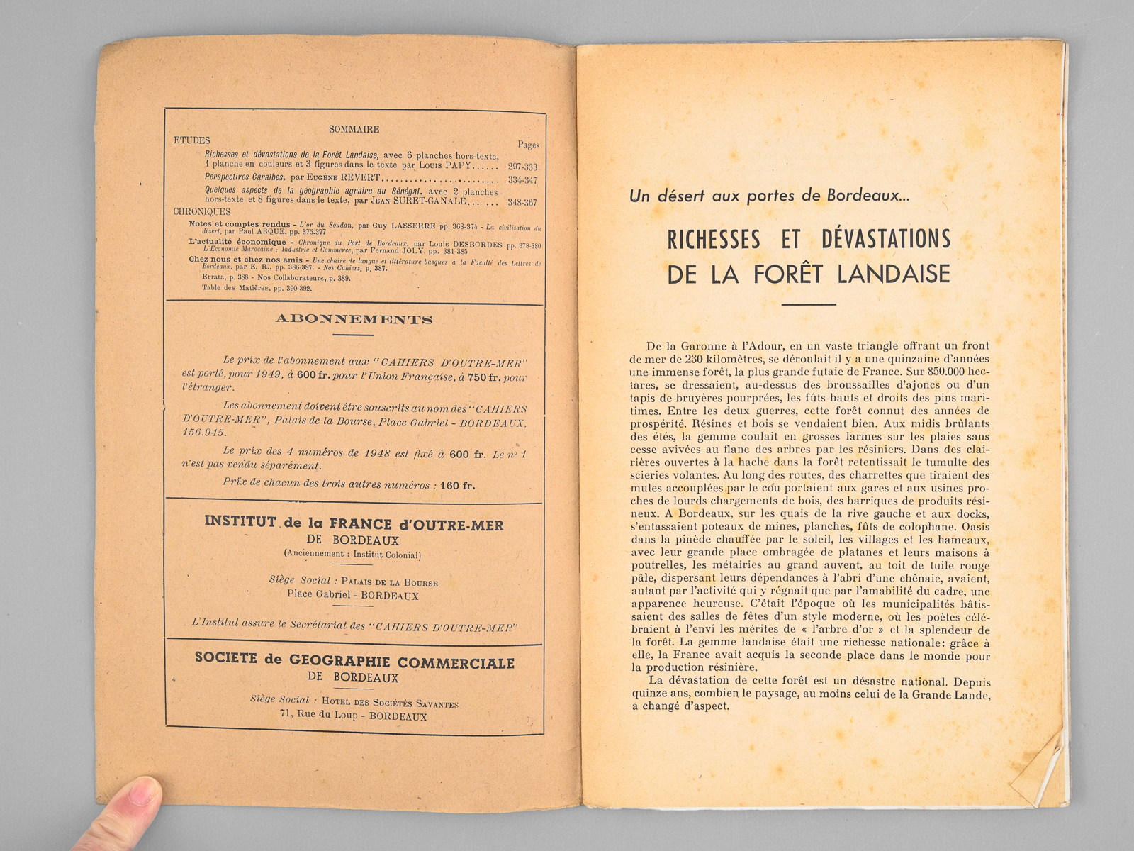2 brochures in-8, Extrait des Cahiers d'Outre-mer, 1948, Institut de la France d'Outre-Mer, Bordeaux, 37 pp. et 1950, 48 pp. Commentaire : Bon état pour ces deux tirés-à-part des importants articles de Louis Papy, le premier prémonitoire et le second rédigé au lendemain des terribles désastres de 1949 : 'en 1949, 130.000 hectares ont été parcourus par le feu dont 53.000 hectares de pins : le record de 1943 a été battu [ ... ] L'épisode le plus tragique de l'été 1949 fut l'incendie qui ravagea les landes girondines dans la seconde quinzaine d'août. [ ... ] La journée du 20 août fut tragique : la grande ville se trouva plongée dès 16 heures dans une nuit lourde d'angoisse, tandis que l'horizon embrasé de lueurs rougeoyantes évoquait une vision d'Apocalypse. [ ... ] Le vent soufflait aux approches de l'incendie avec une violence inouïe ; un vent né des appels d'air déterminés par le feu et non d'un cyclone issu du golfe de Gascogne, comme certains l'ont affirmé. Au centre des tourbillons, il fut, chargé de sable, capable d'arracher les écorces d'arbres et de donner, en quelques secondes, au bois qu'il burina, un aspect éolien [ ... ] Quatre-vingt-deux hommes périrent ce jour là dont on retrouva les corps calcinés, certains affreusement recroquevillés dans les fossés [ ... ]