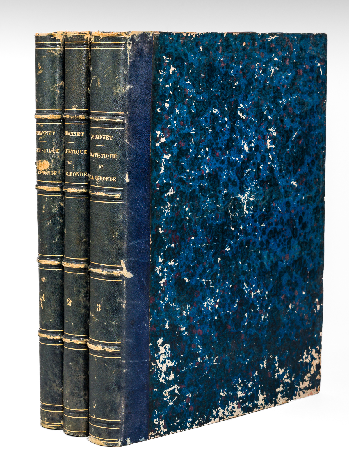 3 vol. in-4 reliure demi-chagrin à coins mauve, dos à 5 nerfs, double filet doré en mors et coins, Chez P. Dupont et Comp., Paris, Chez les Principaux Libraires, Bordeaux, 1837, 1839, 1843 (Vol. 1, 2 et 3) 2 ff., VII-429 pp. ; 3 ff., 411 pp. avec 4 planches hors texte (sur 2 ff.) ; 3 ff., V-458 pp., avec la grande carte dépliante de la Gironde