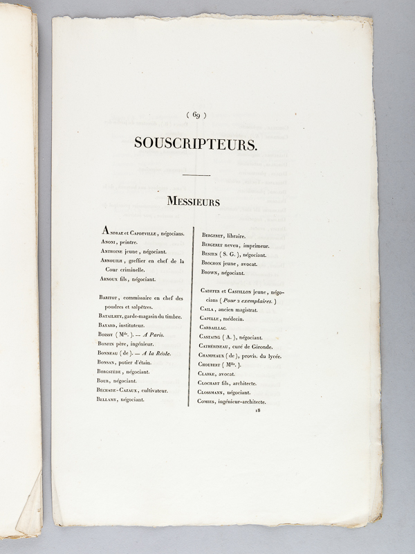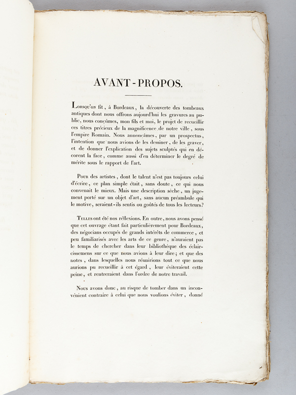 Feuillets in-folio, De l'Imprimerie de Bergeret Neveu, A Bordeaux, 1806, 4 ff., 72 pp. Commentaire : Exemplaire incomplet de l'édition originale, sans le titre gravé et sans les 6 planches hors texte. Peu commun. Prix en l'état (titre empoussierréet qq. plis, bon état par ailleurs).