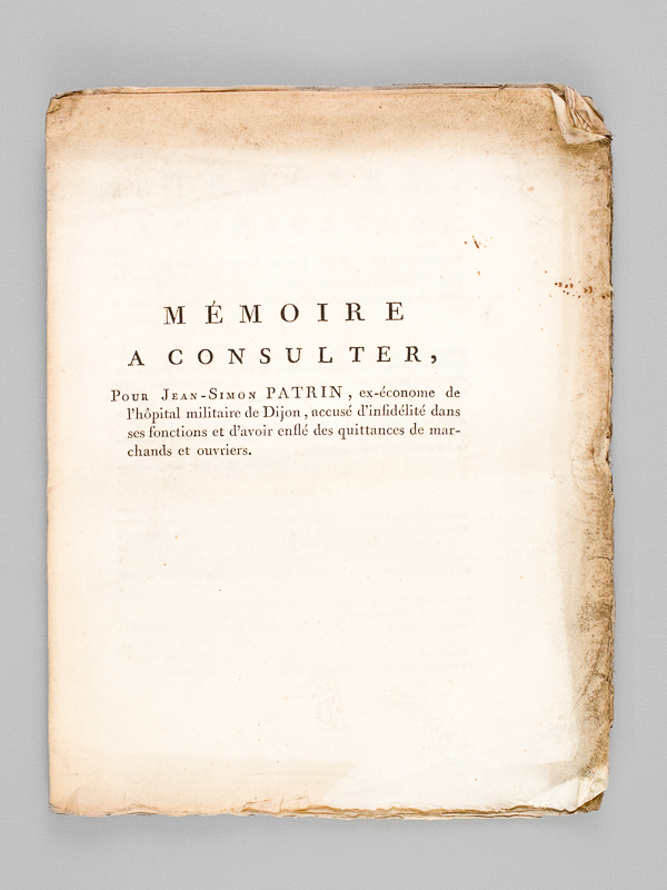 Mémoire à Consulter pour Jean-Simon Patrin, ex-économe de l'hôpital militaire de Dijon, accusé d'infidélité dans ses fonctions et d'avoir enflé des quittances de marchands et ouvriers [ Edition origin - Auteur: PATRIN - Année d'édition: 1802