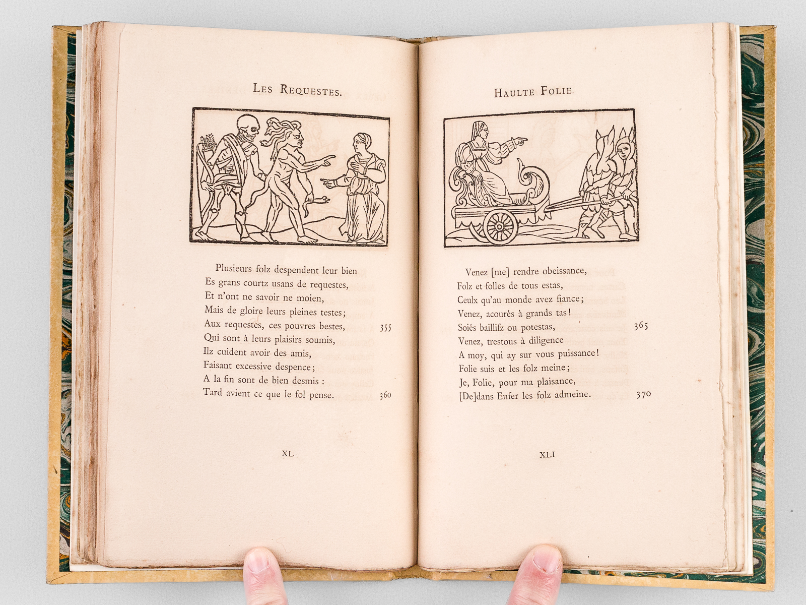 Et accompagnées d'une Introduction et d'un Glossaire, par Anatole de Montaiglon, un des 470 exemplaires sur papier de Hollande (n°356, après 3 sur peau de vélin, et 32 sur chine), 1 vol. in-8 cartonnage bradel postérieur imitation vélin, Chez Léon Willem, Paris, s.d. [circa 1879-1880 ], XVI-60 pp. Commentaire : Les gravures sur bois du 'Triomphe de haulte et puissante Dame Vérole', publié par F. Juste à Lyon en 1539, avaient été adaptées par l'éditeur lyonnais Antoine Volant pour cet ouvrage à visée d'édification. Bien qu'imprimée en caractères gothiques, l'édition de Volant semble avoir été publié avant 1555. Bon exemplaire (ff. un peu brunis, ex-libris Roland Thibaut).