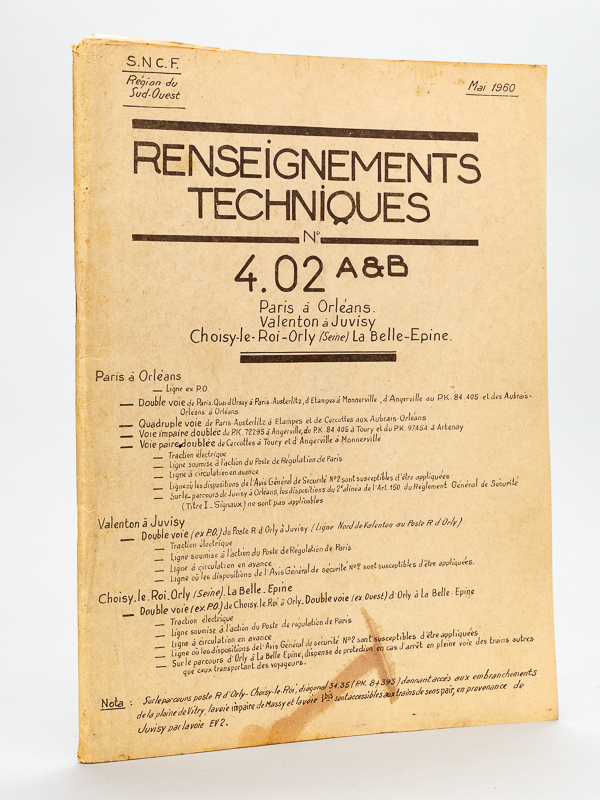 1 vol. in-4 br., 1960, 22, 55 et 20 pp. : Renseignements techniques N° 4.02 A&B Région du Sud-Ouest Mai 1960 : Paris à Orléans - Valenton à Juvisy - Choisy-le-Roi - Orly - La Belle-Epine [ Avec : ] Supplément au Fascicule-Horaires N° 4.02 A et B Service du 29 Mai 1960 [ Avec : ] Fascicule-Horaires N° 4.02 A (1re Partie) Paris-Austerlitz à Orléans. Poste R. d'Orly Service du 29 Mai 1960 modifié le 2 octobr 1960 Commentaire : Ces notices de renseignements techniques avec leurs fascicules horaires, très difficiles à dénicher, sont de remarquables mines d'information pour les vrais amateurs. Bon état