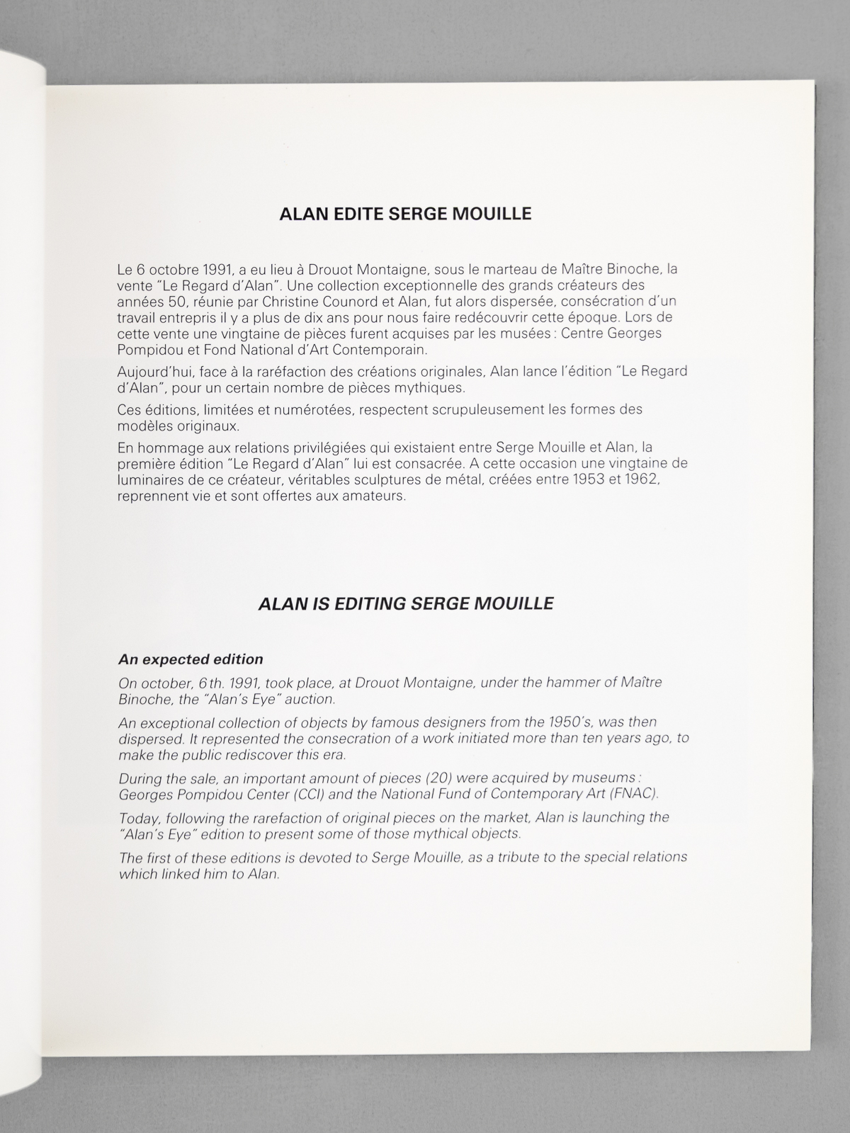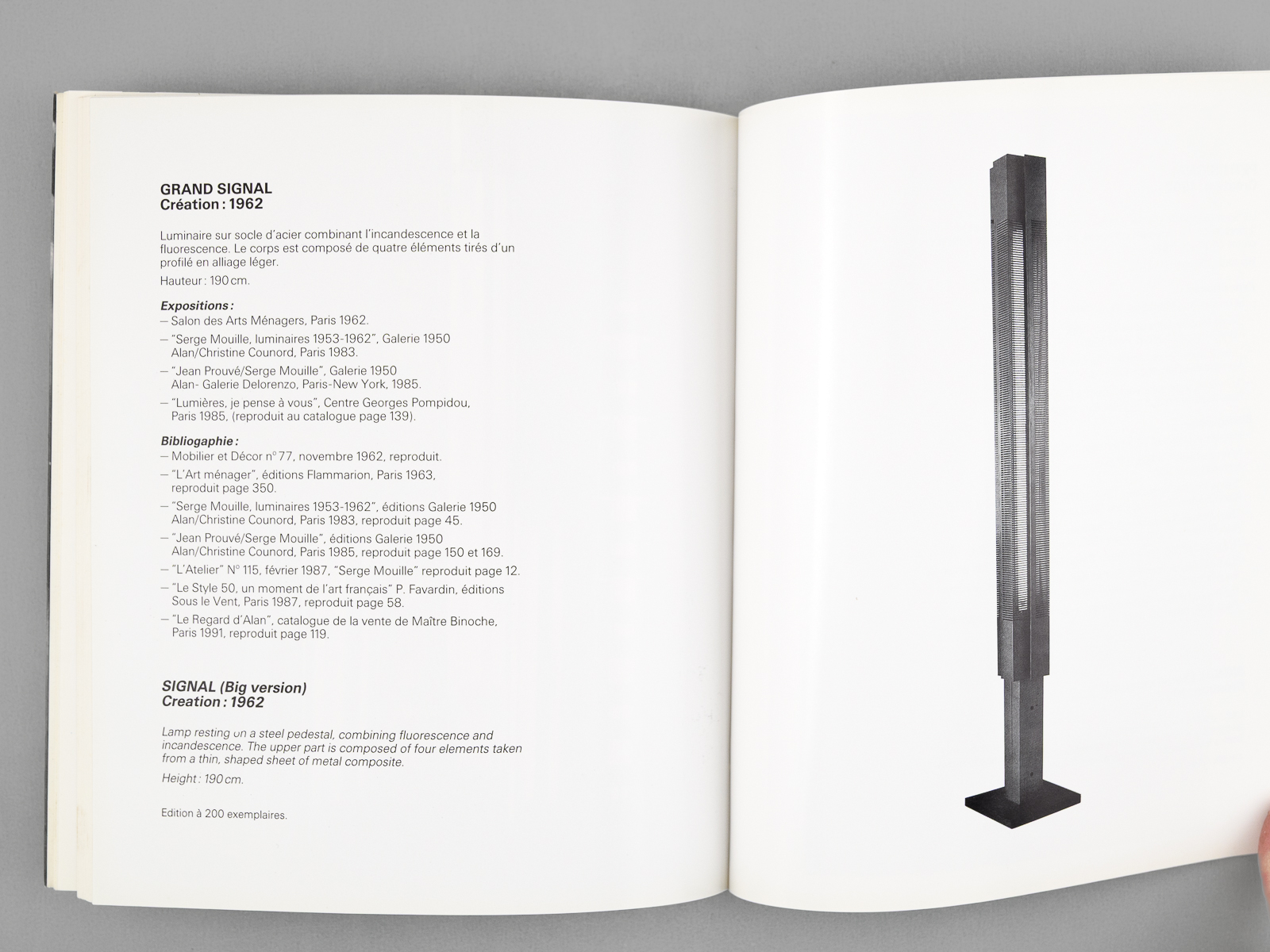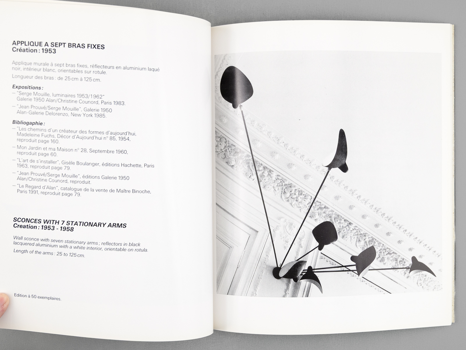 Commentaire : Très bon état pour ce catalogue d'une exposition organisée par le collectionneur et marchand d'art Alan (né en 1945), spécaliste des arts décoratifs. Cette exposition 'Serge Mouille luminaires 1953-1962' était la première exposition de l'artiste-orfèvre Serge Mouille (1922-1988). Cette première exposition fut suivie en 1985 d'une exposition, à Paris et New-York, intitulée '« Serge Mouille / Jean Prouvé deux maîtres du métal'