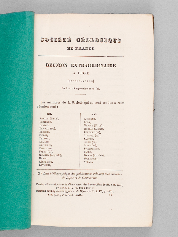 Réunion Extraordinaire à Digne (Basses-Alpes), du 8 au 18 septembre 1872. Société Géologique de France.