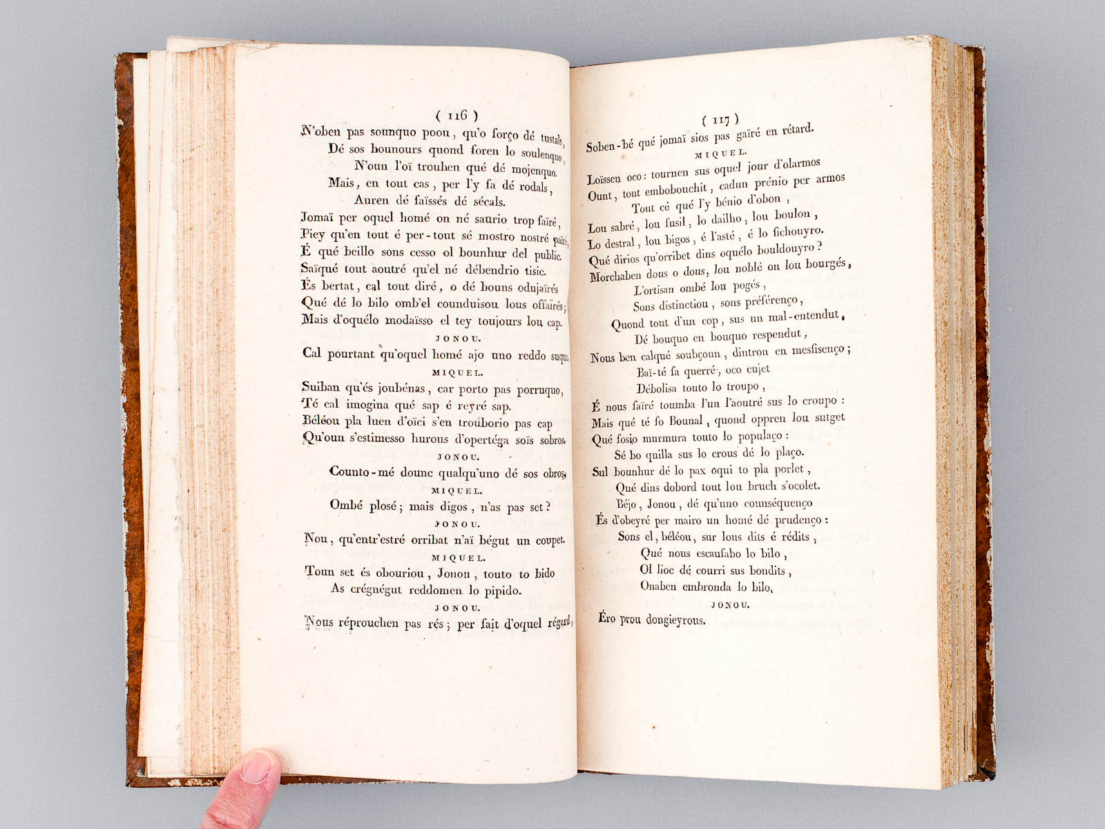 Quatrième édition, revue, corrigée et augmentée. On y a joint quelques pièces françaises du même auteur, 1 vol. in-8 reliure demi-basane marron, dos à 5 nerfs dorés orné, V. Carrère Jeune, Millau, 1823, 288 pp. avec portrait en frontispice Commentaire : Jean-Claude Peyrot (1709-1795) devient prieur de Pradinas en 1748, à la suite de son oncle Jean Peyrot de Courtines. Il publiera ses 'Poésies diverses patoises et française' en 1774, neuf ans après son retour à Millau. Bon état (reliure un peu frottée, frott. au second plat, qq. rouss.)