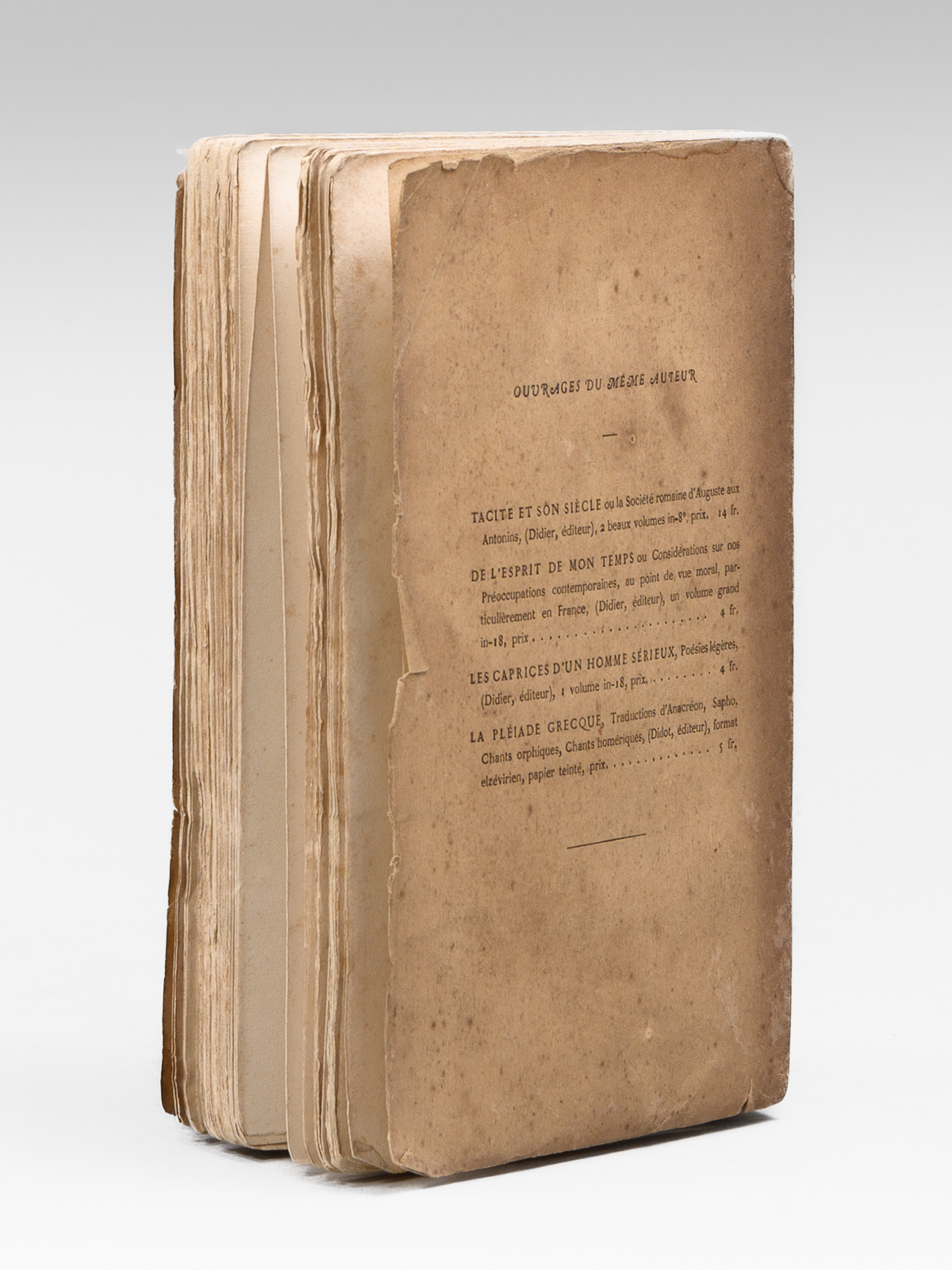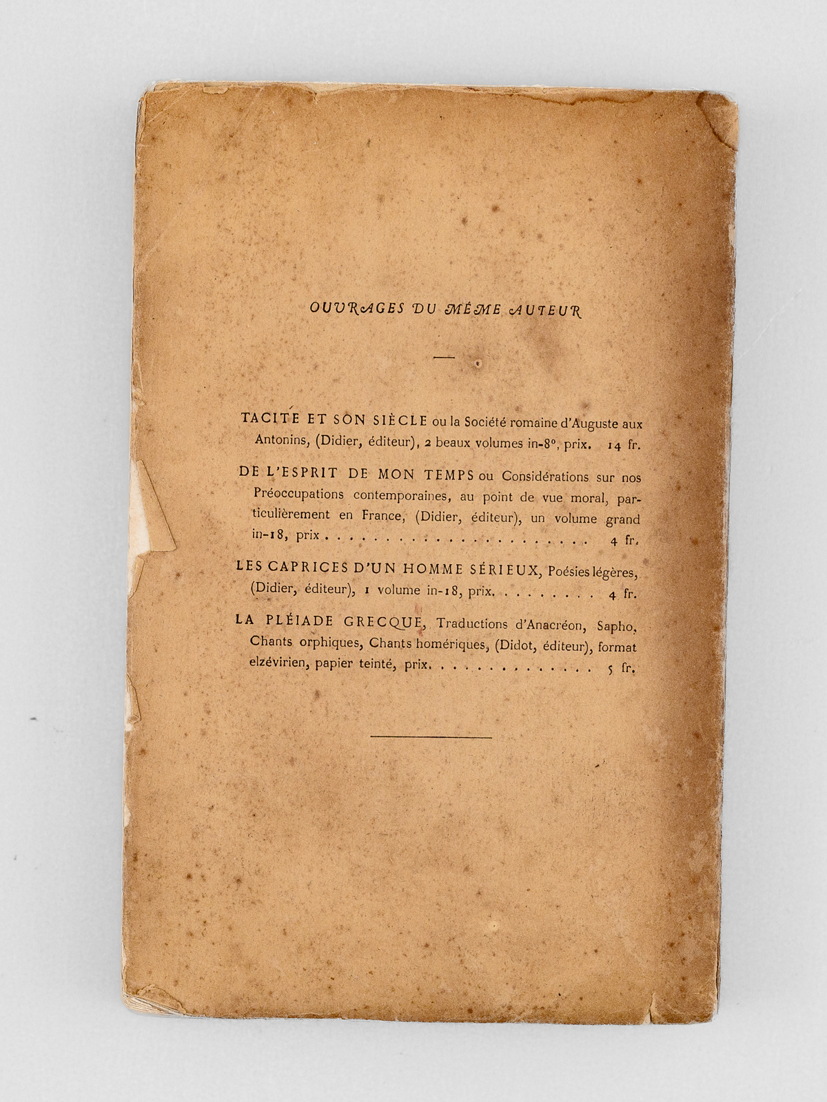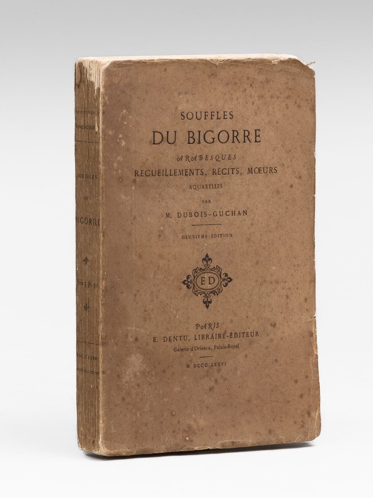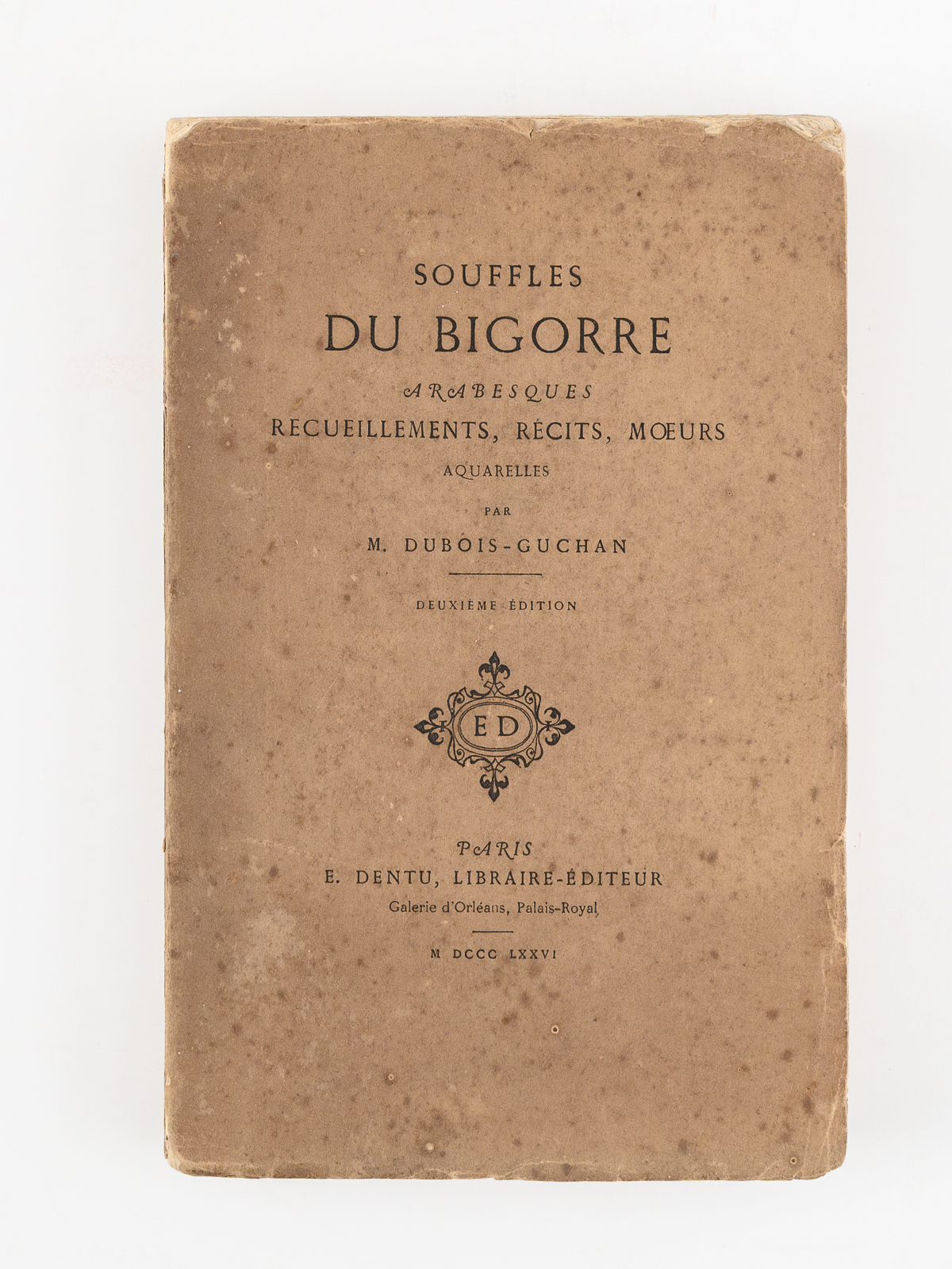 deuxième édition, 1 vol. in-12 br., E. Dentu, paris, M DCCC LXXXVI (1886), 306 pp. Commentaire : Etat satisfaisant (couv. frottée avec petit manque en haut de dos, bon état par ailleurs) pour ce recueil de poésie peu courant. L'édition originale de l'ouvrage était parue en 1875. L'auteur, originaire de Bagnères-de-Bigorre, fit un carrière dans le droit, d'abord comme avocat à Tarbes, puis comme magistrat. Dans le monde des lettres, il rédigea de nombreux poèmes et des ouvrages sur l'Empire romain. Son fils, Arthème Henri Gaston (1843-1897), archiviste paléographe diplômé de l'école des Chartes, légua la bibliothèque et les archives familiales à la ville de Bagnères. Ce fonds Dubois-Guchan est désormais géré par la médiathèque de Haute-Bigorre.
