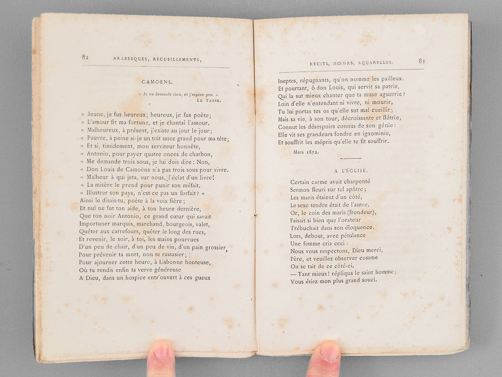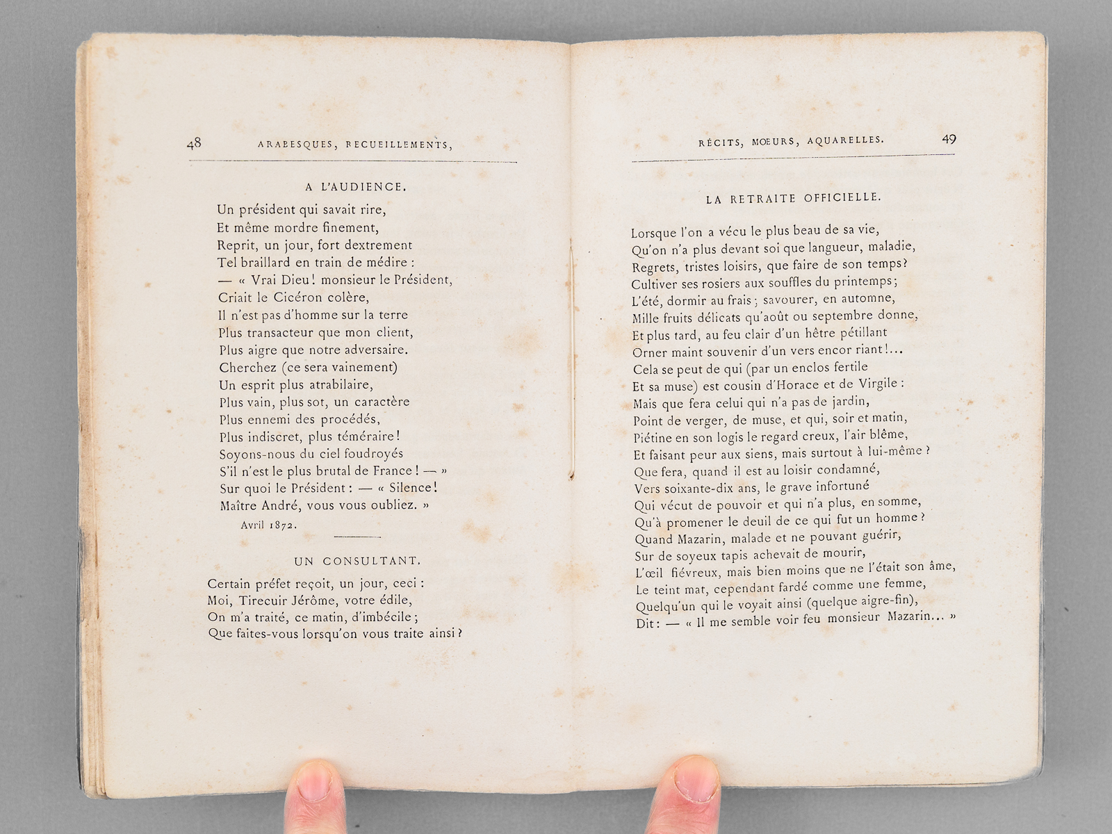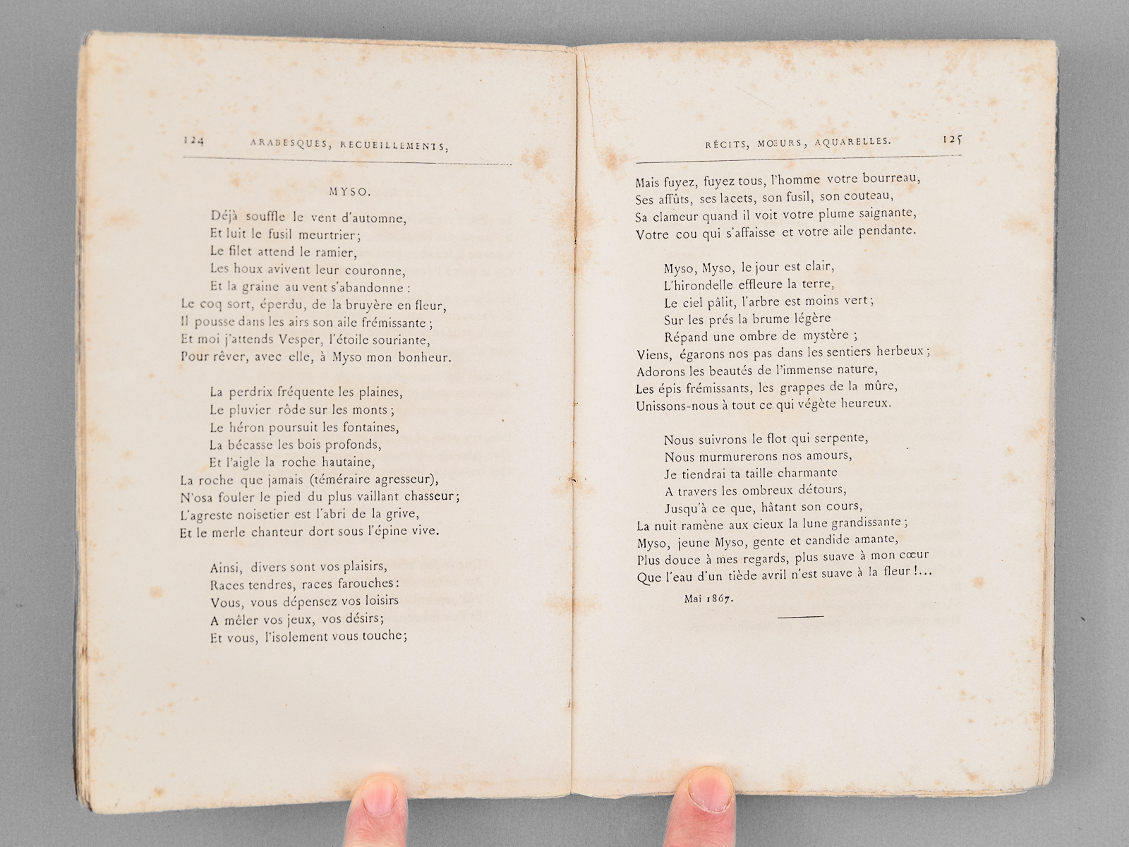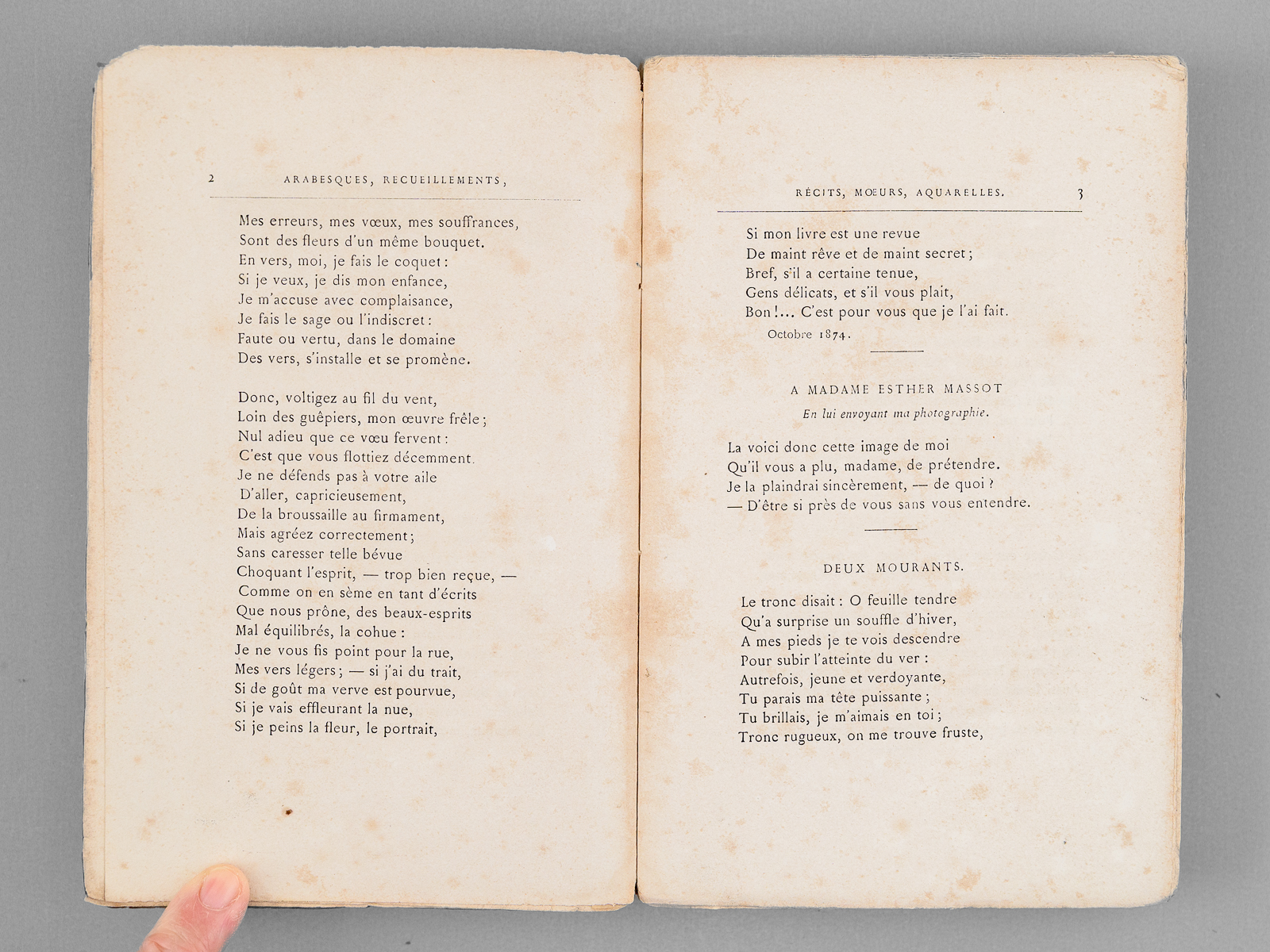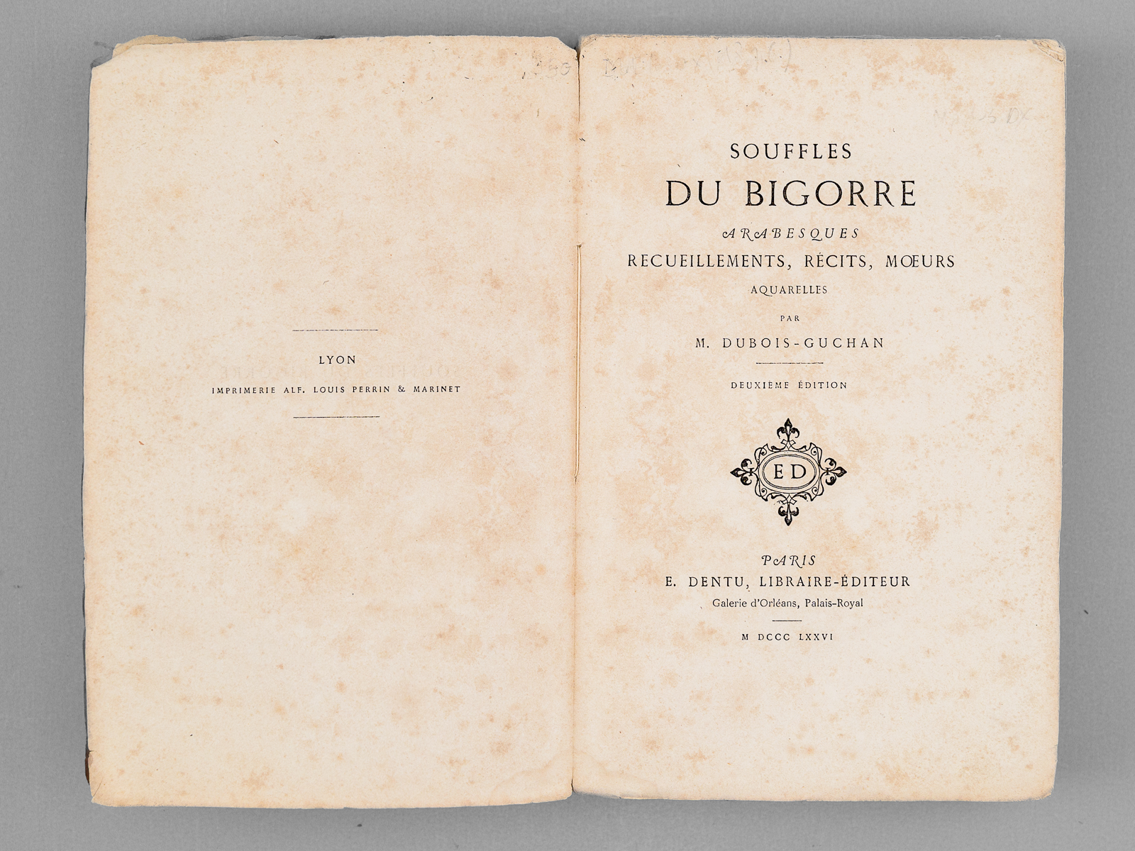 deuxième édition, 1 vol. in-12 br., E. Dentu, paris, M DCCC LXXXVI (1886), 306 pp. Commentaire : Etat satisfaisant (couv. frottée avec petit manque en haut de dos, bon état par ailleurs) pour ce recueil de poésie peu courant. L'édition originale de l'ouvrage était parue en 1875. L'auteur, originaire de Bagnères-de-Bigorre, fit un carrière dans le droit, d'abord comme avocat à Tarbes, puis comme magistrat. Dans le monde des lettres, il rédigea de nombreux poèmes et des ouvrages sur l'Empire romain. Son fils, Arthème Henri Gaston (1843-1897), archiviste paléographe diplômé de l'école des Chartes, légua la bibliothèque et les archives familiales à la ville de Bagnères. Ce fonds Dubois-Guchan est désormais géré par la médiathèque de Haute-Bigorre.