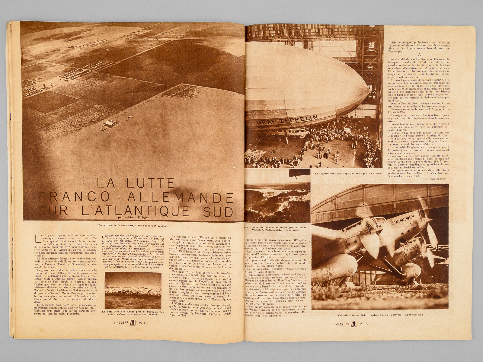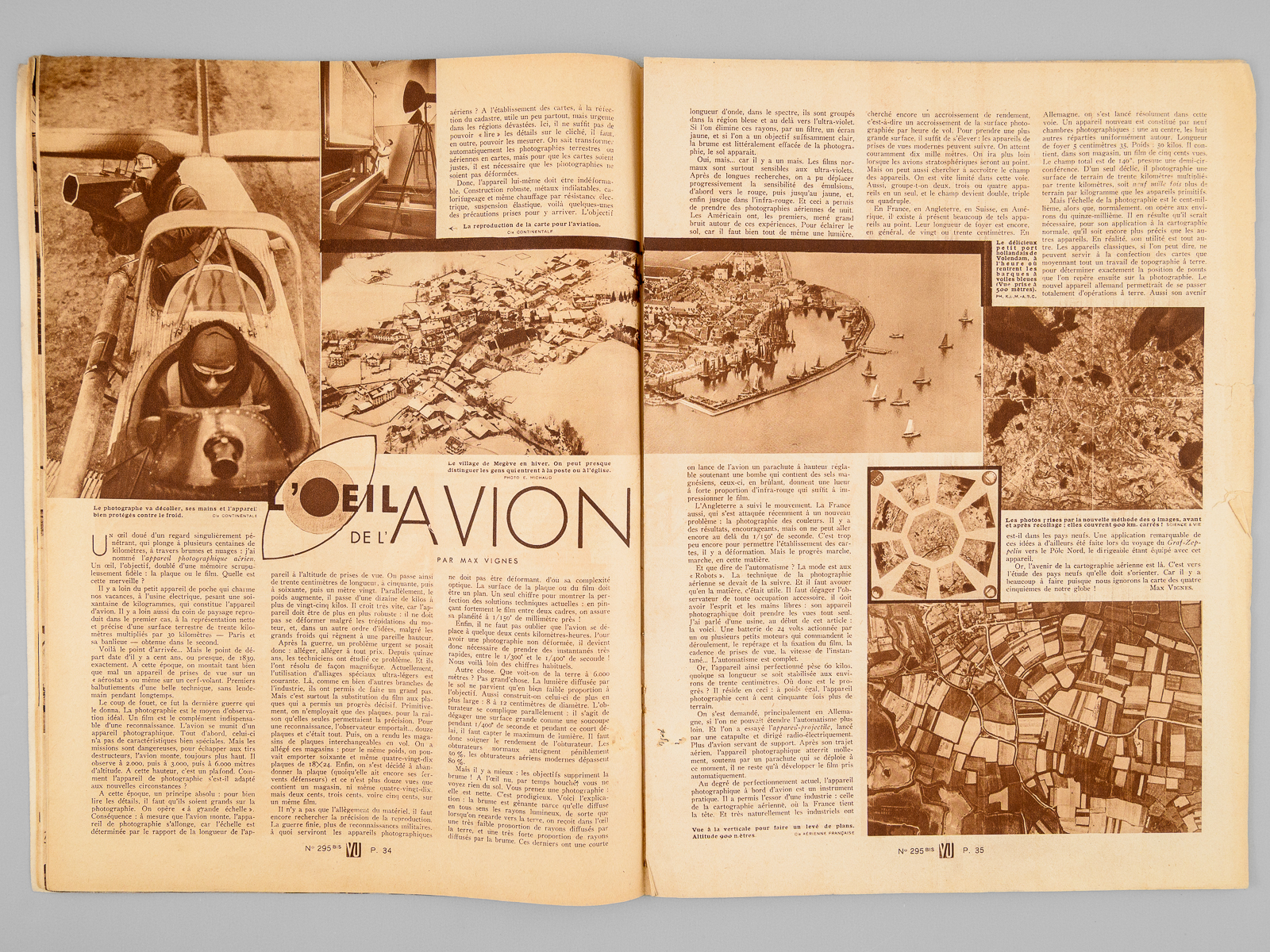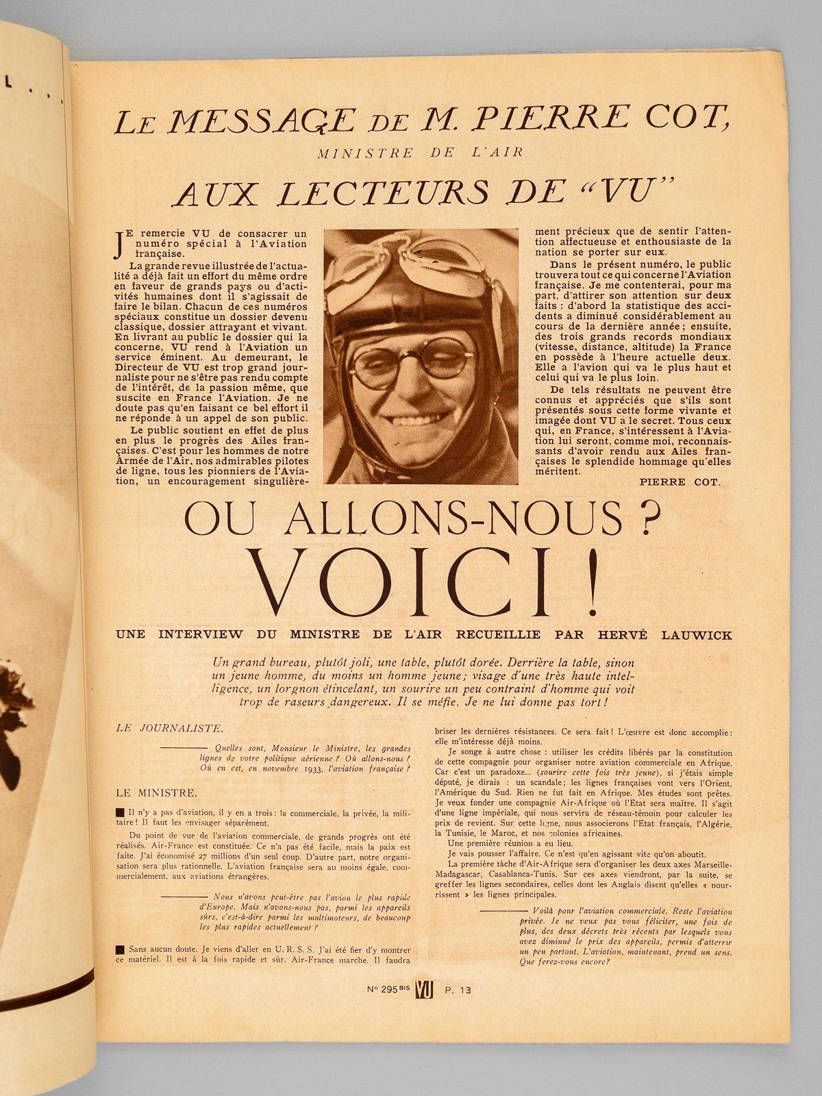 Commentaire : Etat très satisfaisant (cahier central débroché, bon état par ailleurs) pour ce hors-série du magazine Vu. Ce magazine, lancé en 1928 par Lucien Vogel (1886-1954), fut un précuseur des magazines d'actualité modernes, très illustrés. Contient notamment : Où allons-nous ? Une interview du Ministre de l'Air, Pierre Cot ; L'aviation française va renaître ; Les puissances nationales comparées ; L'avion-Canon ; L'oeil de l'avion ; Urbanisme et aviation ; La lutte franco-allemande sur l'Atlantique sud ; URSS, la propagande de l'aviation et l'aviation de propagande.