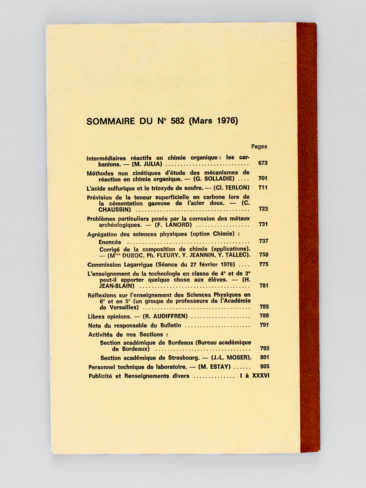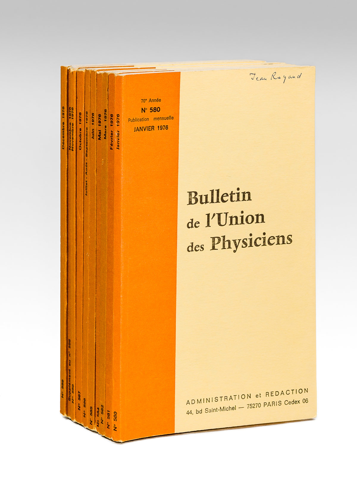 10 vol. in-12 br., Union des Physiciens - Association de professeurs de Physique et de Chimie, Paris, , pp. 385 à 1383 et de pp. 1 à 429. Commentaire : Etat très satisfaisant (petit ex libris ms. en coin de couv., bon état par ailleurs). Prix pour l'ensemble. Au sommaire notamment : la notion de masse en relativité : invariance et non conservation ; les problèmes d'environnement et de localisation liés à l'implantation d'une centrale nucléaire ; l'utilisation du hasard en physique ; initiation aux techniques de spectroscopie interférentielle ; les calculatrices électroniques et les sciences physiques ; intermédiaires réactifs en chimie organique, les carbanions ; méthode non cinétique d'étude des mécanismes de réaction en chimie organique ; l'acide sulfurique et le trioxude de soufre ; agrégation des sciences physiques, option chimie ; la structure spirale des galaxies ; la matière interstellaire ; CAPES, Session de 1975 ; les cristaux liquides et leurs applications ; la prospection électrique du sous-sol ; l'organisation scientifique du travail au laboratoire d'enseignement ; le soleil au service de l'homme ; problèmes physiques et économiques liés à l'utilisation de l'énergie solaire ; sur le principe de symétrie en mécanique classique ; aspects modernes des gyroscopes ; l'école française de magnétisme ; matériaux durs pour aimants permanents ; sujets des baccalauréats de technicien de 1976 ; la pompe à chaleur ; le refroidissement thermo-électrique