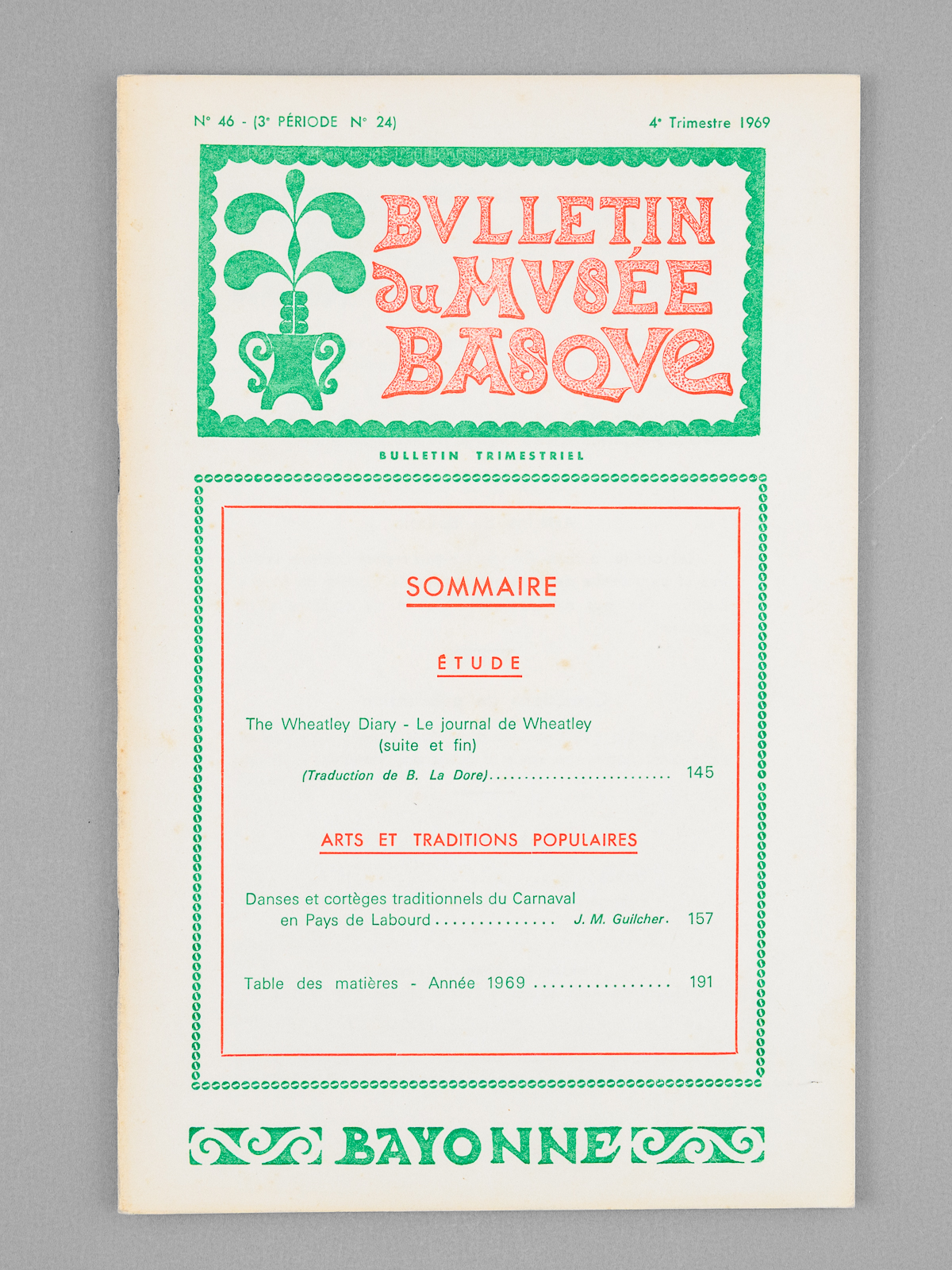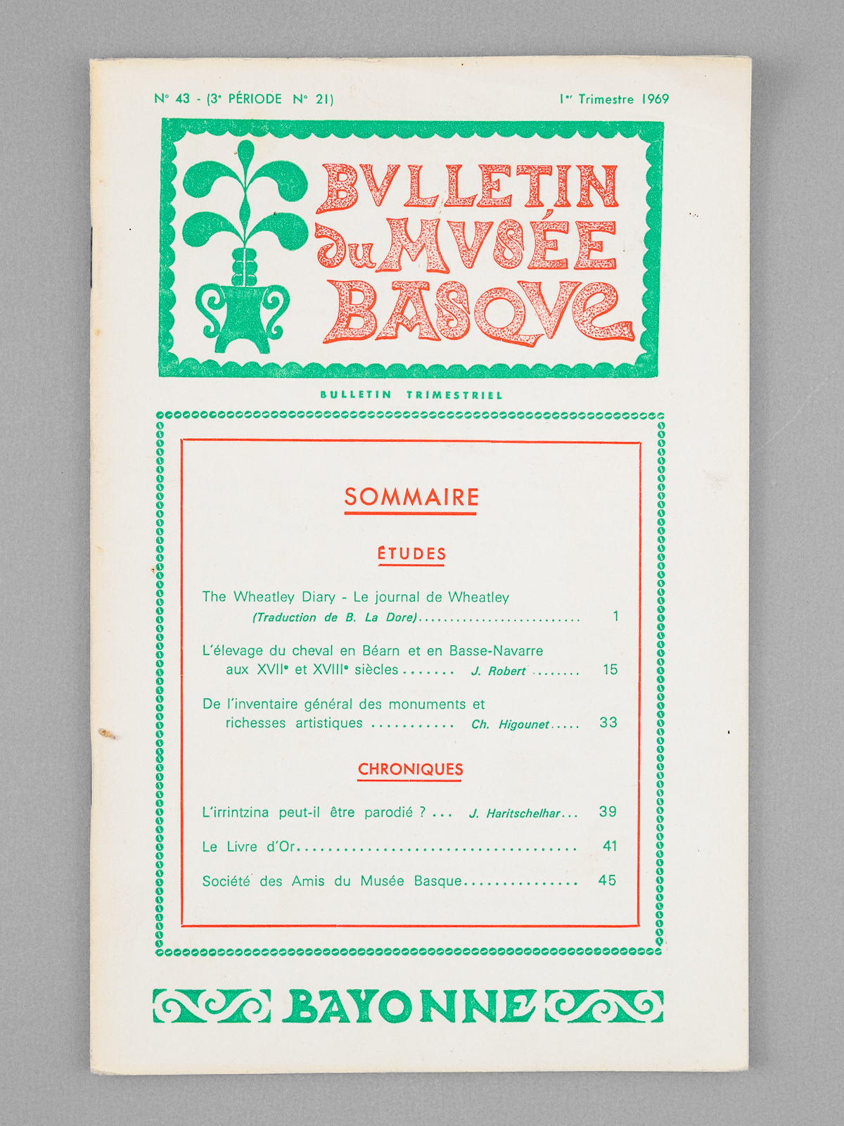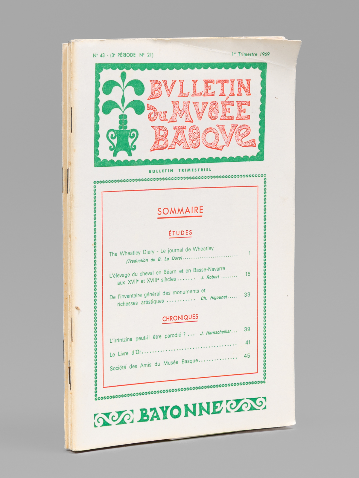 4 vol. in-12 br., Bulletin du Musée Basque, 1969, 192 pp. Commentaire : Bon état. Au sommaire : The Wheatley Diary - Le journal de Wheatley ; L'élevage du cheval en Béarn et en Basse-Navarre aux XVIIe et XVIIIe siècles ; De l'inventaire général des monuments et richesses artistiques ; [Chroniques :] L'irrintzina peut-il être parodié ?; Le droit d'asile de la Souveraineté de Bidache ; [Chroniques :] Revue des revues (année 1968) ; [Arts et traditions populaires :] Danses et cortèges traditionnels du Carnaval en Pays de Labourd ; Table des matières - Année 1969