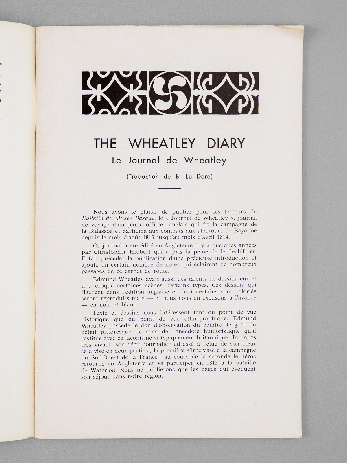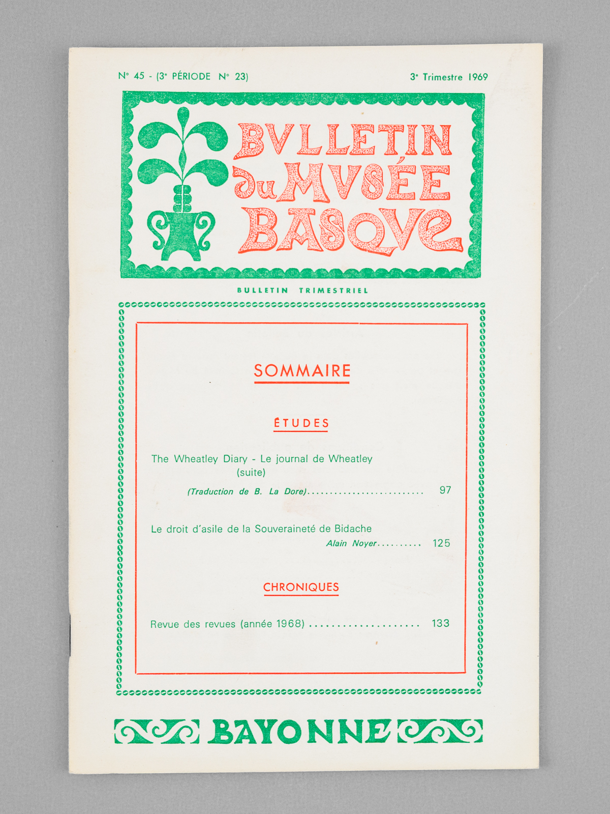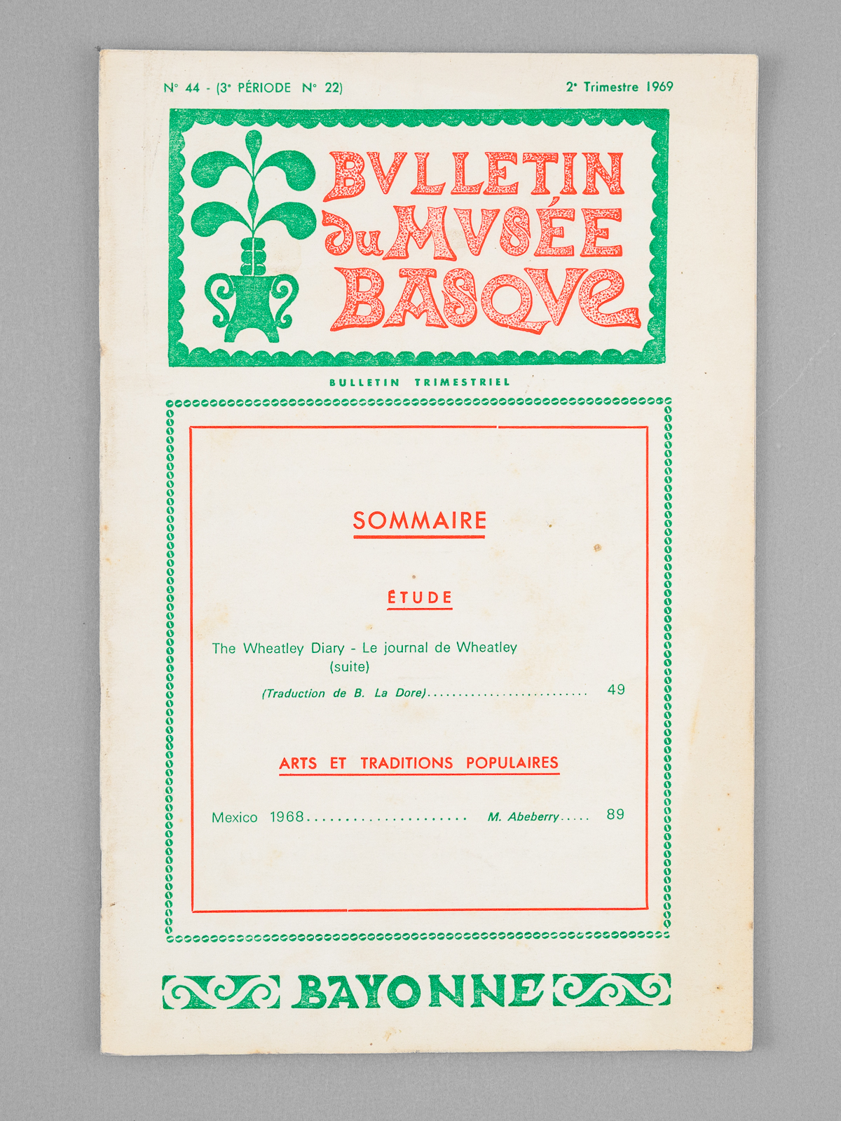4 vol. in-12 br., Bulletin du Musée Basque, 1969, 192 pp. Commentaire : Bon état. Au sommaire : The Wheatley Diary - Le journal de Wheatley ; L'élevage du cheval en Béarn et en Basse-Navarre aux XVIIe et XVIIIe siècles ; De l'inventaire général des monuments et richesses artistiques ; [Chroniques :] L'irrintzina peut-il être parodié ?; Le droit d'asile de la Souveraineté de Bidache ; [Chroniques :] Revue des revues (année 1968) ; [Arts et traditions populaires :] Danses et cortèges traditionnels du Carnaval en Pays de Labourd ; Table des matières - Année 1969