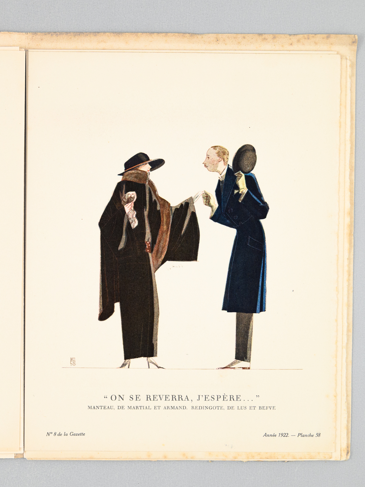 Commentaire : Manquent 4 planches en couleurs (par Brissaud, Marty et Barbier) et 2 croquis de mode. Les planches suivantes sont bien présentes : Les Cinq Sens. Le Goût, par Pierre Mourgue ; On se reverra j'espère par Benito ; Une robe de Madeleine Vionnet par Thayaht et La promeneuse mélancolique par George Barbier. Huitième numéro de l'année 1922 de cette très remarquable revue de grand luxe, essentielle pour la connaissance de la mode, et à laquelle collaborèrent les tous meilleurs artistes de l'époque. Les illustrations en couleurs, dans le texte ou hors-texte, sont toujours magnifiques et d'un coloris très vif, restituant avec éclat les plus belles créations de Cheruit, Paul Poiret, Doucet, Redfern, Worth, Paquin, etc. Parmi les articles de ce numéro : 'Les Statues d'or' par Masson, 'La poudre et les Bals' par Celio, 'les Fichus' par Siki, 'La femme triomphante' par George Cécil, 'Le Lamé et le Velours' par Vaudreuil, etc... Prix en l'état pour cet exemplaire incomplet de 4 planches en couleurs et 2 croquis (manquent 4 planches en couleurs et 2 croquis en couleurs, rares rouss., bon exemplaire par ailleurs).