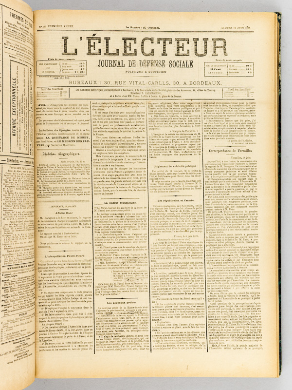 Commentaire : Le journal bordelais 'l'électeur' sera absorbé en 1885 par le 'Nouvelliste de Bordeaux'. Etat satisfaisant (reliure un peu faible, couv. lég. frottée)