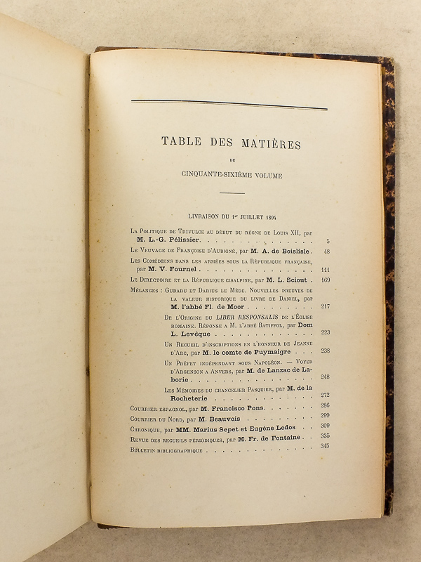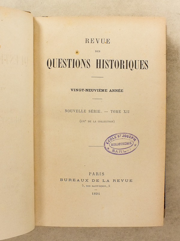 1 vol. in-8 rel. demi-basane fauve, dos à 4 faux nerfs, Bureaux de la Revue , Paris, 1894 , 671 pp. Contient les 2 livraisons des 1er juillet 1894 et 1er octobre 1894. Avec en particulier les articles suivants : La politique de Trivulce au début du règne de Louis XII (L.-G. Pélissier) ; Le veuvage de françoise d'Aubigné (A. de Boislisle) ; Les comédiens dans les armées sous la République Française (V. Fournel) ; Le Directoire et la République Cisalpine (L. Sciout) ; Le paganisme au milieu du IVe siècle - Situation légale et matérielle (Paul Allard) ; Catherine de Médicis et les politiques (Comte de La Ferrière) ; Une invasion en France sous Louis XIII (Octave Vigier) ; Un grand diocèse d'autrevois - Organisation administrative et financière (abbé Ernest Allain) ; Commentaire : Etat très satisfaisant (anciens cachets et étiq. intérieures d'instit. relig,, petits mques en haut de couv., erreur de tomaison sur dos, bon état par ailleurs). Poids de 1,1 Kg.