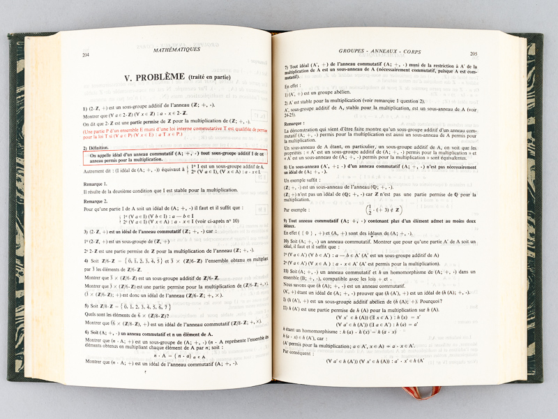 1 vol. in-8 reliure de l'époque demi-maroquin vert, dos à 5 nerfs, reliure signée de Farairre, cours de mathématiques sous la direction de Yves Peureux, Sochepress, Casablanca, 1969, 473 pp. Commentaire : Bel exemplaire très bien relié, provenant de la bibliothèque de l'auteur.
