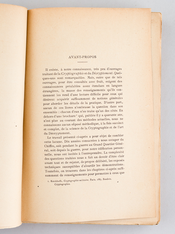 Commentaire : Bon état. Après un long exposé historique, l'ouvrage présente la cryptographie par lettres et chiffres (dont le système de Richelieu, la méthode de Jules César, celles de Kasiski, Kerckhofts ou Bazeries), puis la cryptographie par 'Figures et Symboles'.
