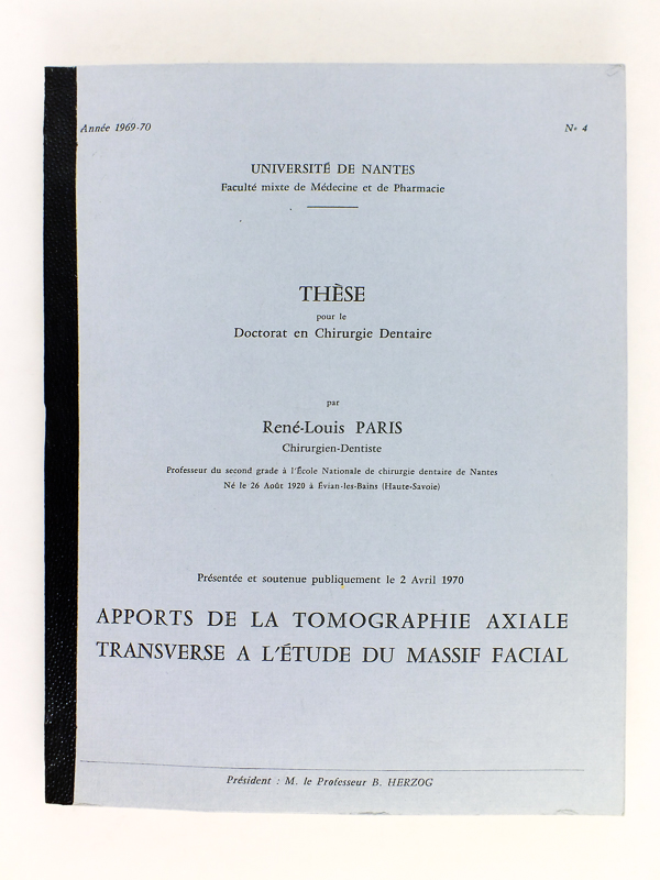 Apports de la tomographie axiale transverse à l'étude du massif facial. Thèse pour le Doctorat en Chirurgie Dentaire présentée et soutenue publiquement le 2 avril 1970. Université de Nantes. - Auteur: PARIS, René-Louis - Année d'édition: 1970