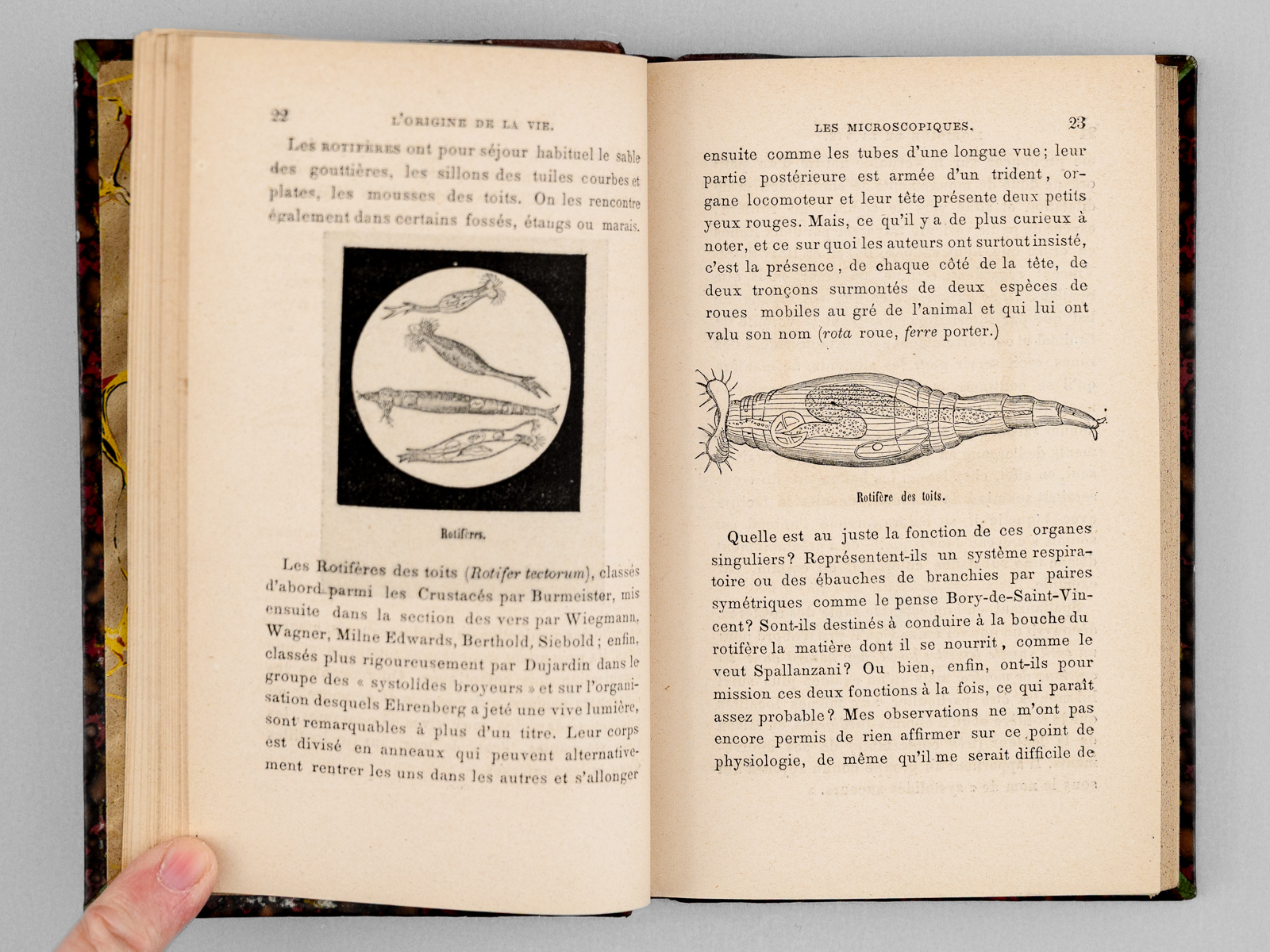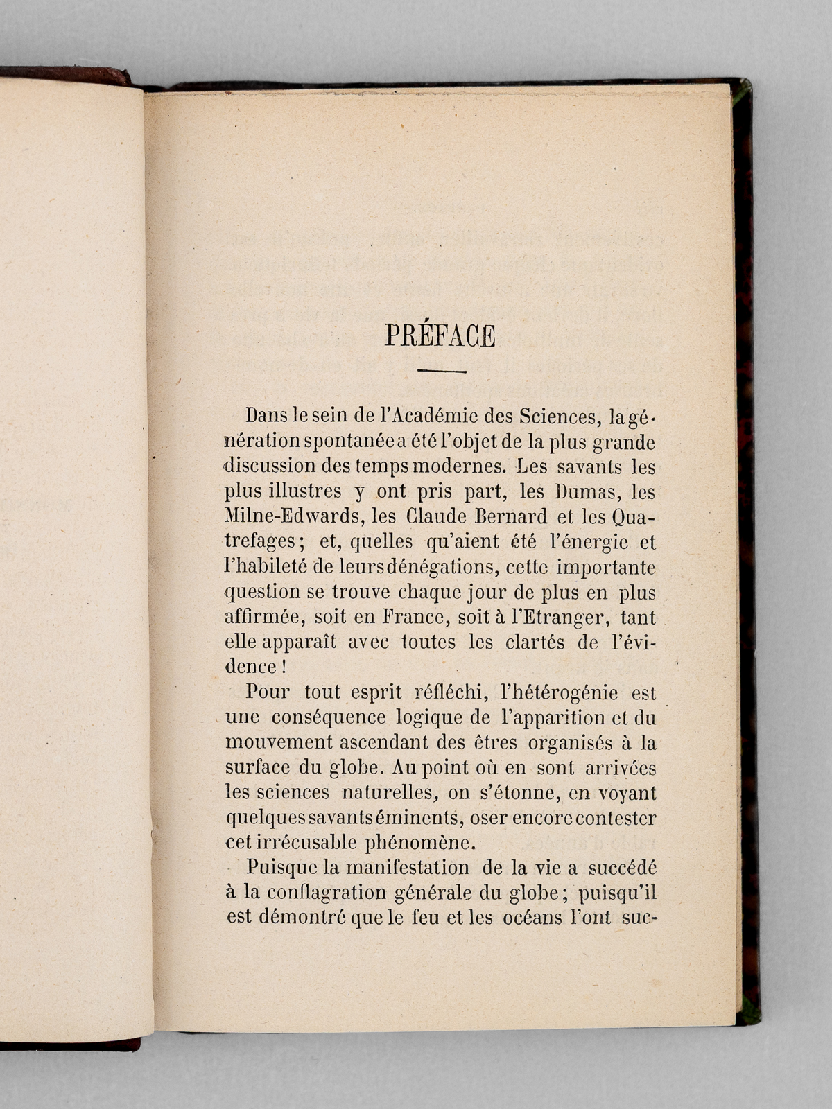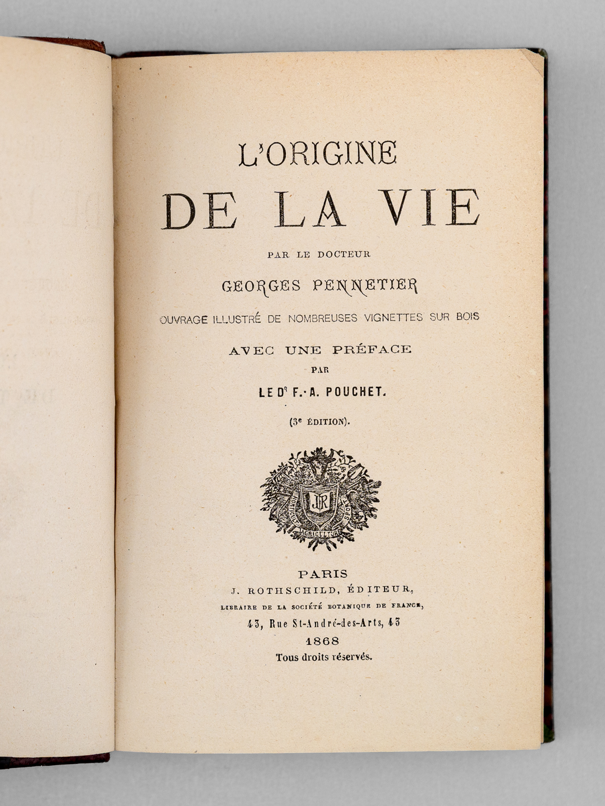 Ouvrage illustré de nombreuses vignettes sur bois, avec une préface par le Dr. F.-A. Pouchet, 3e édition, 1 vol. in-18 reliure de l'époque demi-maroquin brun, dos à 5 nerfs orné, J. Rotschild, Paris, 1868, XXI-303 pp. et 1 f. Commentaire : Le docteur Georges Pennetier (1836-1923) sera conservateur du muséum d'histoire naturelle de Rouen de 1873 à 1923. Bon état (dos lég. passé, très bon état par ailleurs) pour cet ouvrage peu commun, préfacé par le docteur Pouchet, l'un des découvreurs du mécanisme de l'ovulation chez les mammifères, partisan d'une théorie de la génération spontanée et adversaire des thèses de Pasteur.