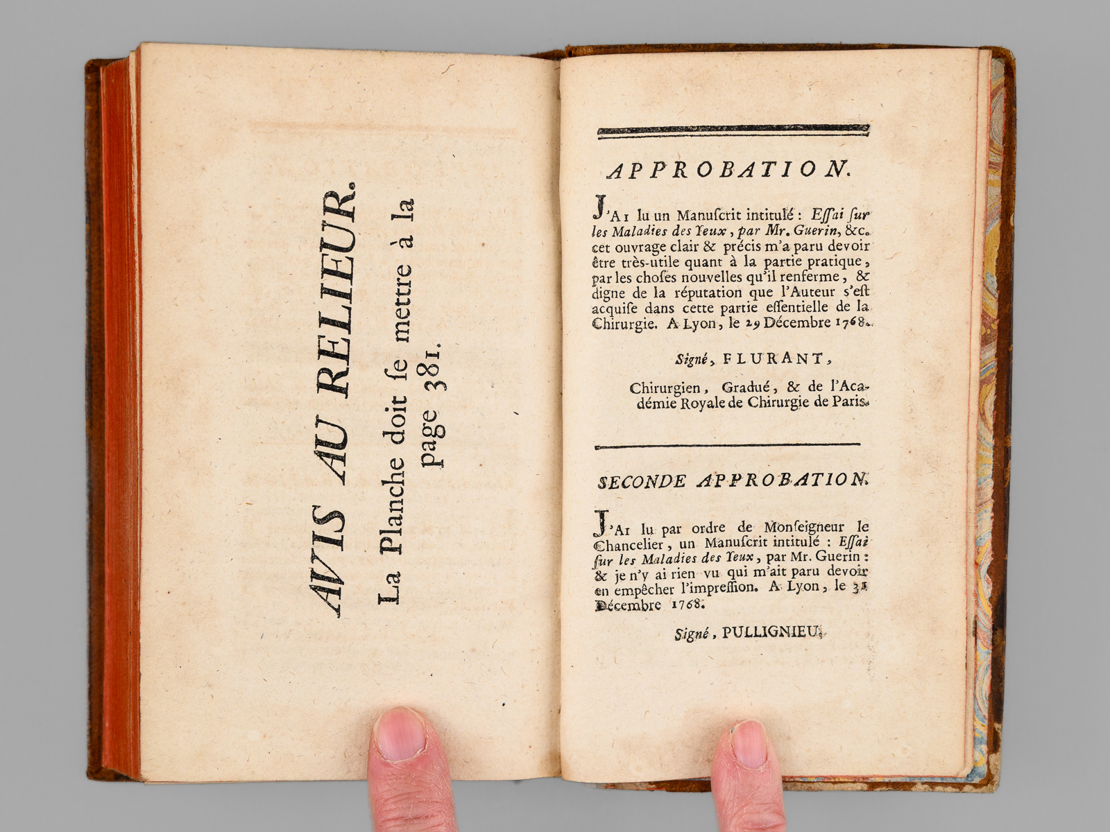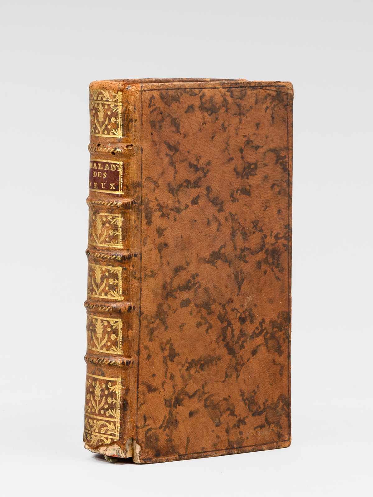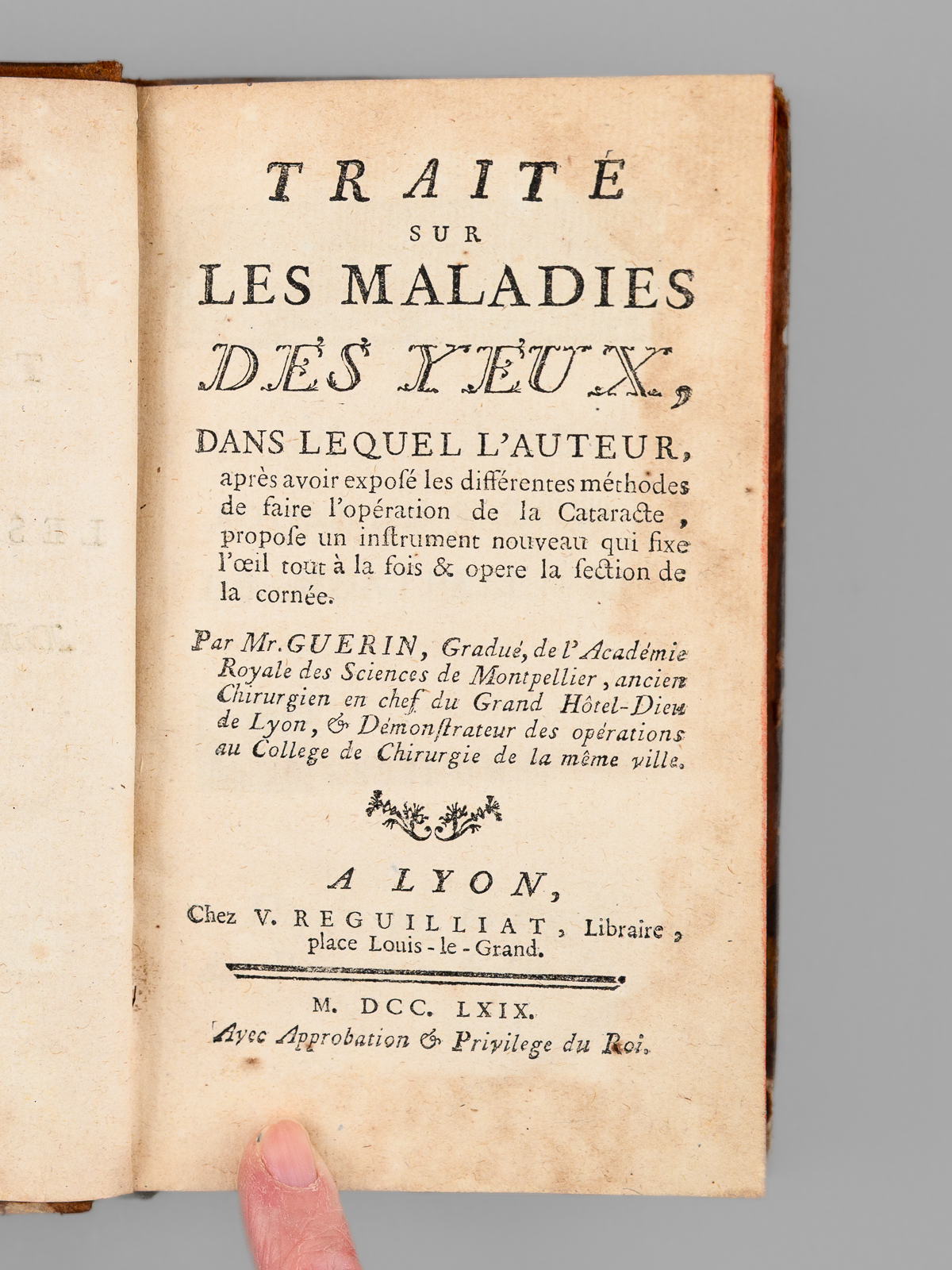 Par Mr. GUERIN, Gradué, de l'Académie Royale des Sciences de Montpellier, ancien Chirurgien en chef du Grand Hôtel-Dieu de Lyon, & Démonstrateur des opérations au Collège de Chirurgie de la même villen 1 vol. in-12 reliure de l'époque pleine basane marbrée, dos à 5 nerfs orné, Chez V. Reguilliat, Lyon, 1769, 445 pp. et 3 ff. Commentaire : La planche dépliante reproduit l'instrument chirurgical développé par l'auteur pour l'opération de la cornée. Etat satisfaisant (important mq. au dos en queue, trois piq. de vers sur un nerf, coins un peu frottés, bon état intérieur).