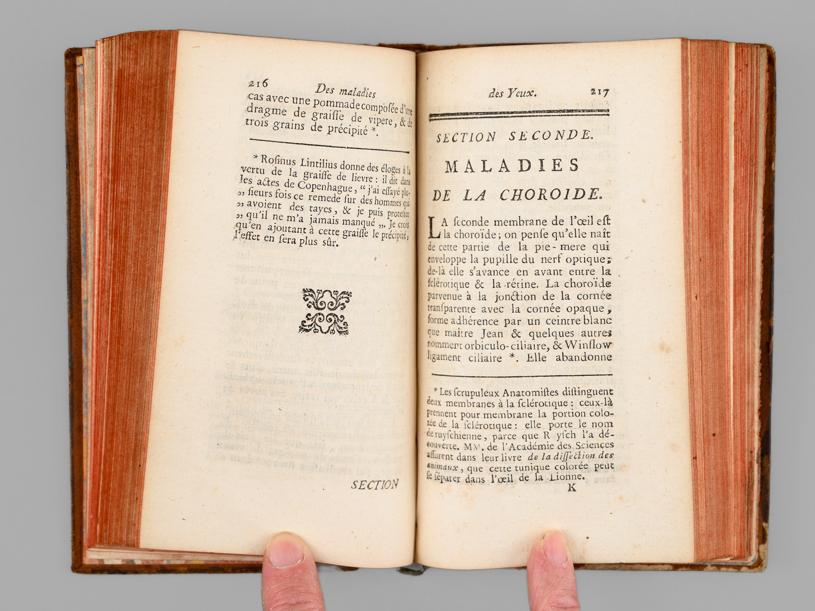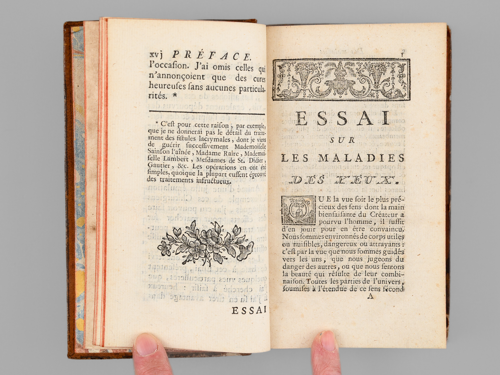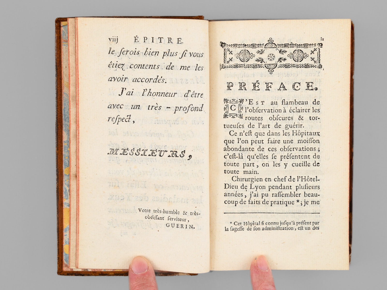 Par Mr. GUERIN, Gradué, de l'Académie Royale des Sciences de Montpellier, ancien Chirurgien en chef du Grand Hôtel-Dieu de Lyon, & Démonstrateur des opérations au Collège de Chirurgie de la même villen 1 vol. in-12 reliure de l'époque pleine basane marbrée, dos à 5 nerfs orné, Chez V. Reguilliat, Lyon, 1769, 445 pp. et 3 ff. Commentaire : La planche dépliante reproduit l'instrument chirurgical développé par l'auteur pour l'opération de la cornée. Etat satisfaisant (important mq. au dos en queue, trois piq. de vers sur un nerf, coins un peu frottés, bon état intérieur).
