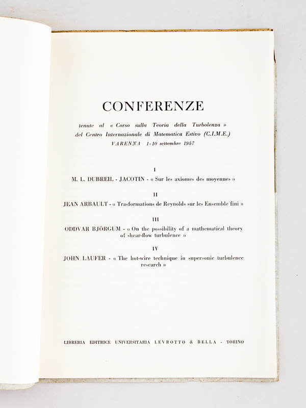 Conferenze tenute al 'Corso sulla Teoria della Turbolenza' del Centro Internazionale di Matematica Estivo (C.I.M.E.) Varenna 1-10 settembre 1957. M. L. Dubreil-Jacotin : 'Sur les axiomes des moyennes' ; Jean Arbault : Transformations de Reynolds sur les E - Auteur: DUBREIL-JACOTIN, M. ; ARBAULT, Jean ; BJORGUM, Oddvar ; LAUFER, John - Année d'édition: 1957